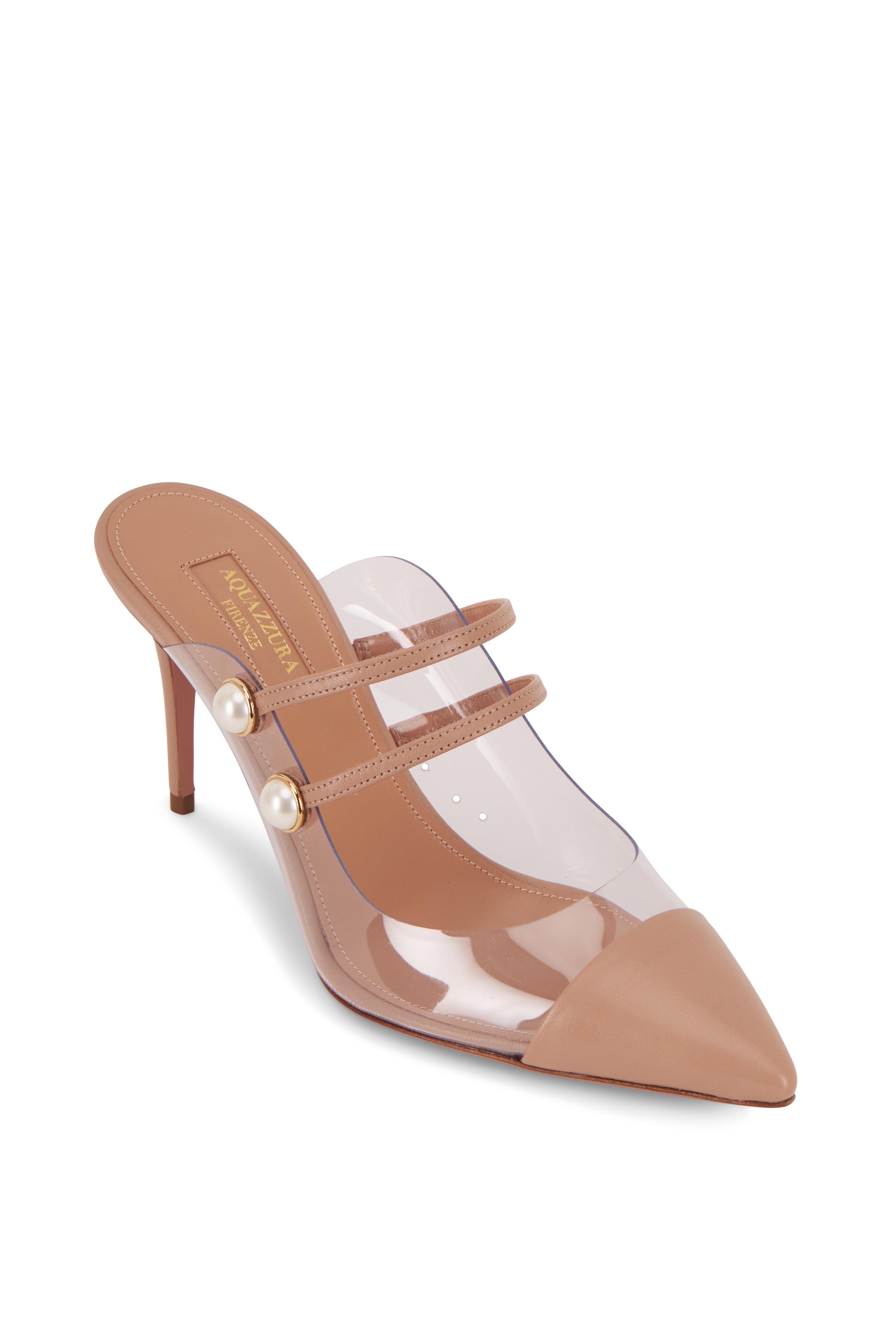 Nappa leather and pvc upper. Pointed toe. Dual straps with pearl detail. Leather lining and insole. Self covered heel. Leather sole. Made in Italy. Heel measurement: 85mm (3.3").