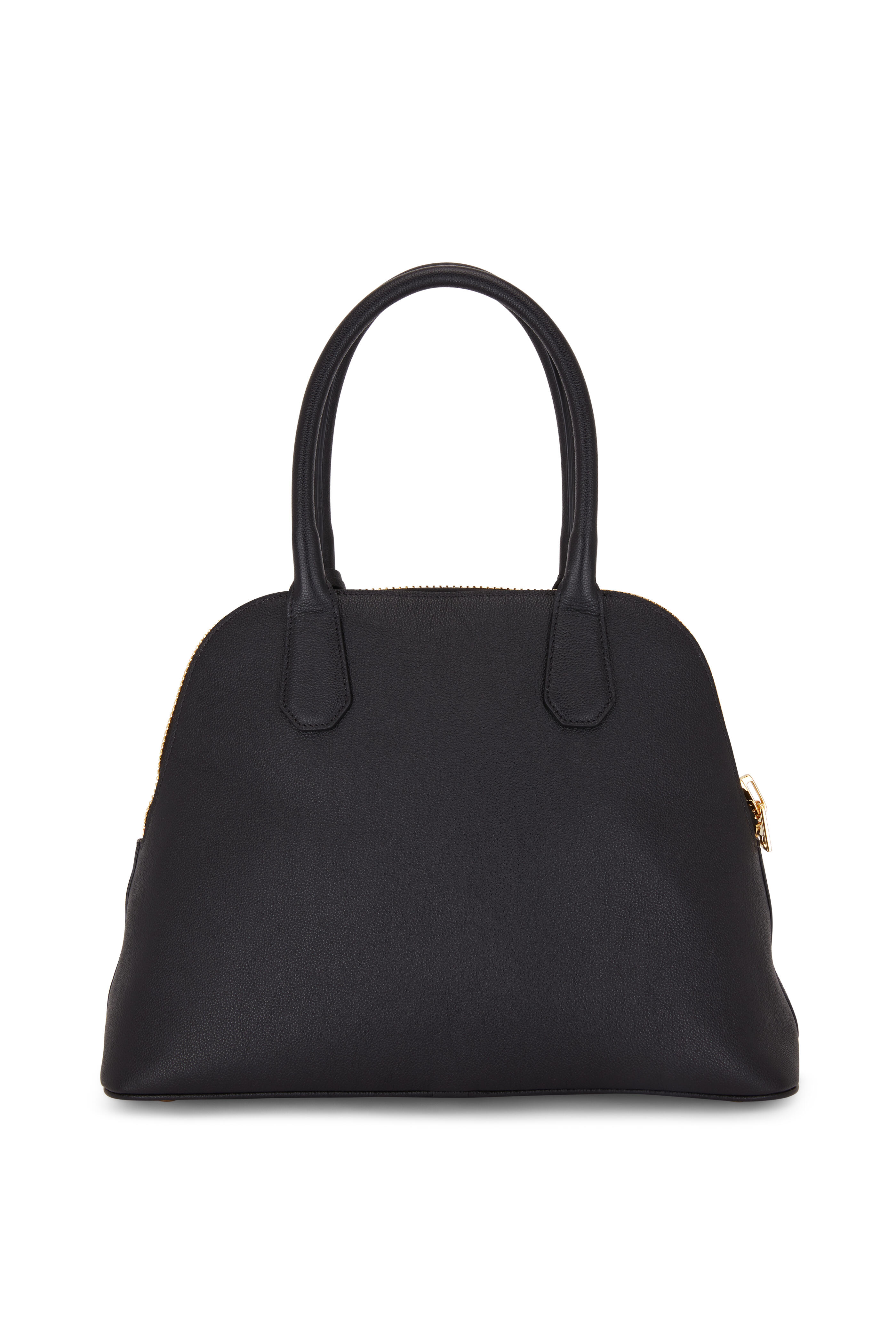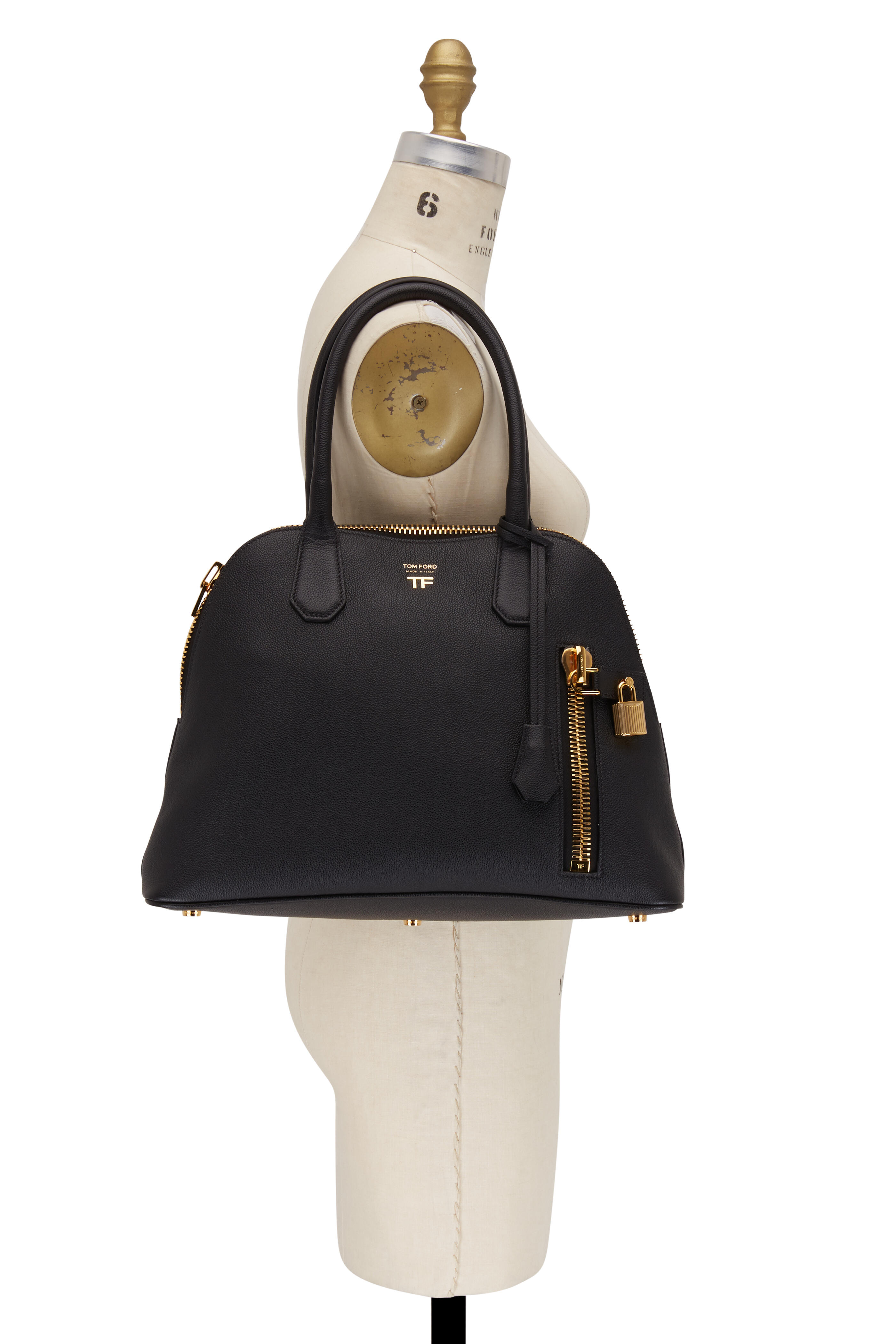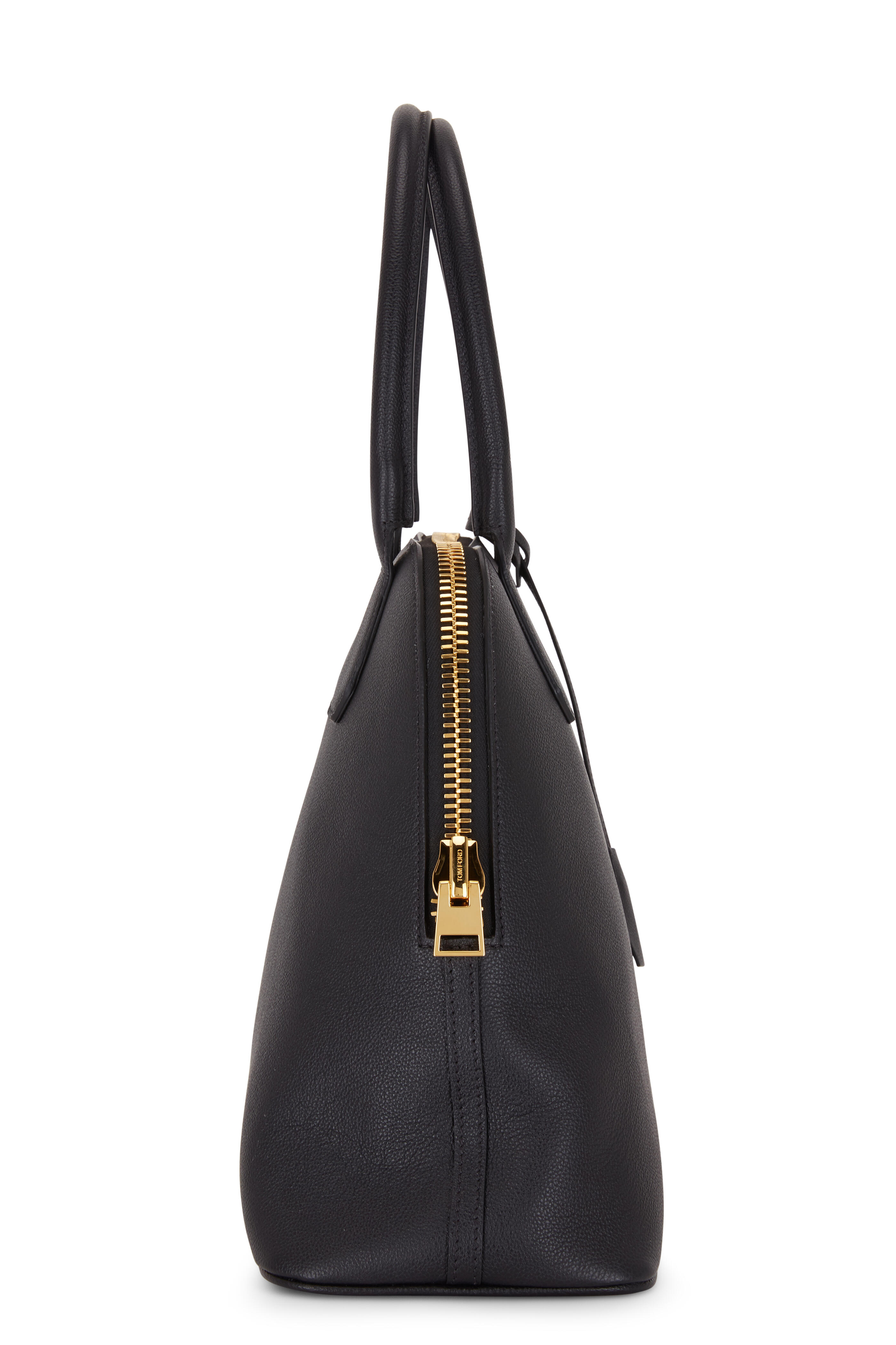 Buffalo grain leather. Padded dual top handles. Top zip closure. Front zip pocket with pad-lock closure. Two interior open pockets. Lined in cotton canvas. Protective metal feet. Made in Italy. Width: 15". Height: 10". Depth: 5". Handle drop: 6".