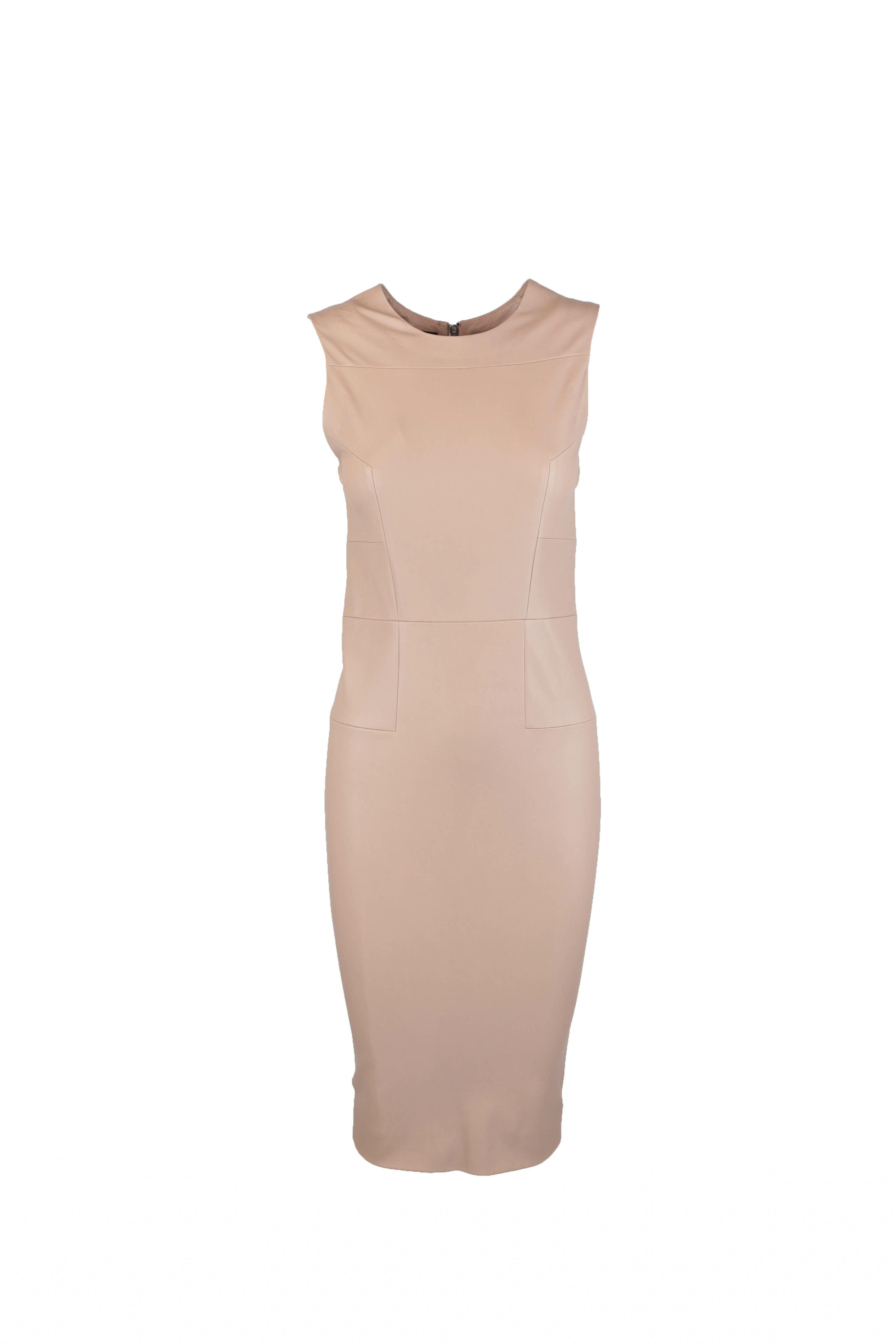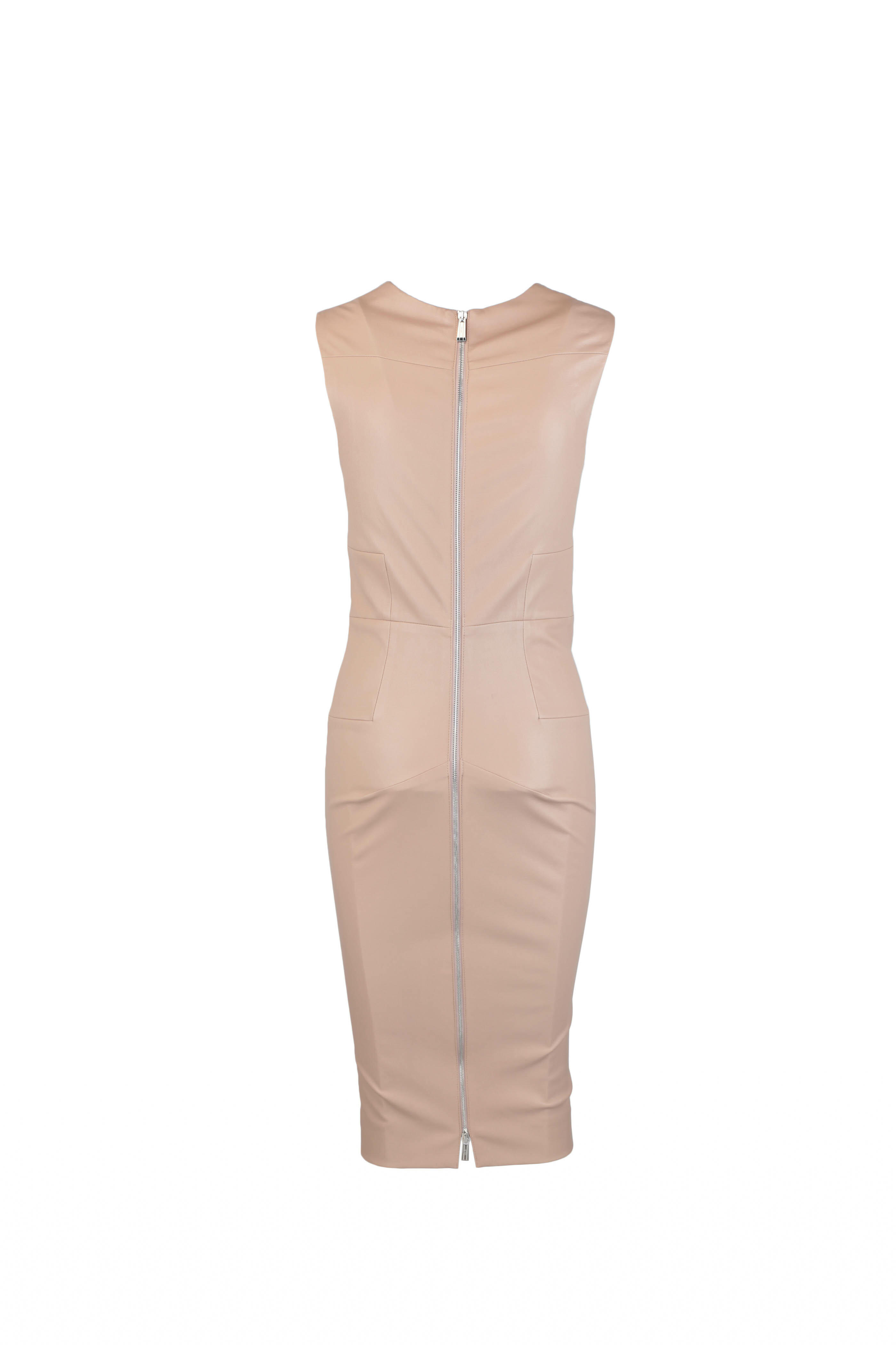 Specialist clean. Round neckline. Center back full length two-way zip closure. Made in Italy. Shoulder to hem: 43". 100% lambskin leather.