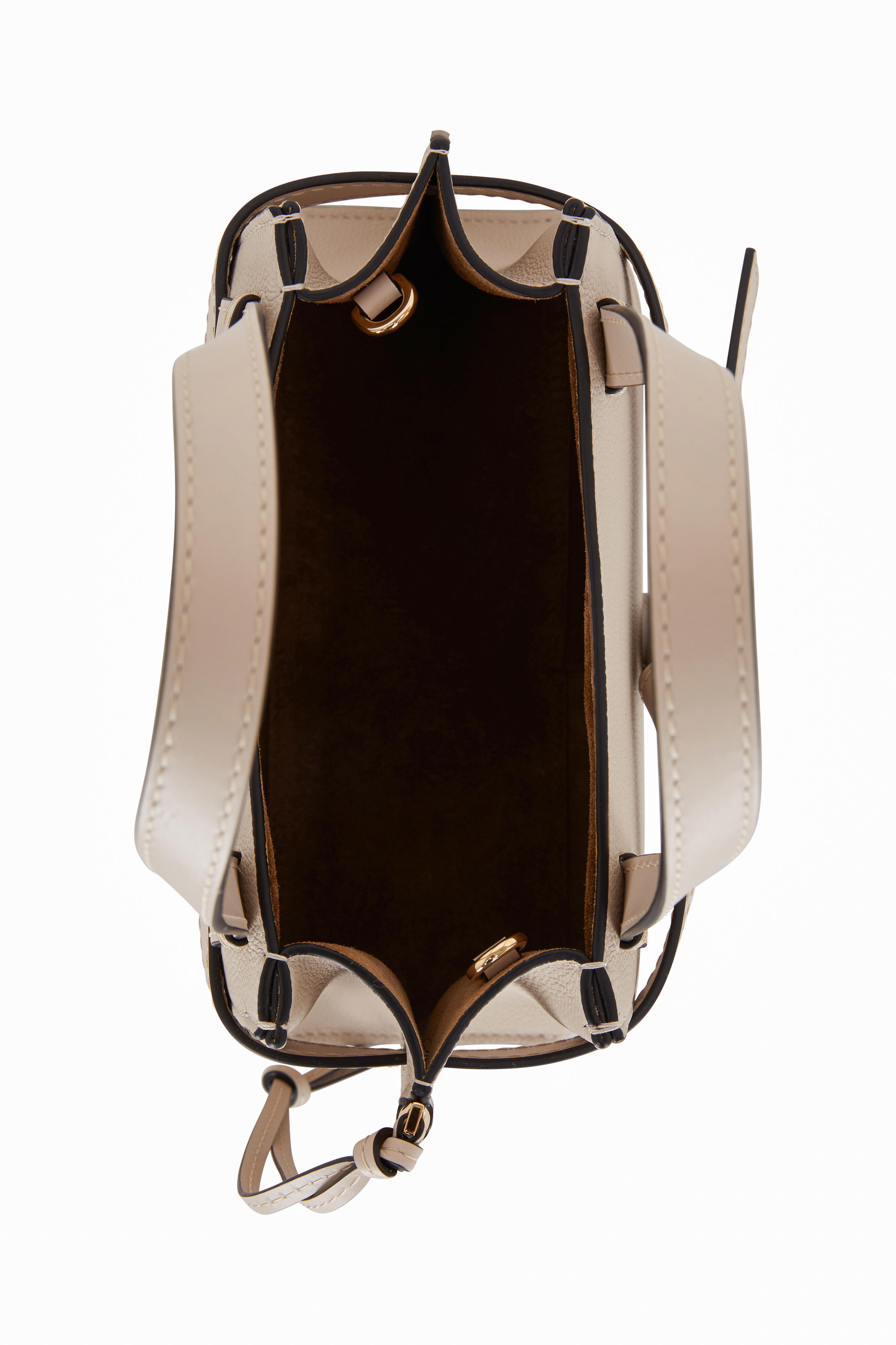Grained calfskin leather. Dual flat top handles. Detachable shoulder strap. Open top. Signature knotted leather detailing. Interior one snap and one open pocket. Lined in suede. Made in Spain. Width: 10". Height: 7". Depth: 4". Handle drop: 5". Detachable and adjustable strap drop: 18".