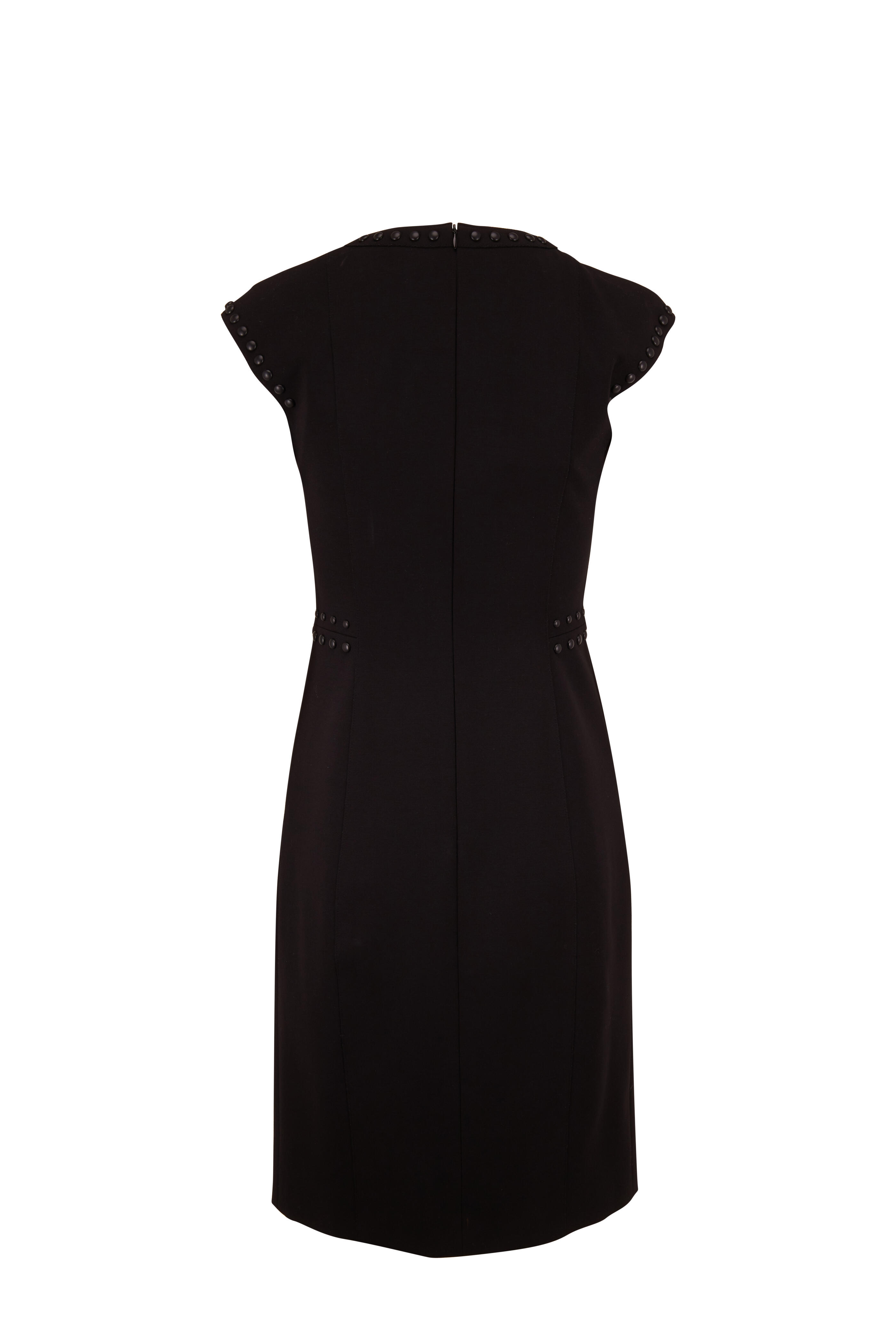 Round neckline. Concealed back zip closure. Cap sleeves. Tonal stud detailing. Straight hem. Imported. 39" shoulder to hem. 69% viscose, 25% polyamide, 6% elastane; unlined. Dry clean.
