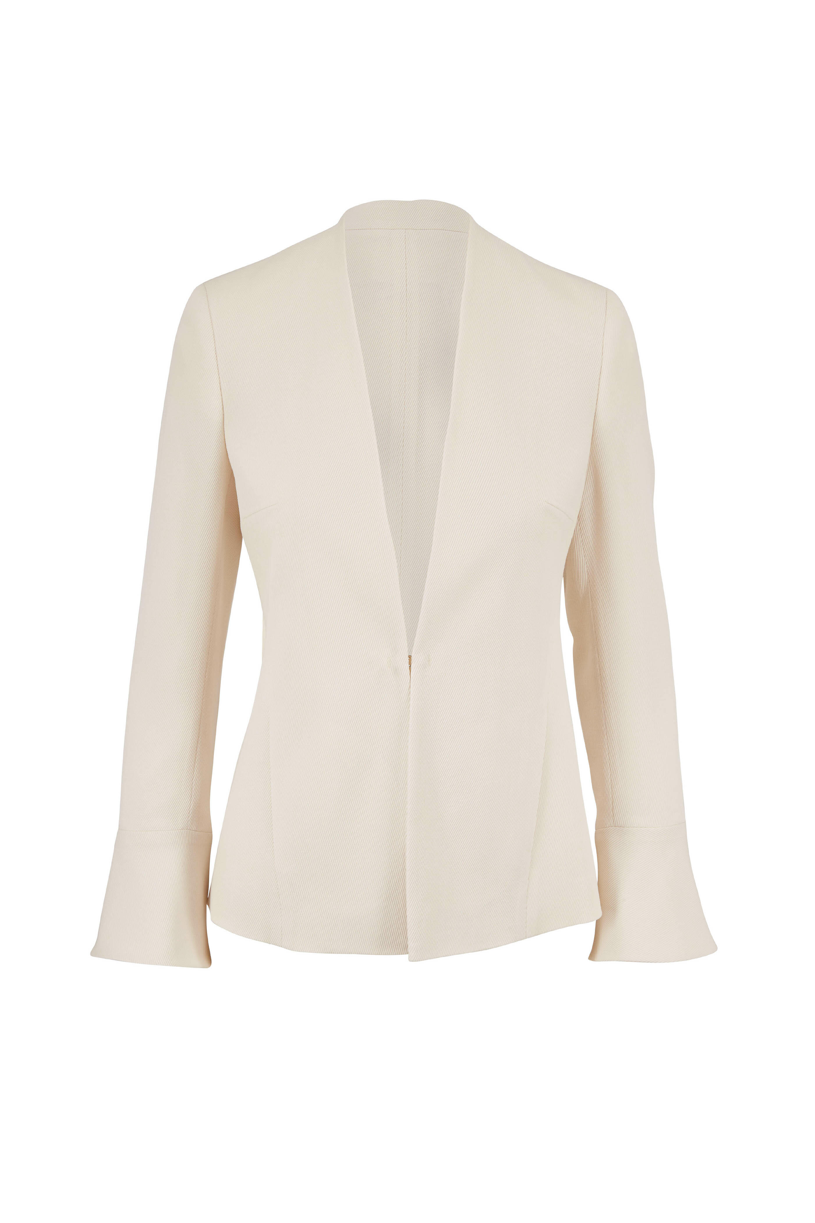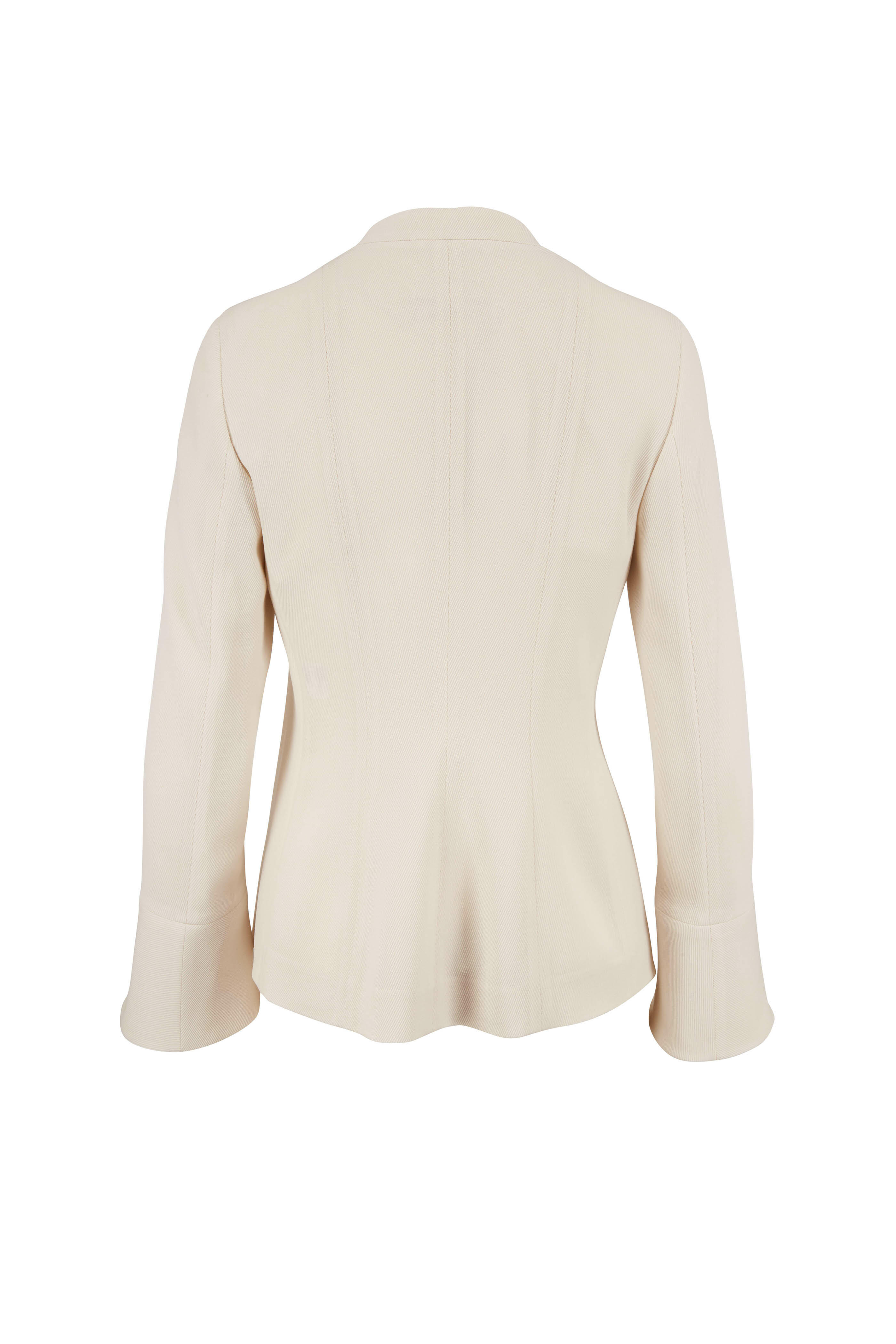 Collarless. Single hook and eye closure. Bell cuffs. Front seam pockets. Imported with Italian fabric. 100% wool. Dry clean.