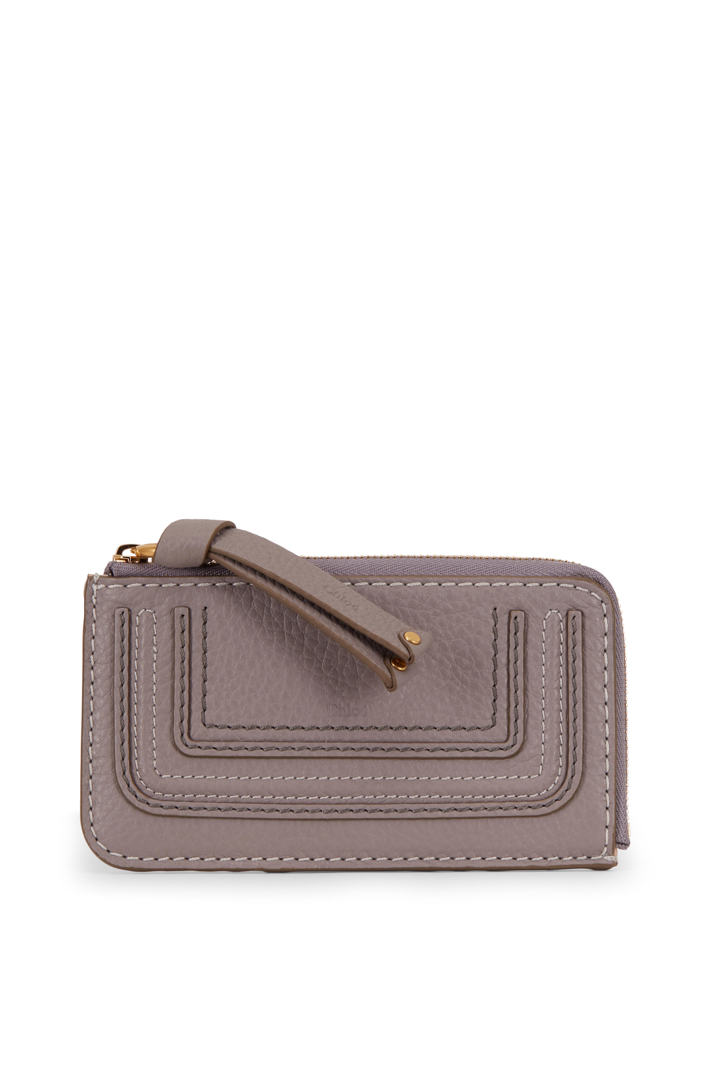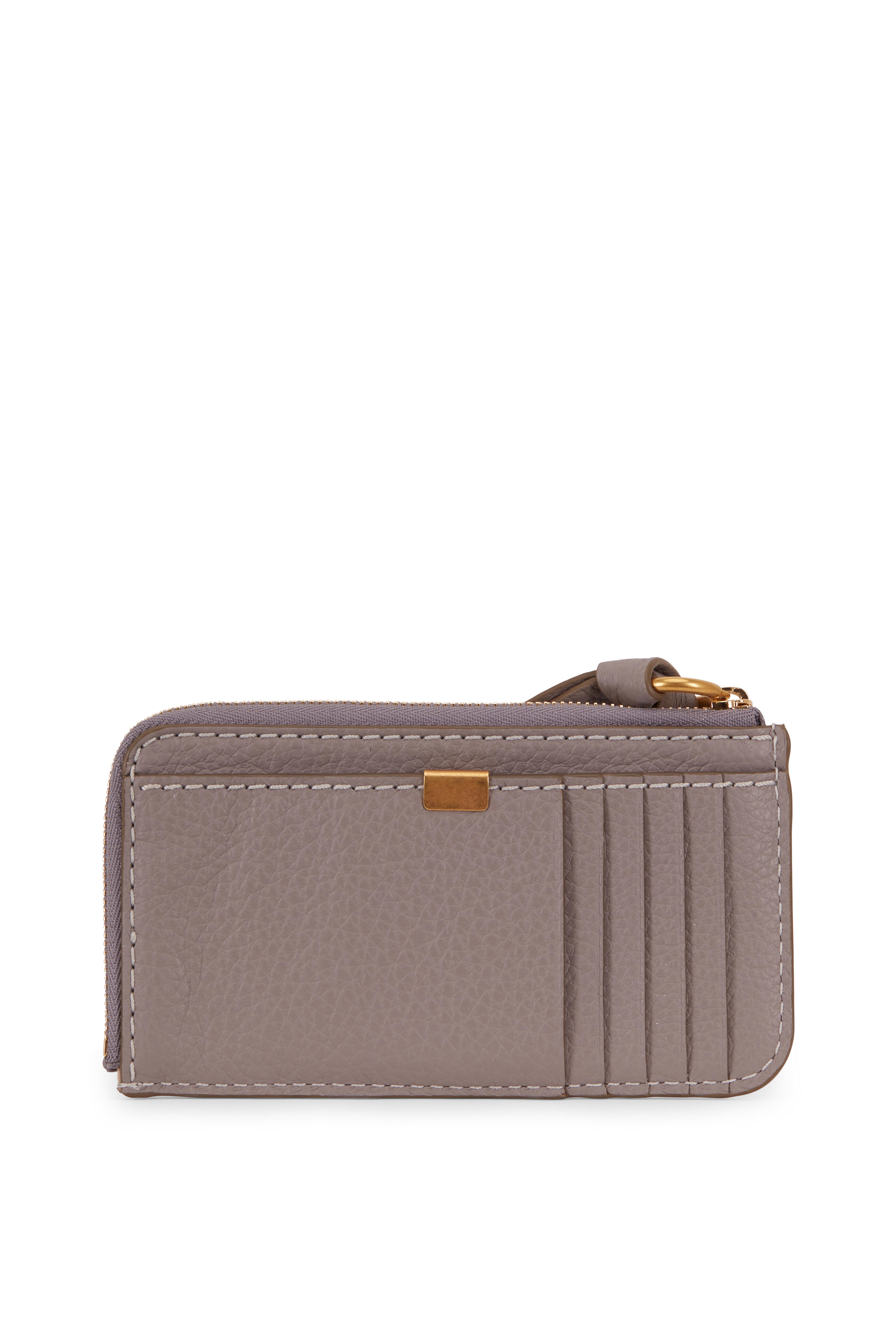 Grained calfskin leather. Top zip-around closure. Contrast top-stitching. Exterior slip pocket; five card slots. Lined in fabric. Made in Spain. Width: 6". Height: 3 ½".