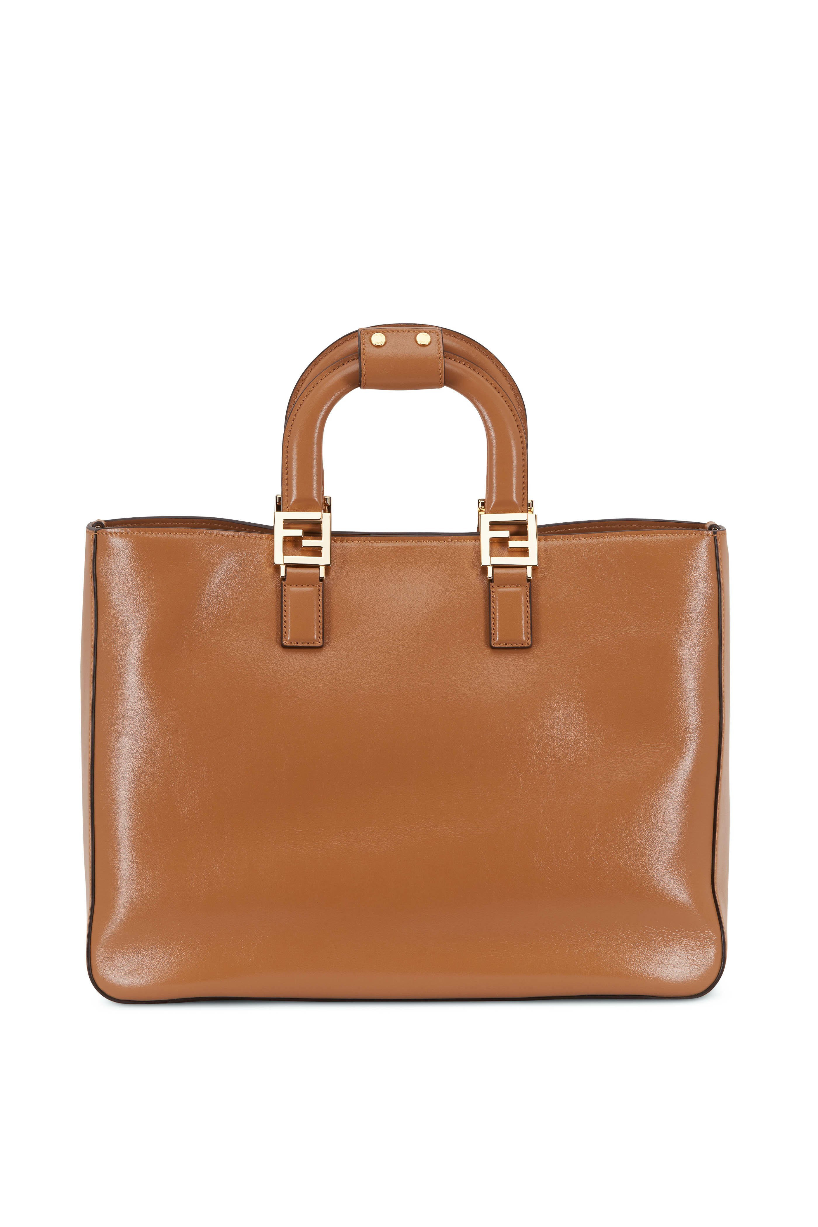 Glossy vitello leather. Dual top handles with gold-tone logo detail. Detachable shoulder strap. Center snap closure. One interior zip and two open pockets. Lined in suede. Protective metal feet. Made in Italy. Width: 14". Height: 11". Depth: 5". Handle drop: 4". Detachable strap drop: 12".