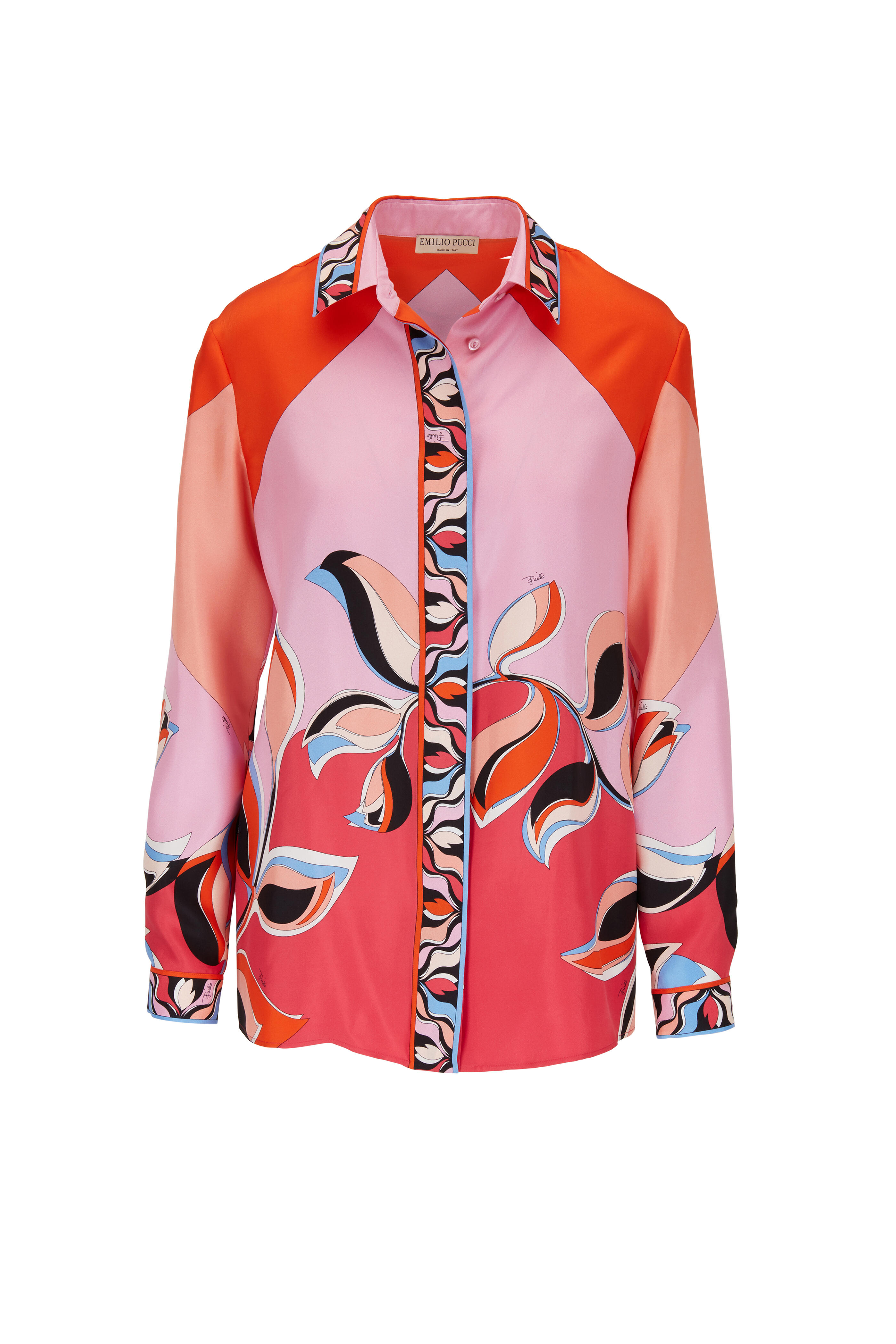 Spread collar. Concealed button placket. Single button squared cuffs. Made in Italy. 100% silk. Dry clean.
