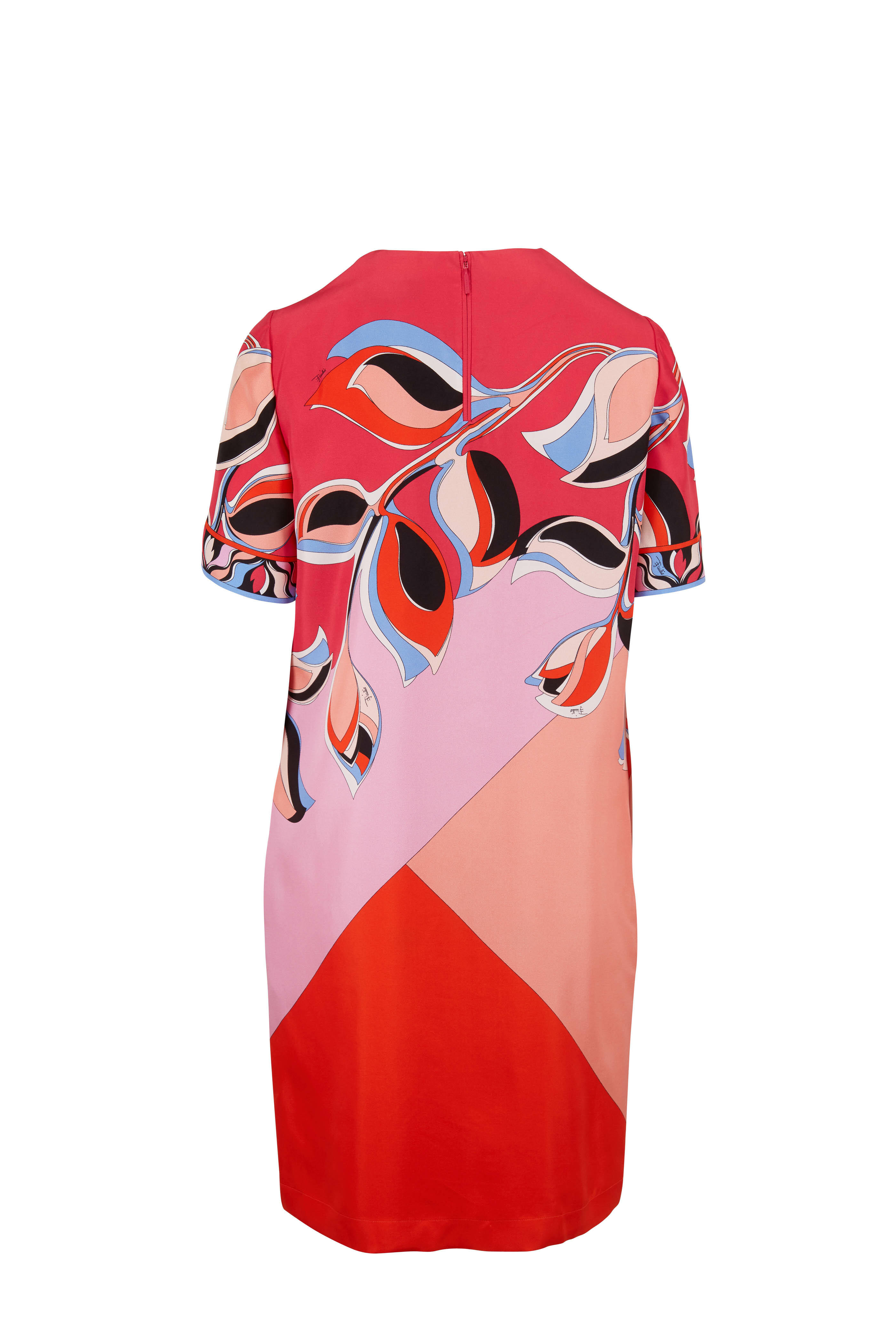 Pink & Orange Print Silk Short Sleeve Shift Dress