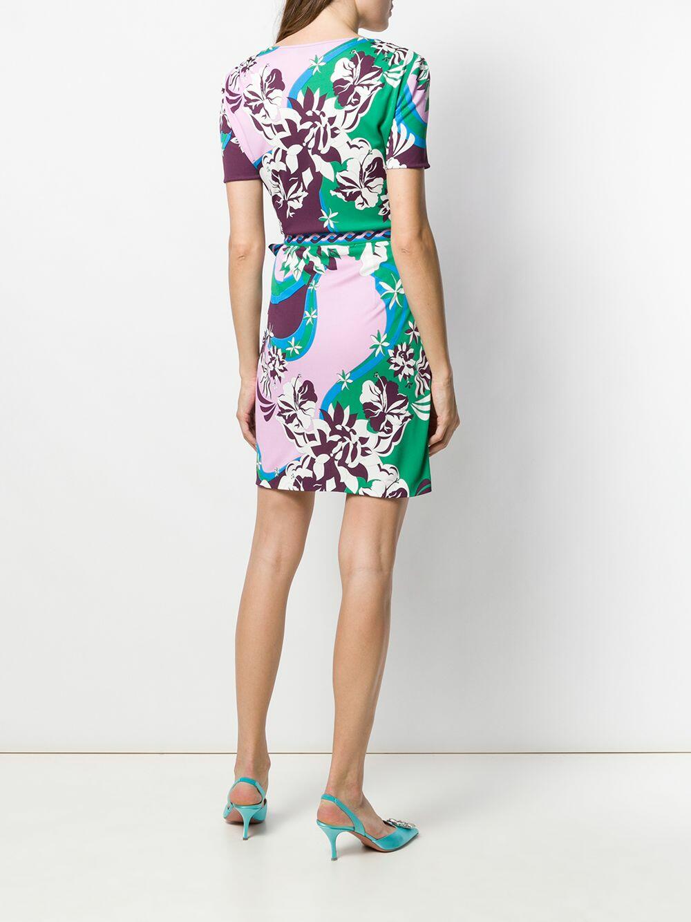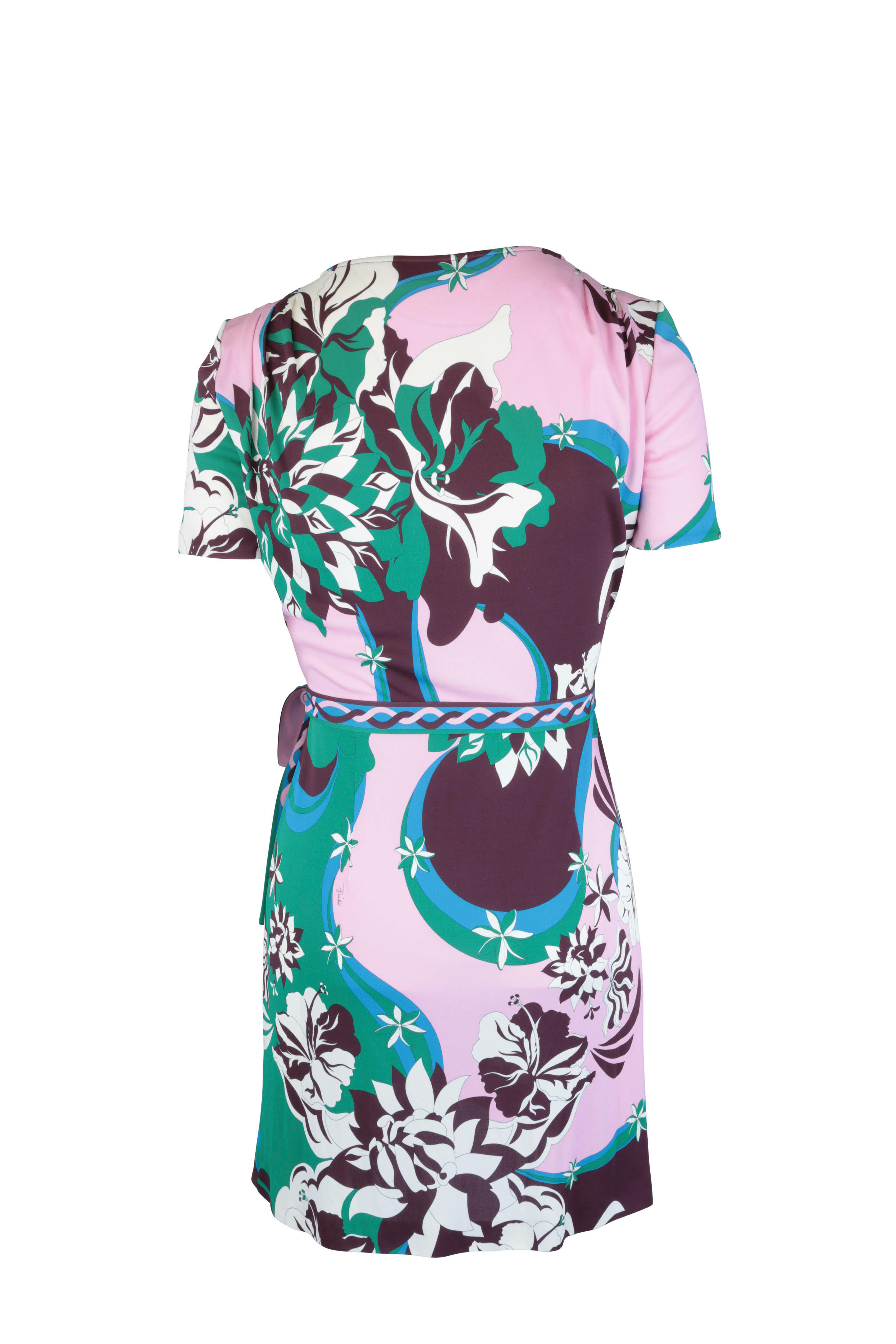 Green & Pink Floral Print Short Sleeve Wrap Dress