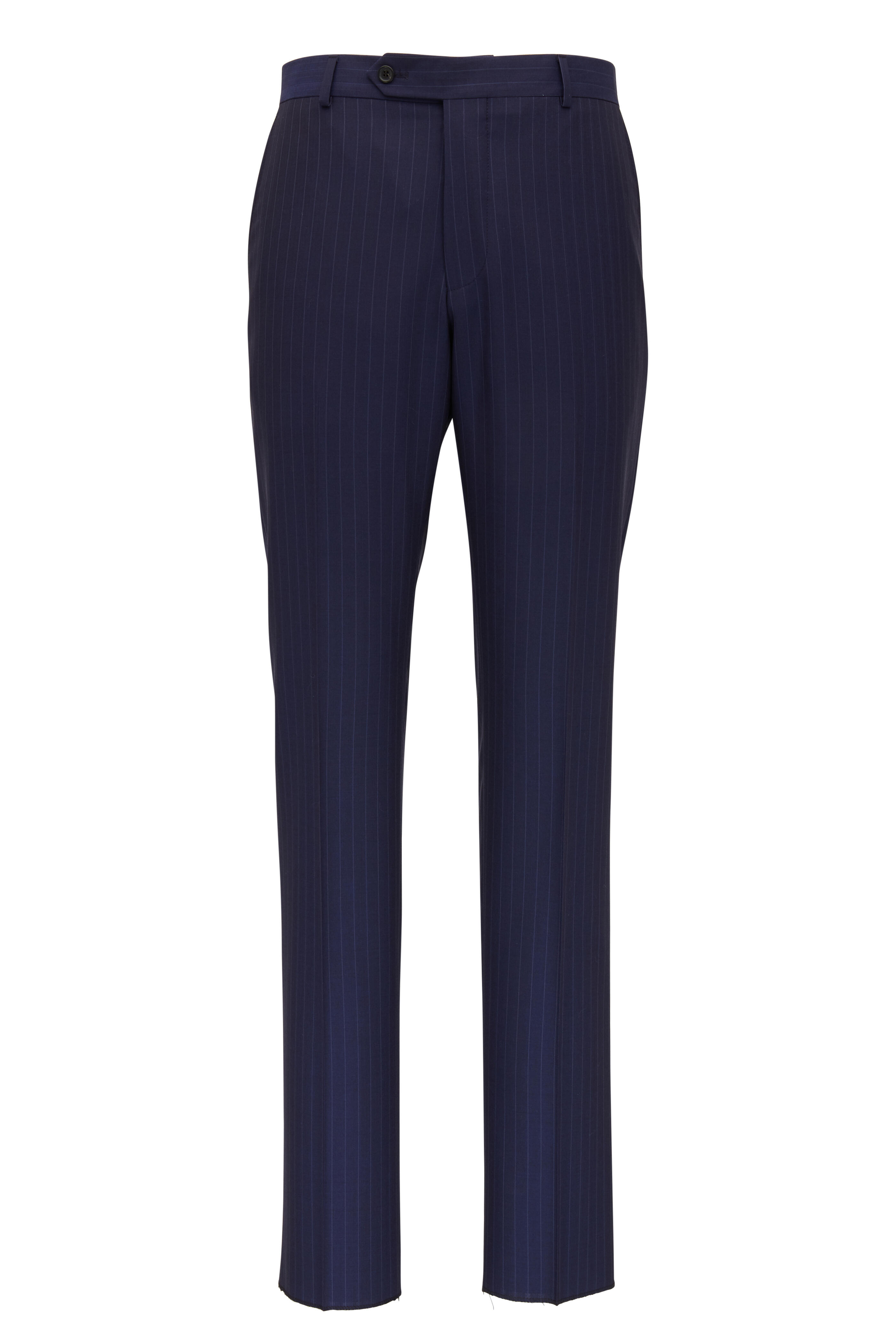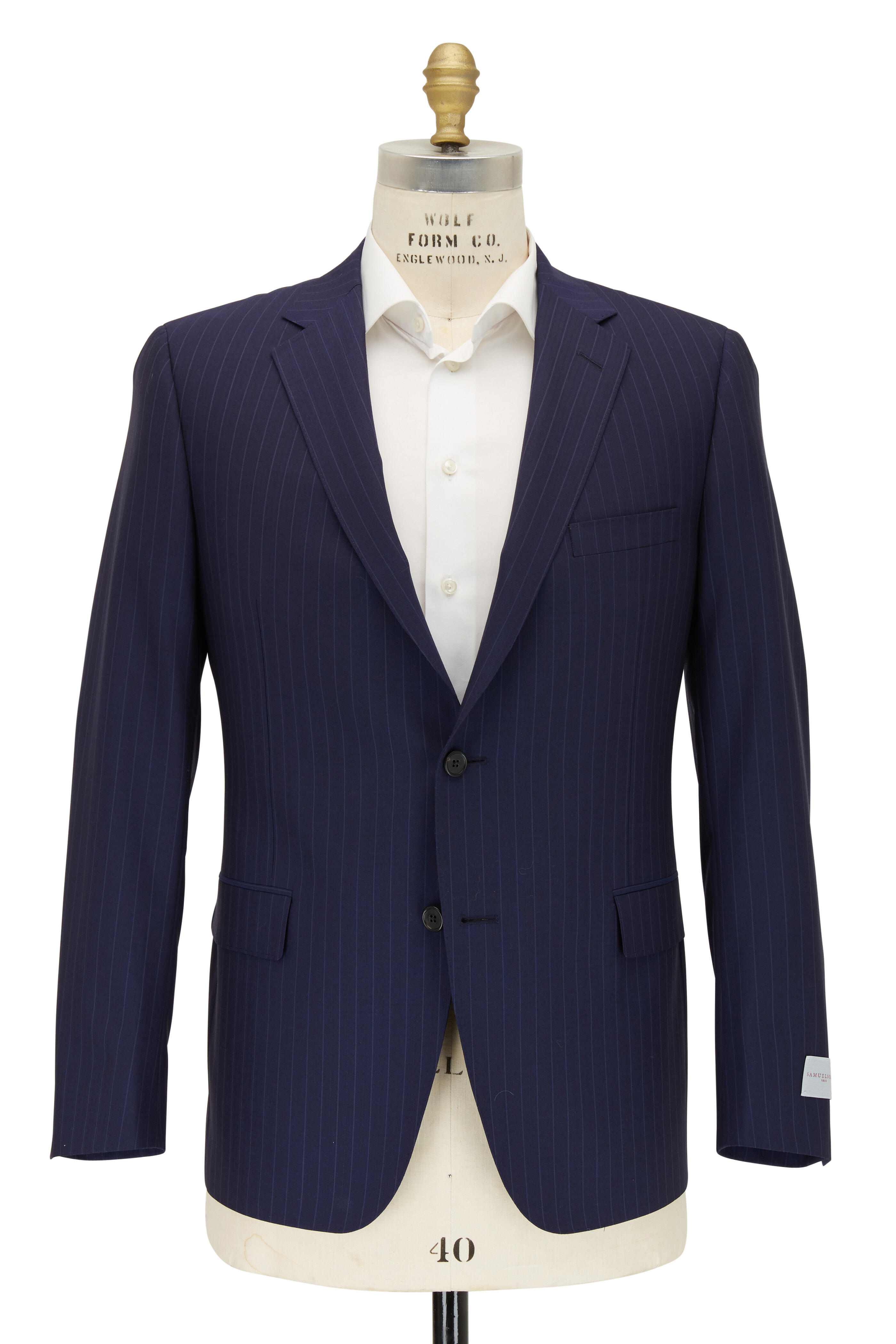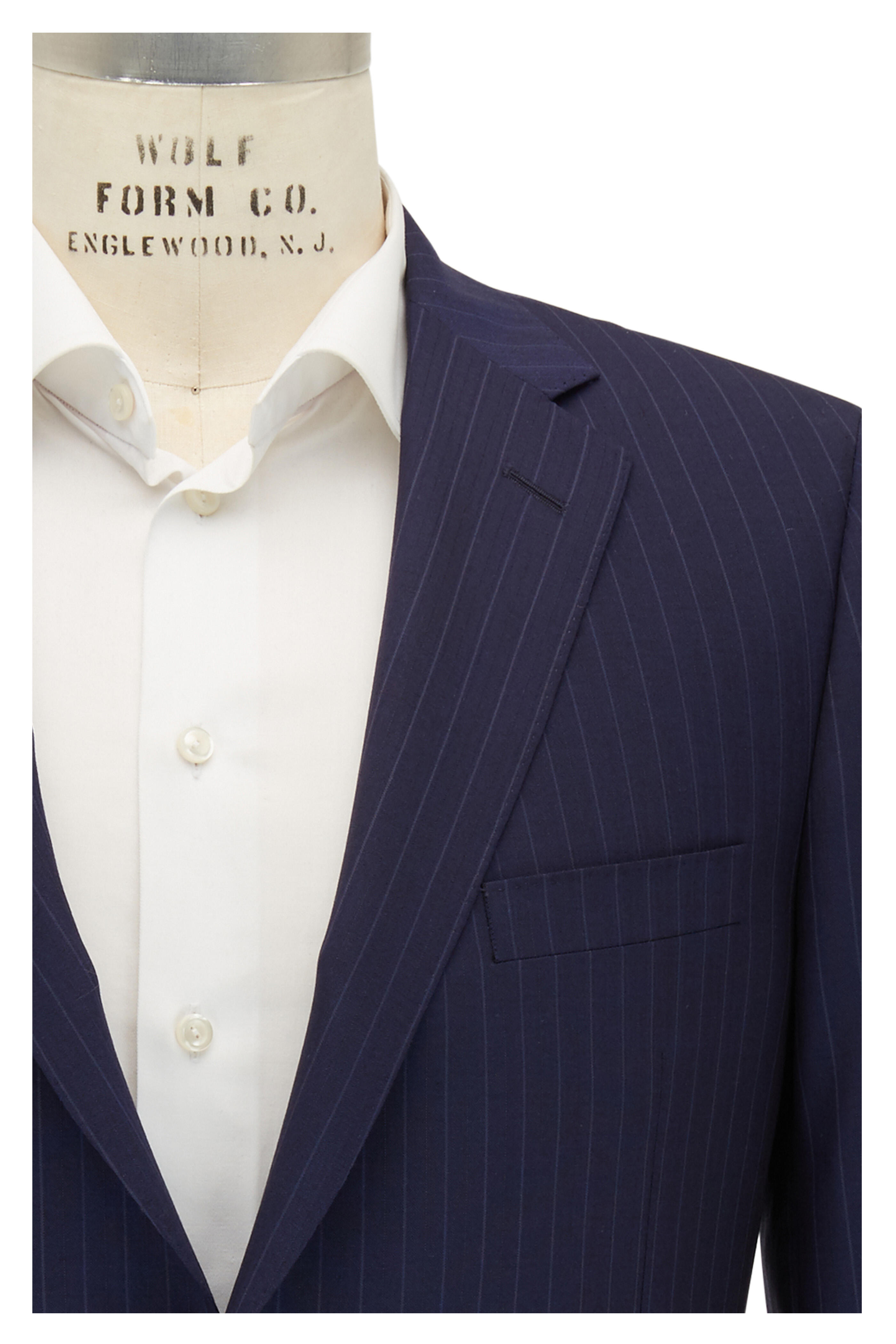 Imported. Jacket: Fully lined. Notched lapels. Front two button closure. Lower flap pockets; chest welt pocket. Double vent. Pant: Banded waist; belt loops. Front slip pockets; back besom pockets. Unfinished hem. 100% wool; lined. Dry clean.