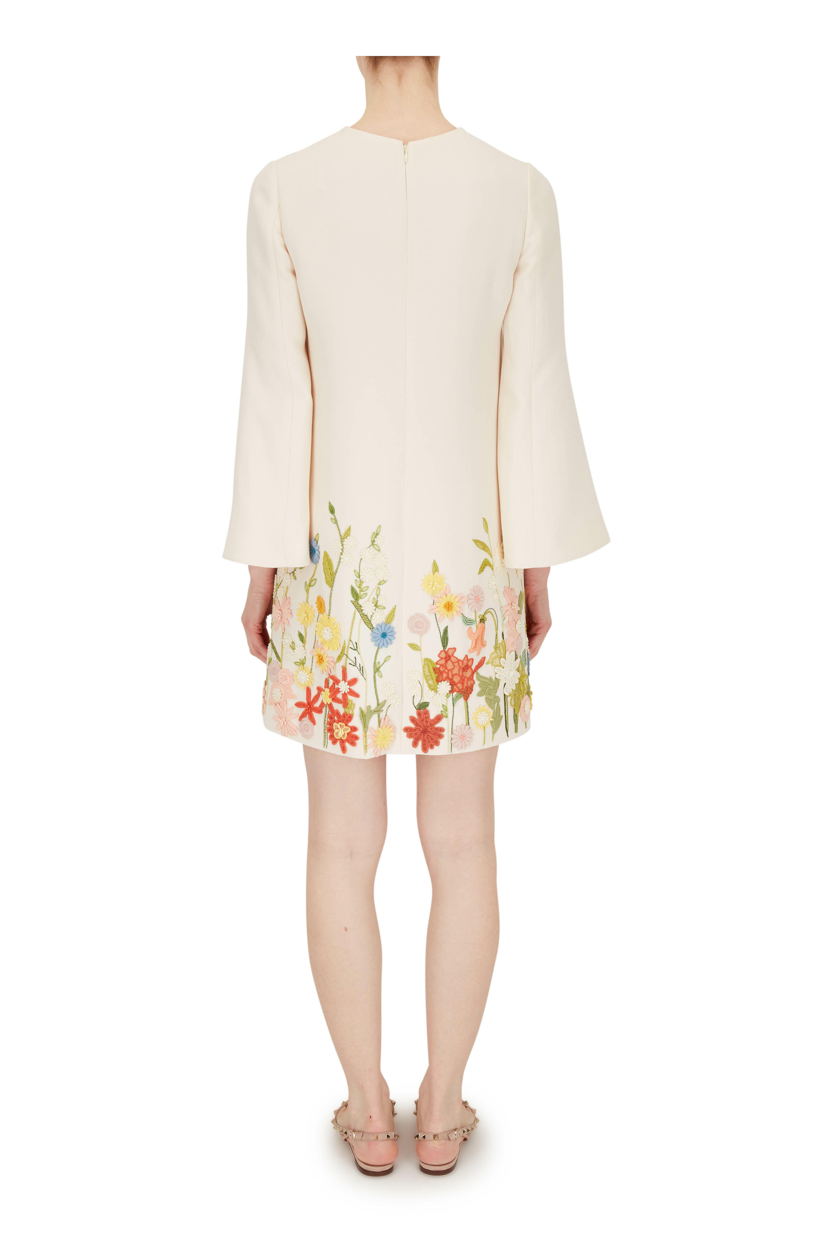 Jewel neckline. Concealed back zip. Long, bell sleeves. Floral embroidery detailing. Made in Italy. 35" shoulder to hem. 65% virgin wool, 35% silk; ; fully lined. Dry clean.