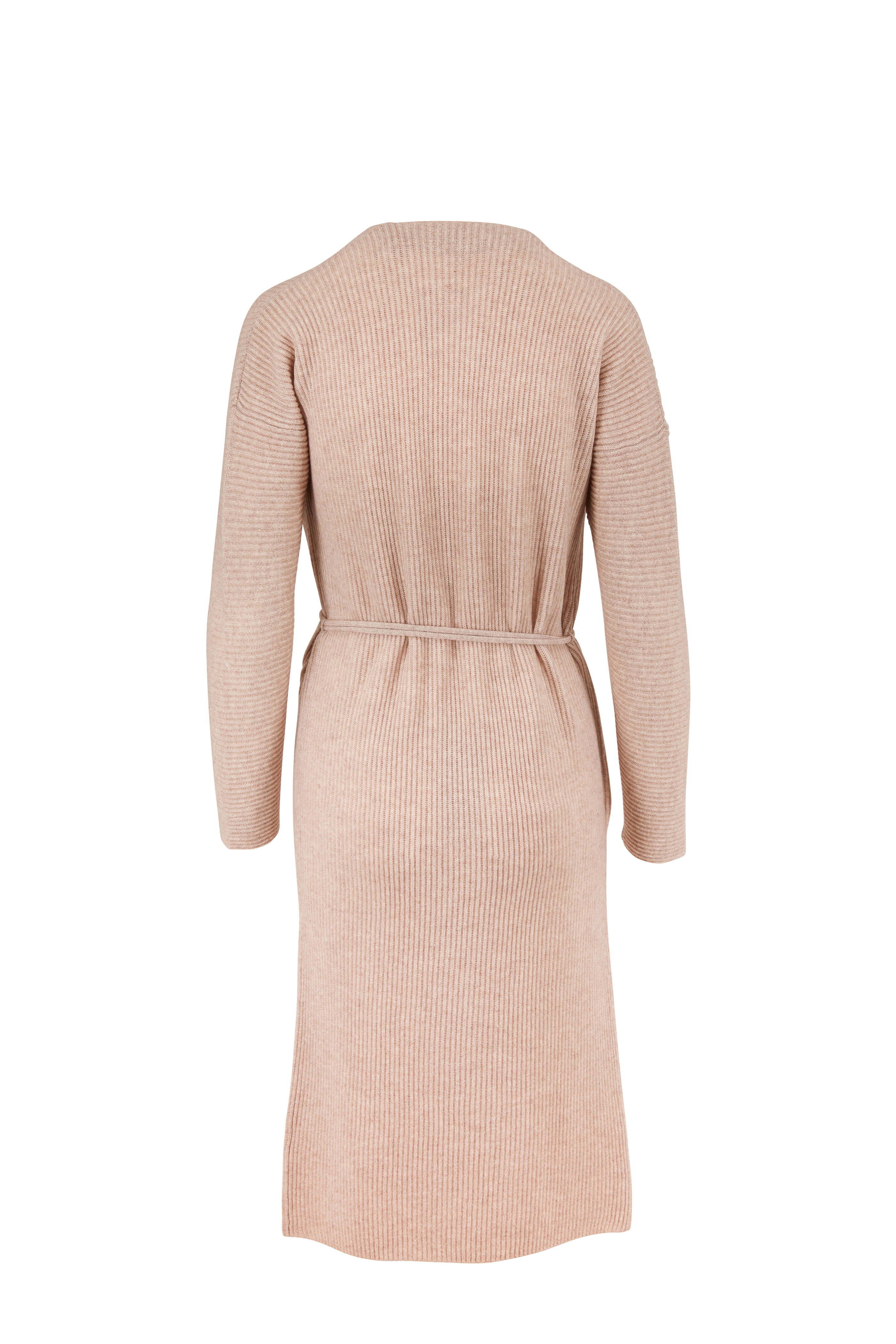 Draped v-neckline. Slip over style; self tie. Imported. 45" shoulder to hem. 72% wool, 28% cashmere. Hand wash.
