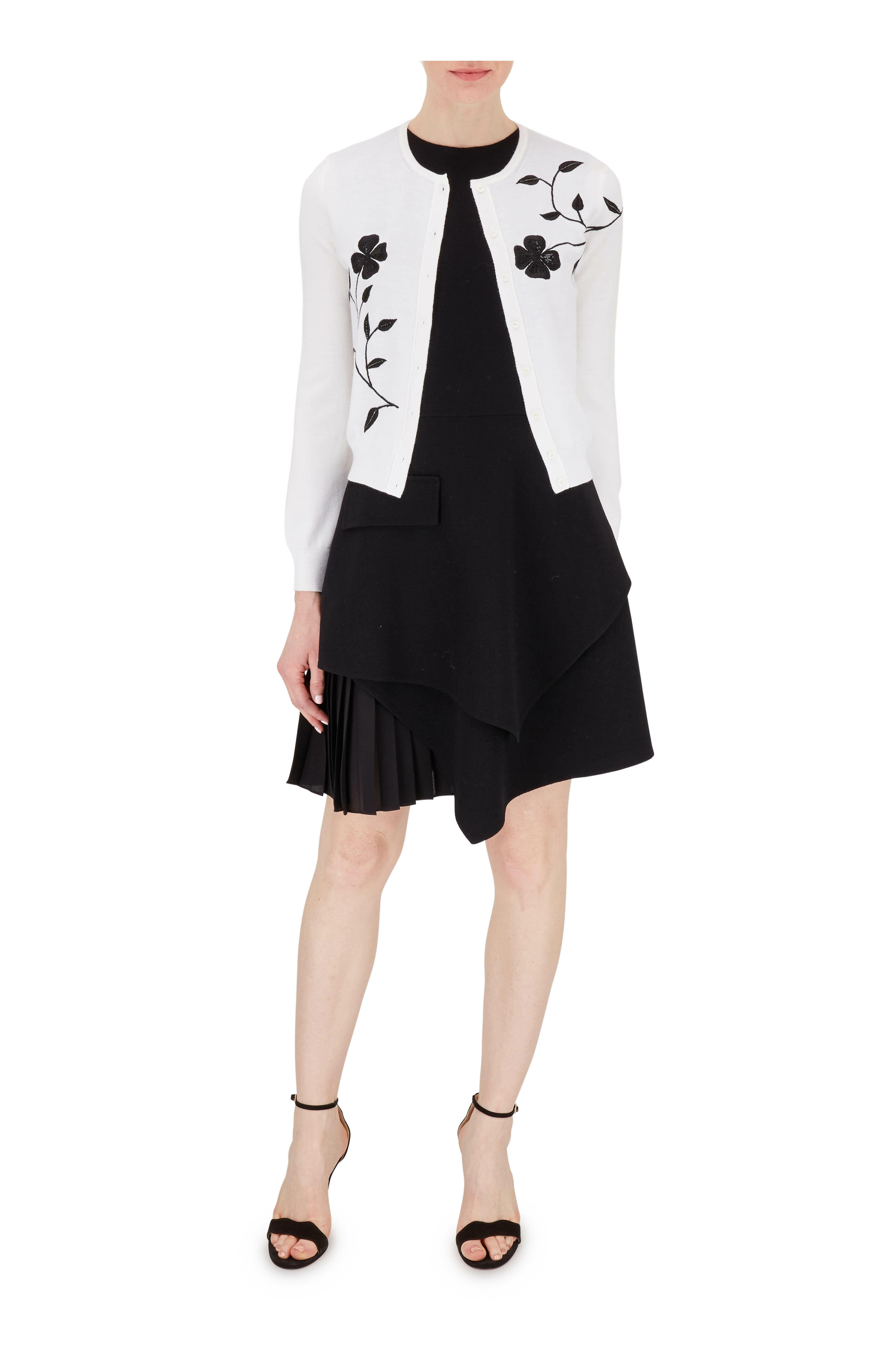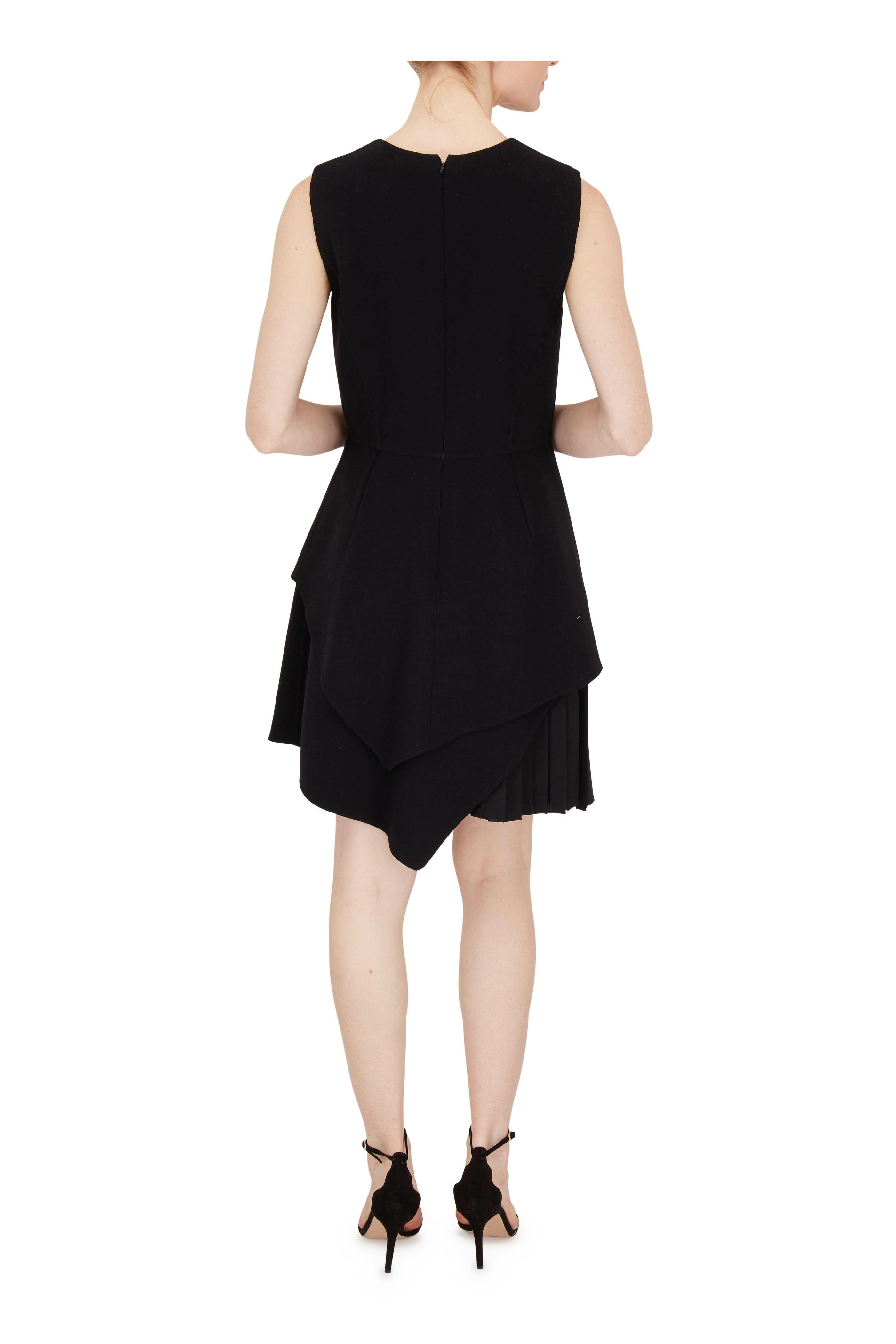Round neckline. Concealed back zip closure. Seamed waist. Faux pocket detail. Asymmetric pleated hem. Made in Italy. 37" longest point. 95% virgin wool, 4% nylon, 1% elastane; lining: 100% silk. Dry clean.