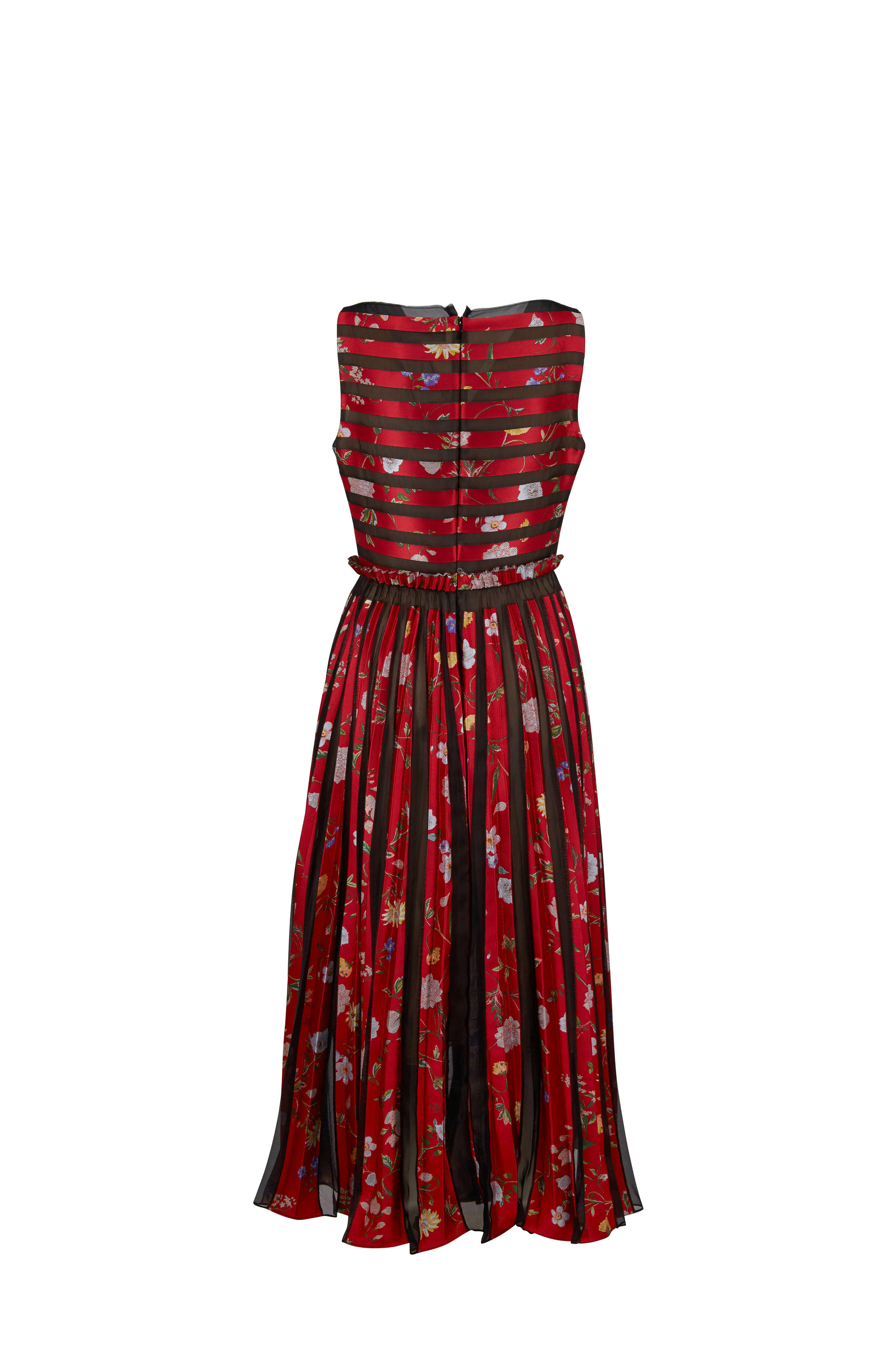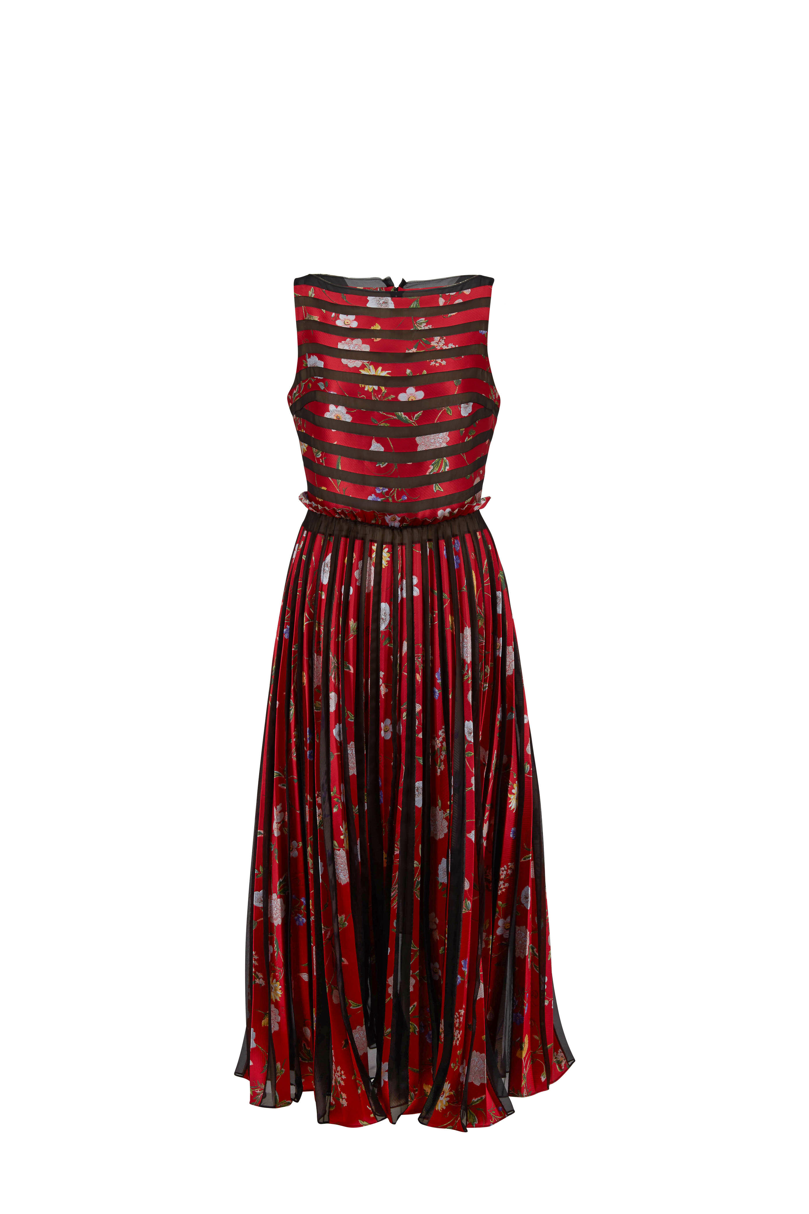 Bateau neckline. Concealed back zip closure. Illusion stripes. Gathered waist. Maxi pleated skirt. Made in Italy. 86% polyester, 14% silk; lining: 100% silk. Dry clean.