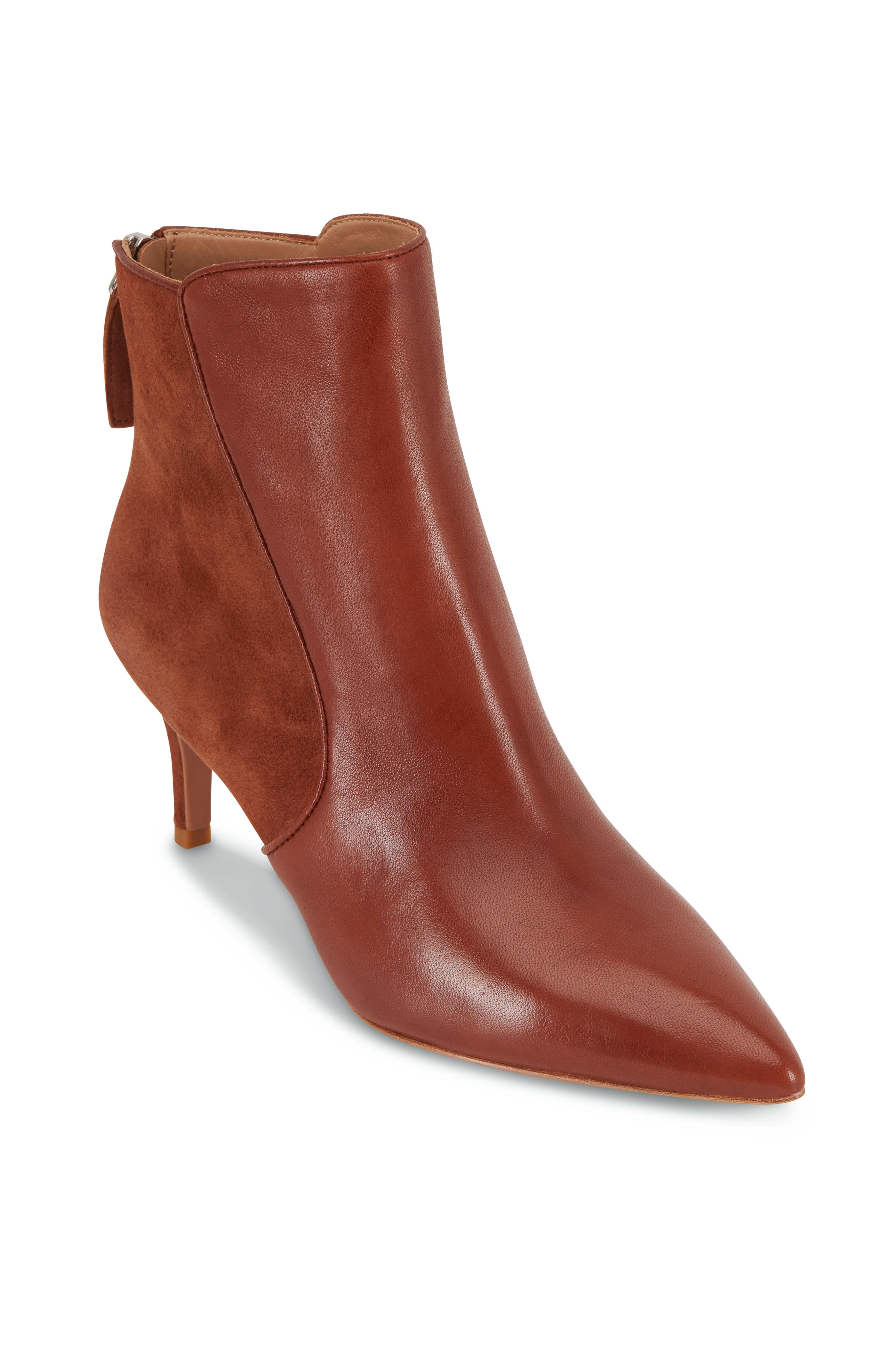 Suede and leather upper. Pointed toe. Side zip closure. Leather lining and insole. Self covered kitten heel. Leather sole. Imported. Heel measurement: 65mm (2 ½"). Shaft: 5 ½".