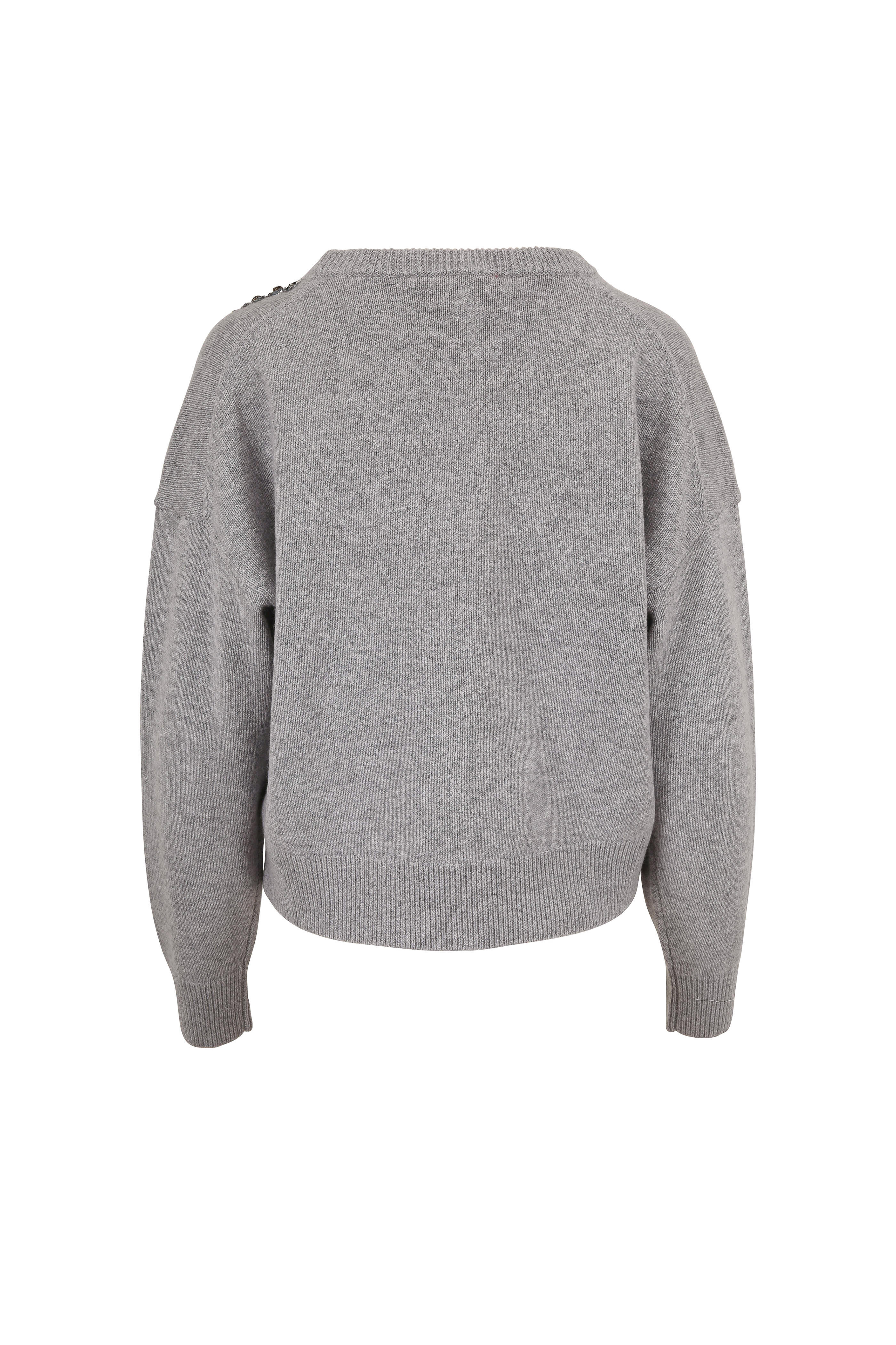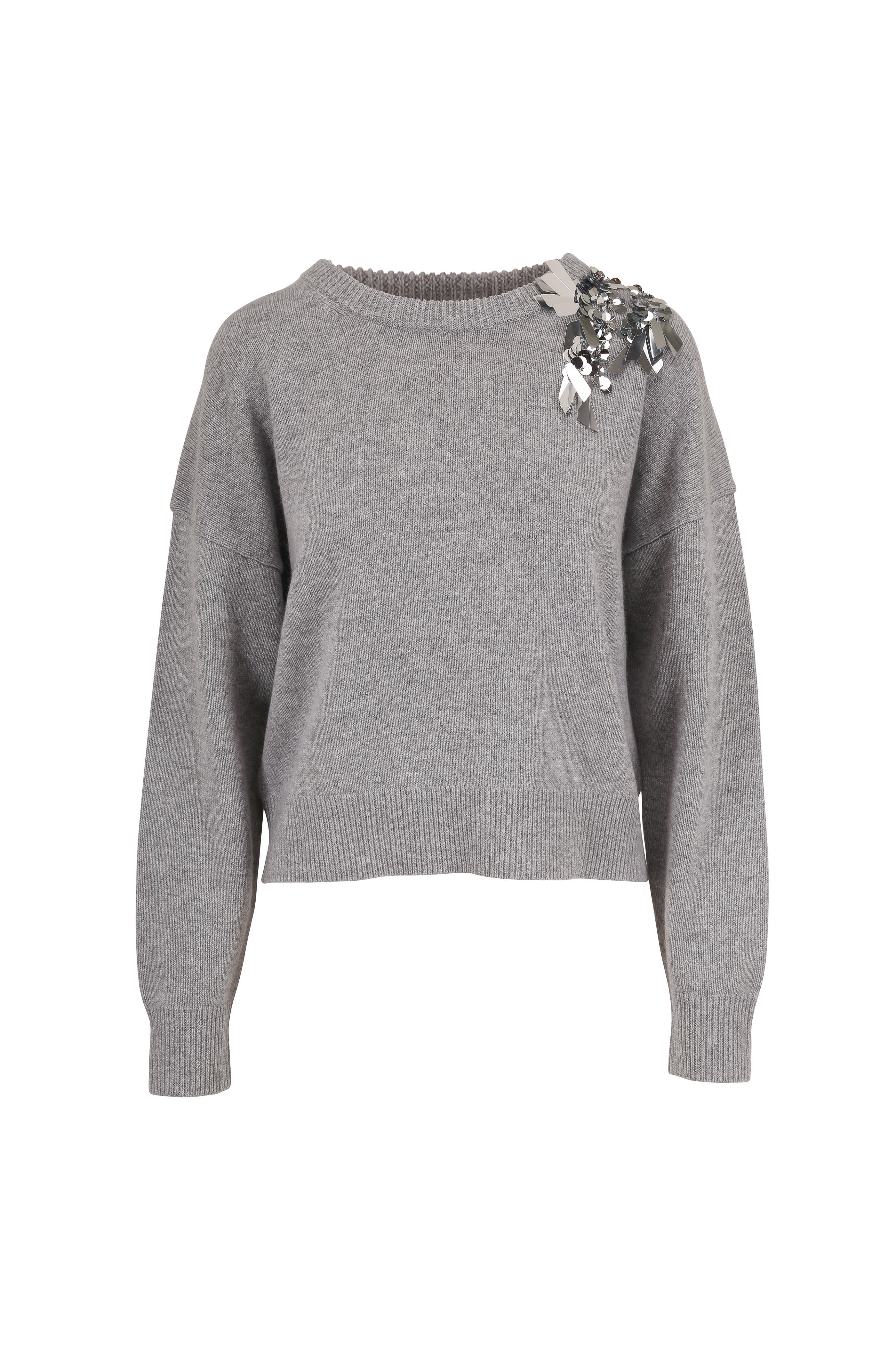 Round neckline. Crystal and ribbon embroidery at shoulder. Drop shoulders. Ribbed trim. Imported. 70% virgin wool, 30% cashmere. Machine wash.