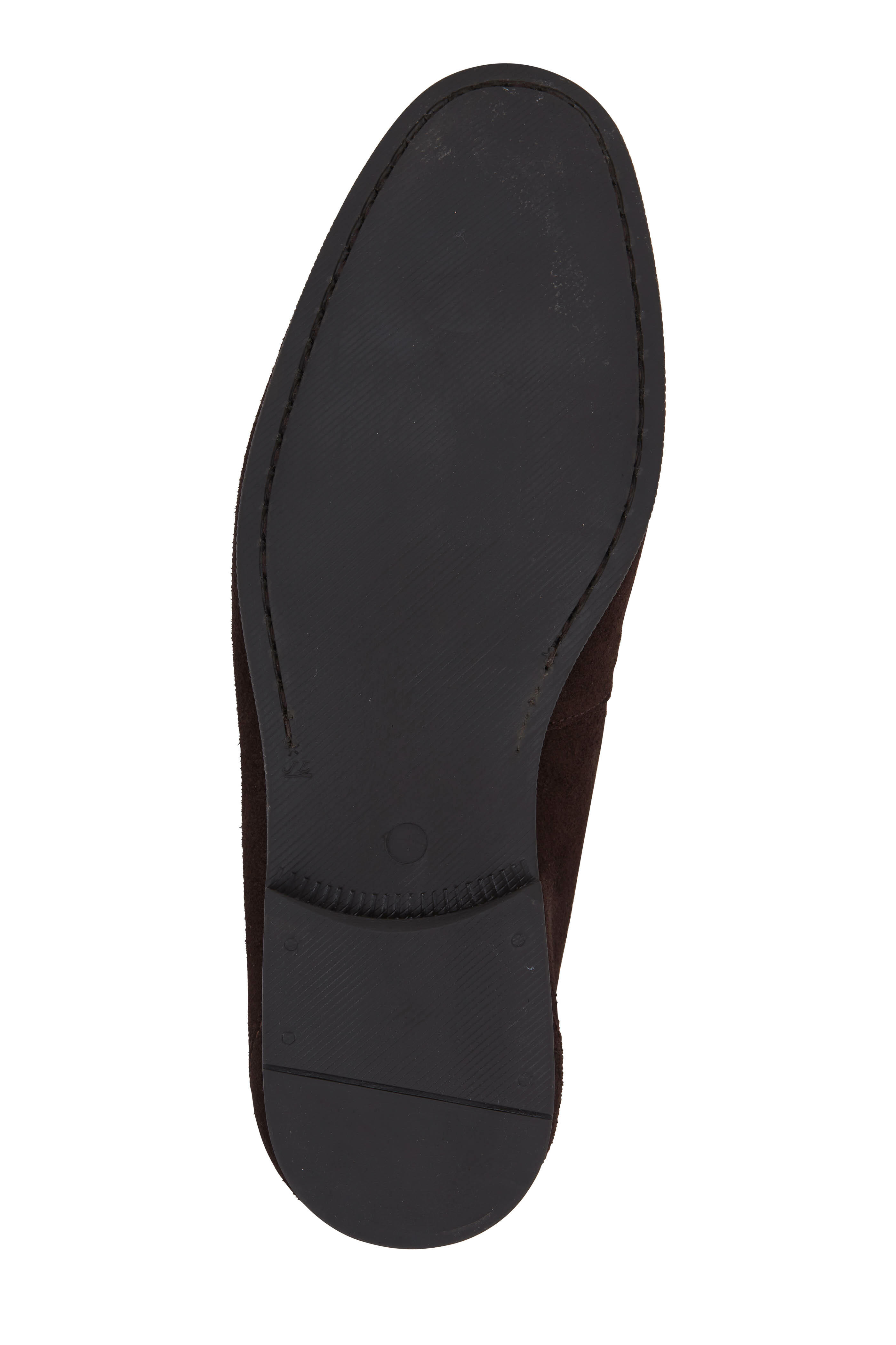 Suede upper. Moc toe. Penny strap across vamp. Lined in terry, cushioned insole. Rubber sole. Made in Portugal.