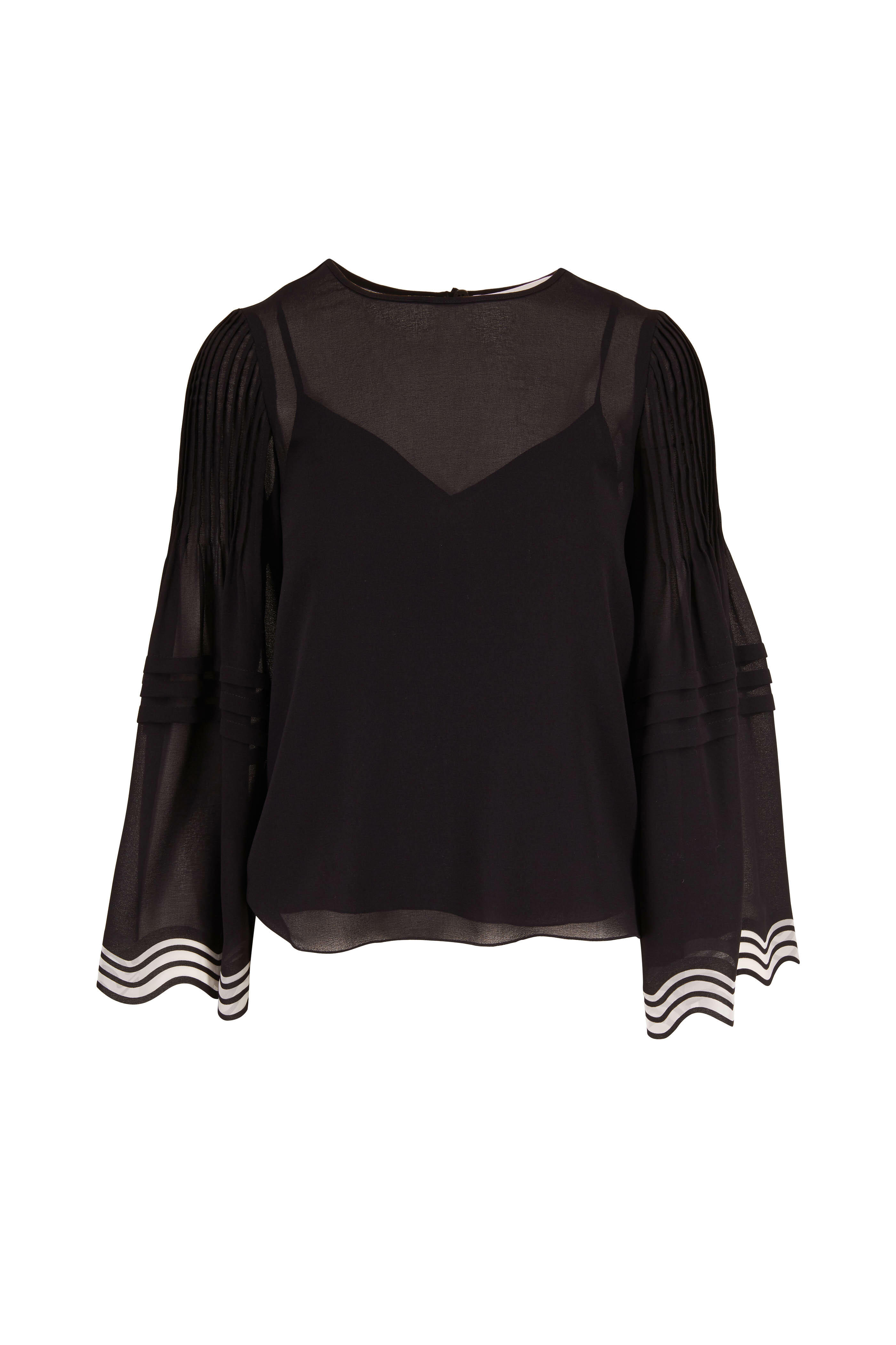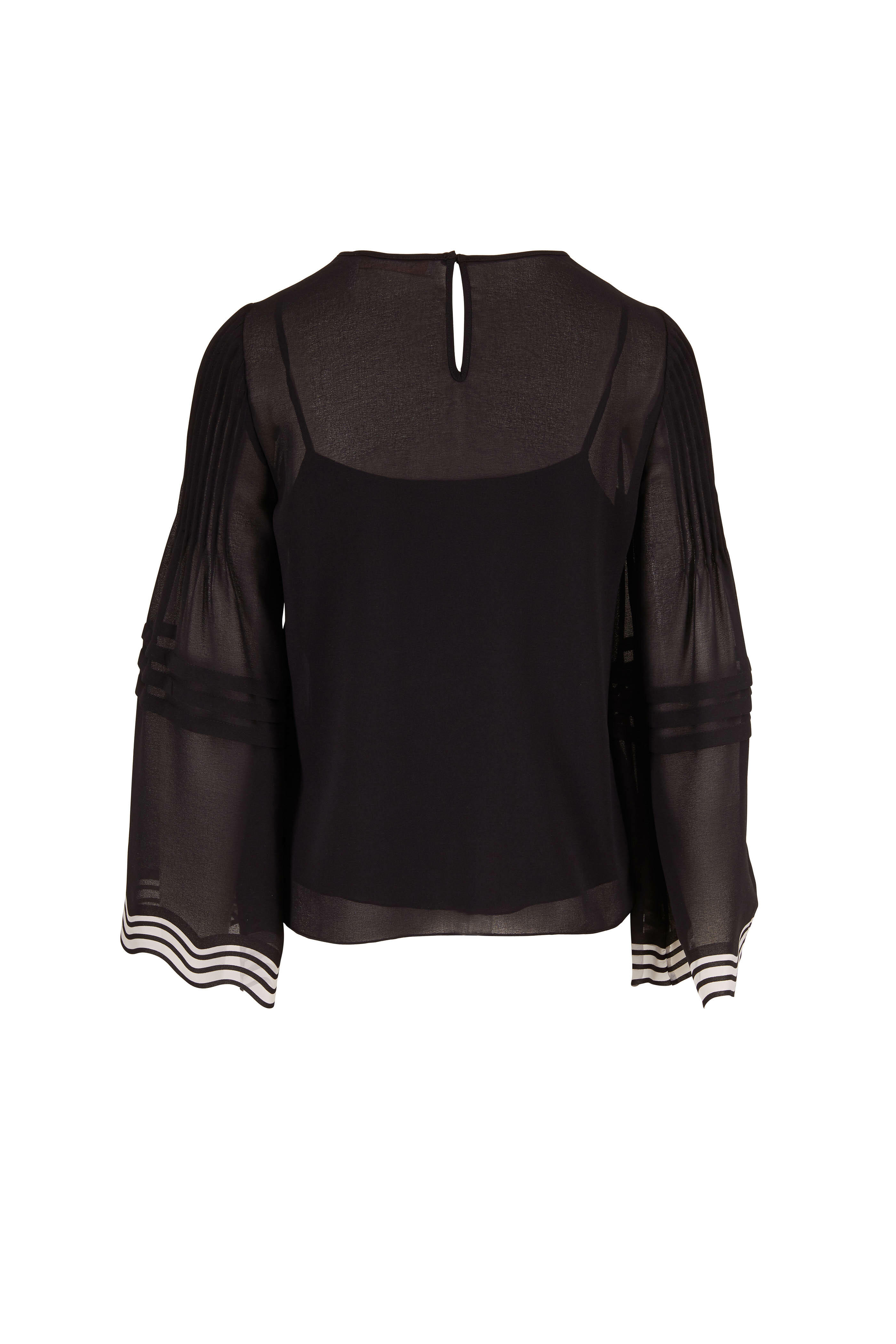 Jewel neckline. Single button keyhole back. Pleated long sleeves. Contrast scallop striped cuffs. Made in Portugal. 100% polyester; detachable self camisole. Machine wash.