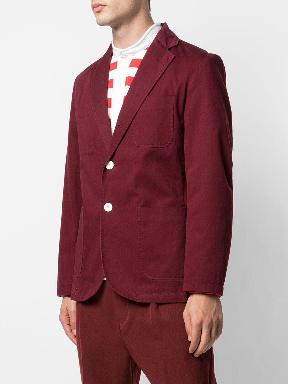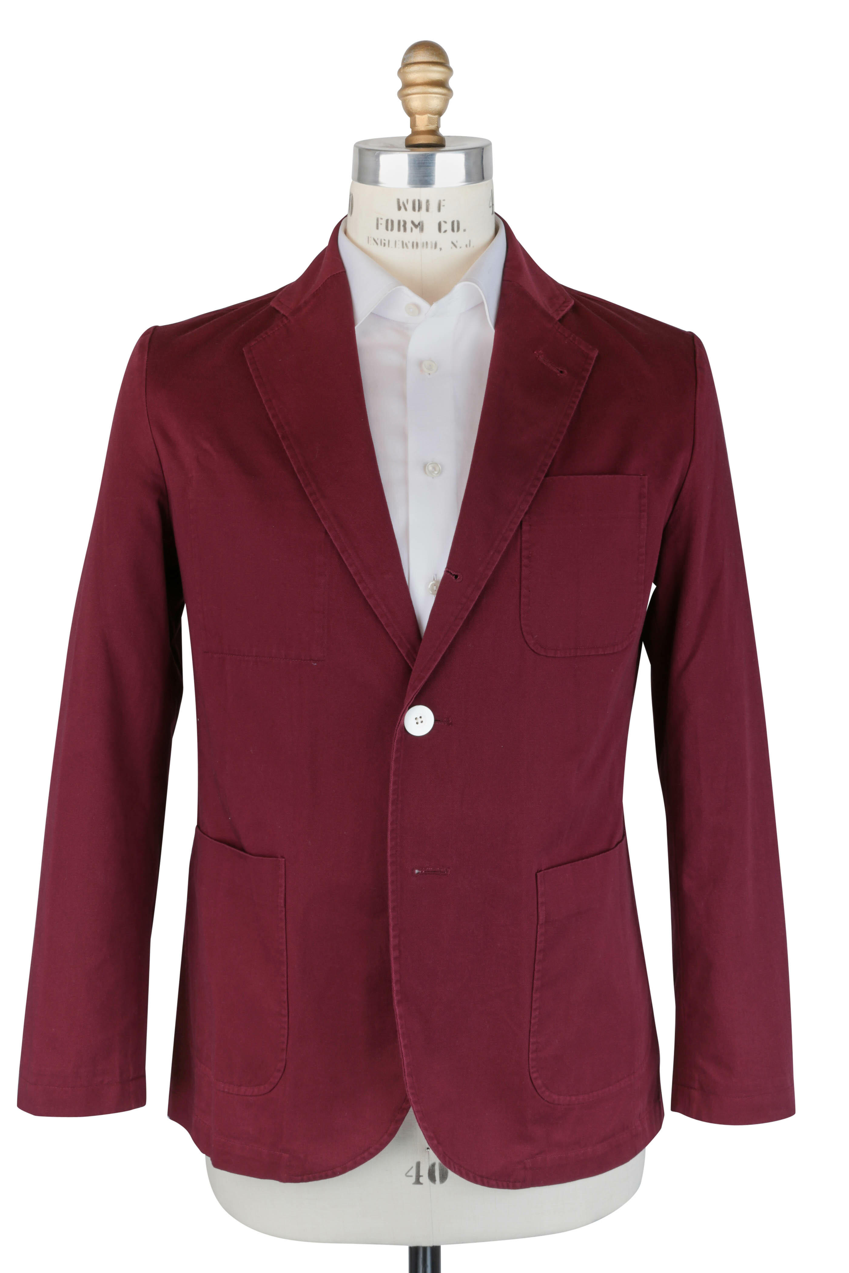 Notched lapels. Three button closure. Chest patch pocket, lower patch pockets. Ventless. Imported. 100% cotton; unlined. Machine wash.