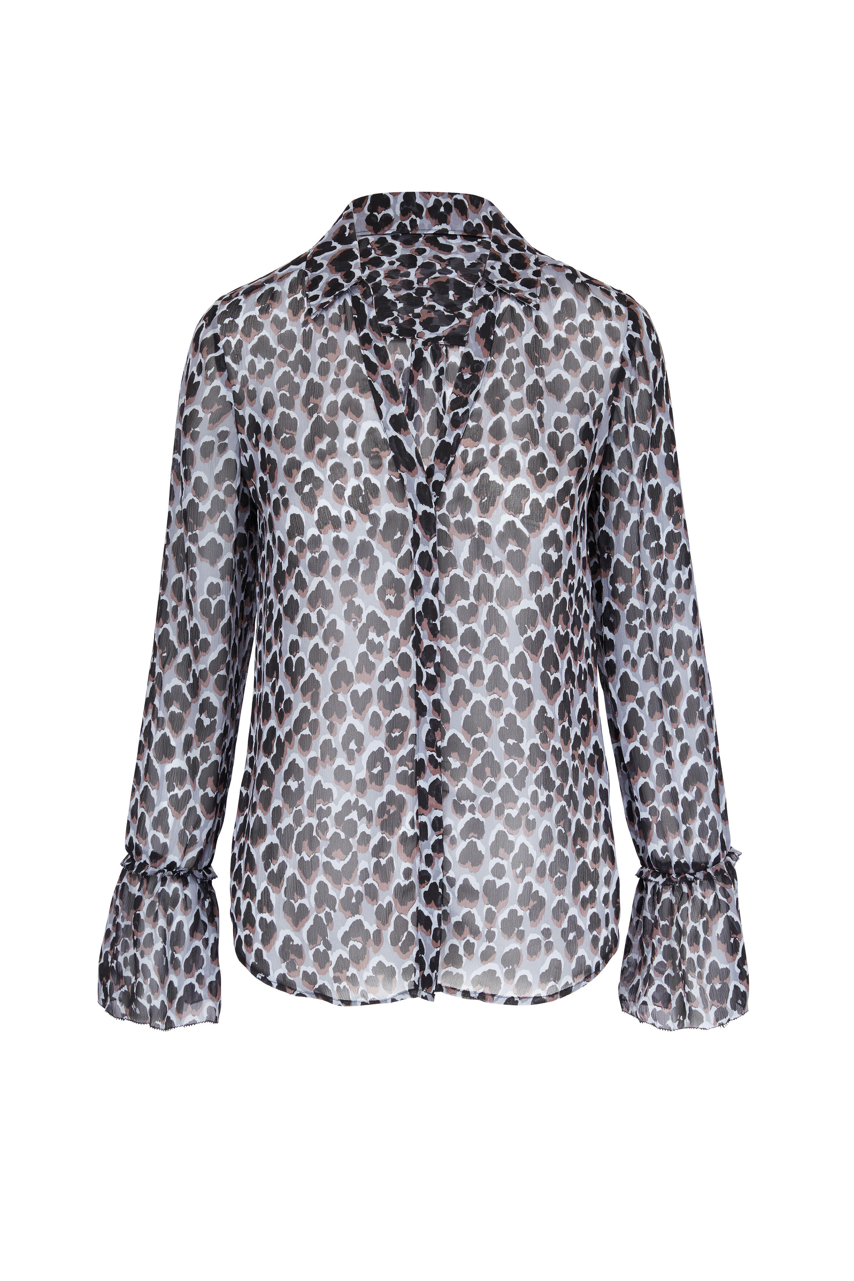 V-neckline. Spread collar. Concealed button-up front. Ruffled single button cuffs. Imported. 100% silk. Dry clean.