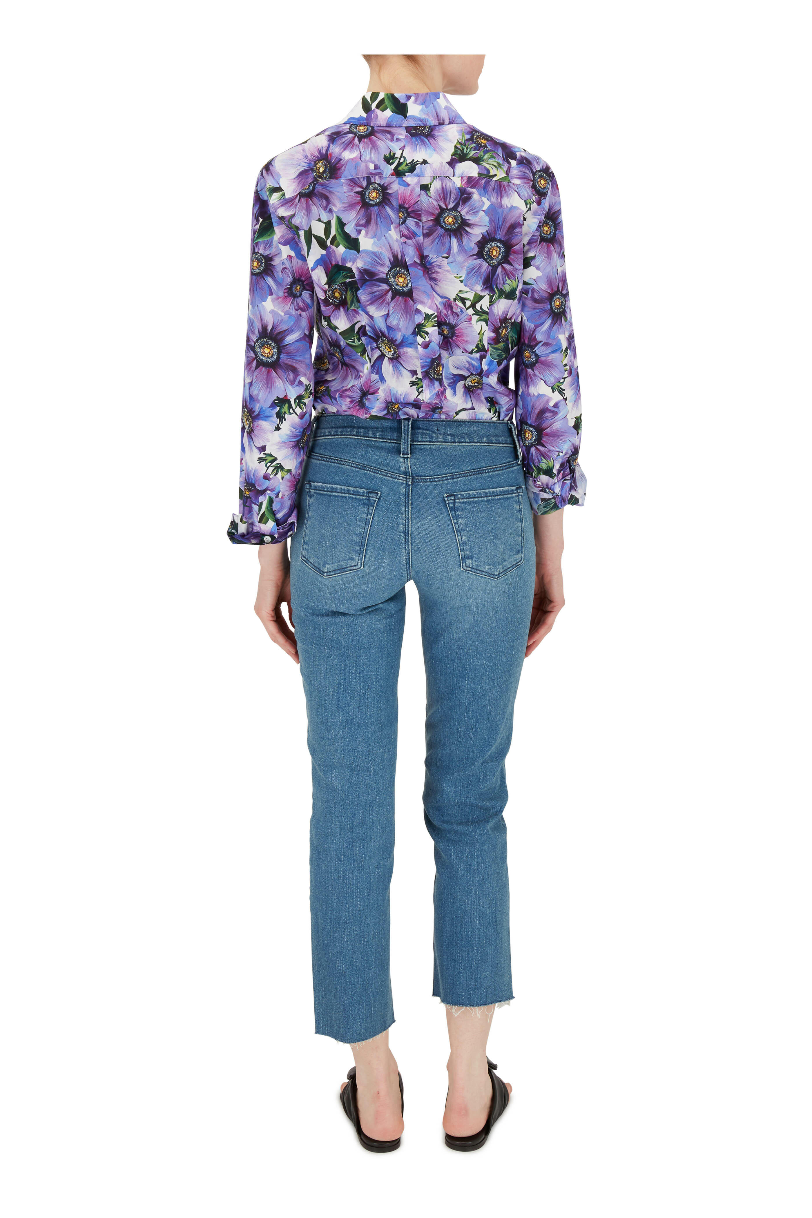 Pointed spread collar. Front button placket. Single button squared cuffs. Made in Italy. 100% cotton. Dry clean.