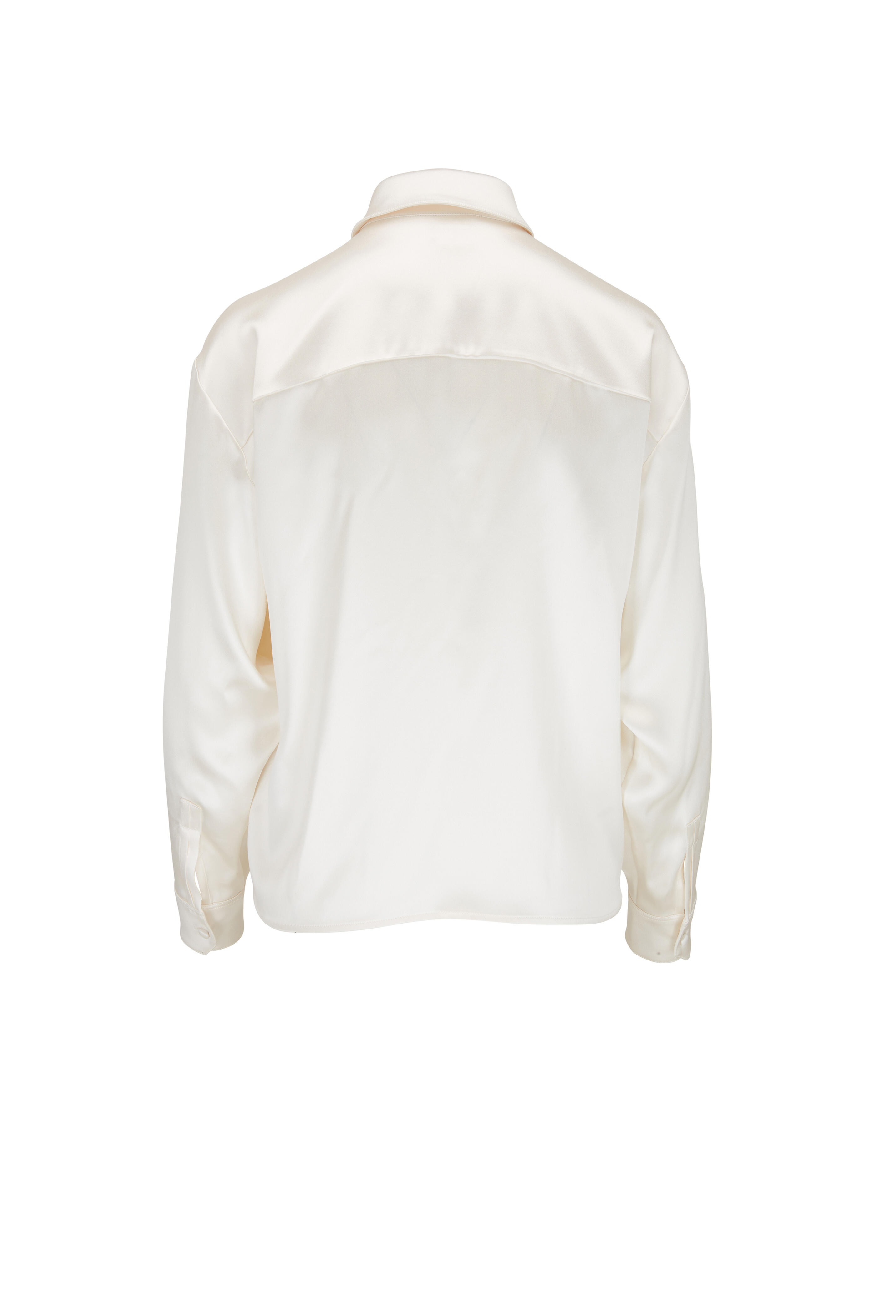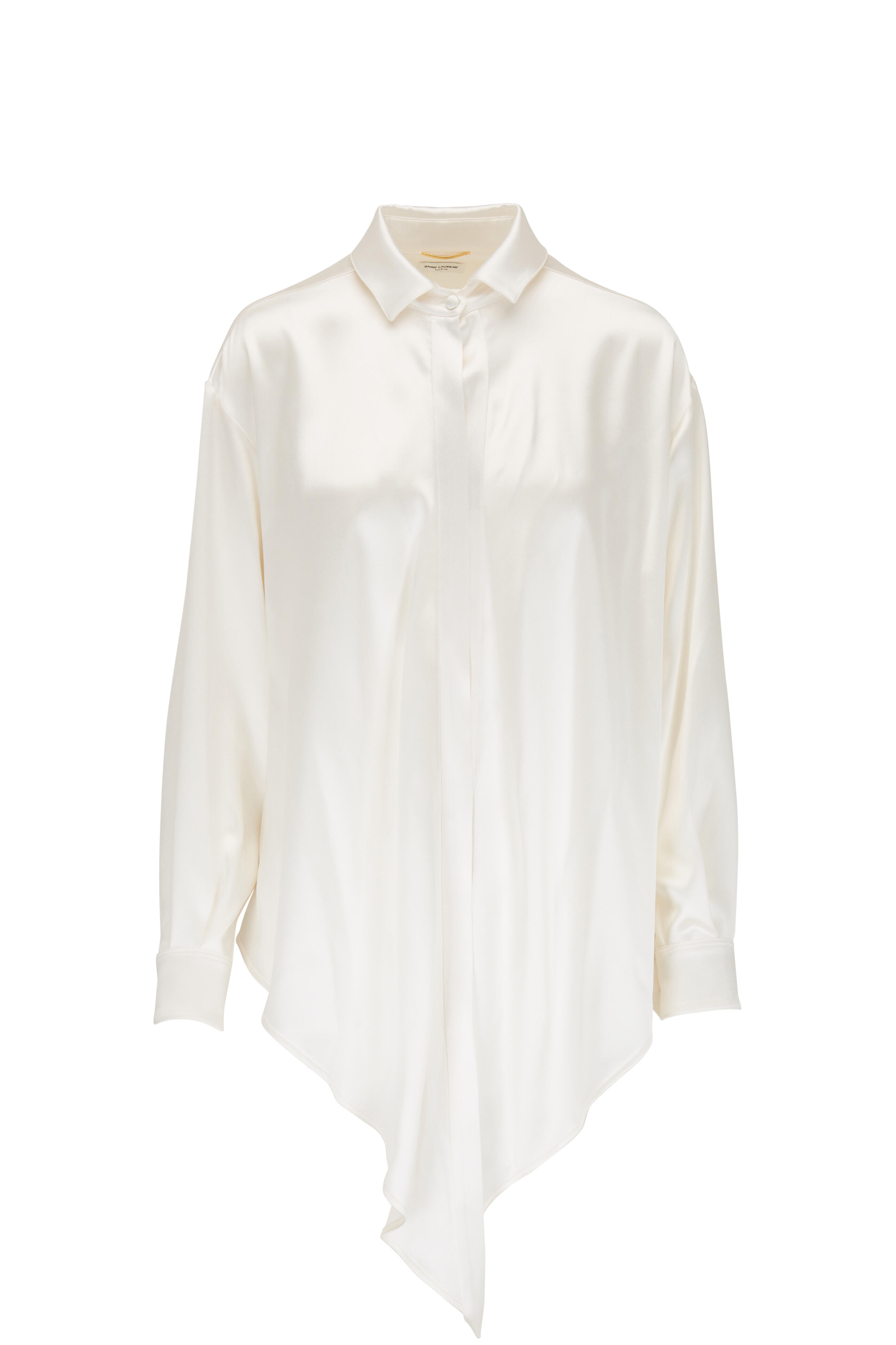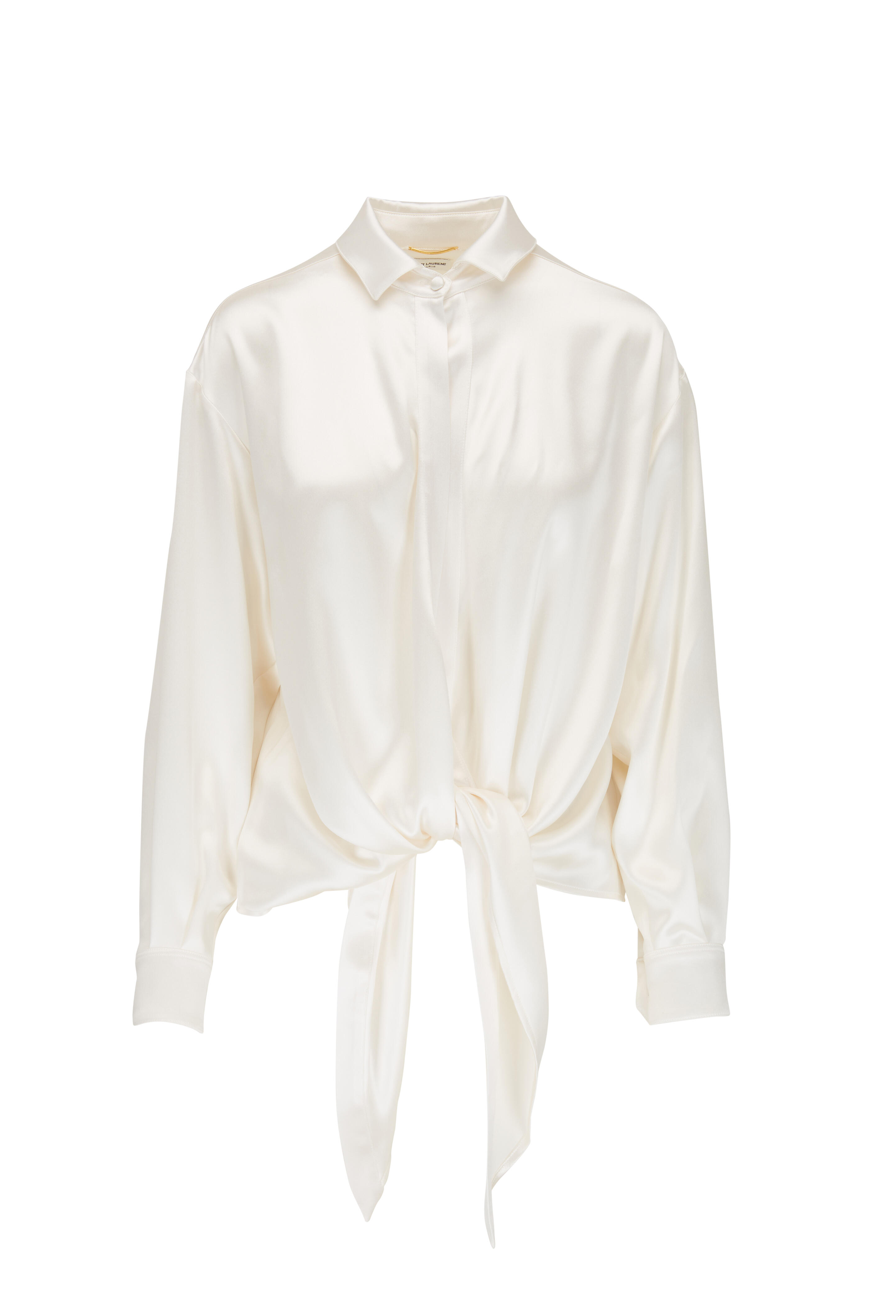 Spread collar. Single button closure. Single button mitered cuffs. Self tie detailing. Made in Italy. 100% silk. Dry clean.