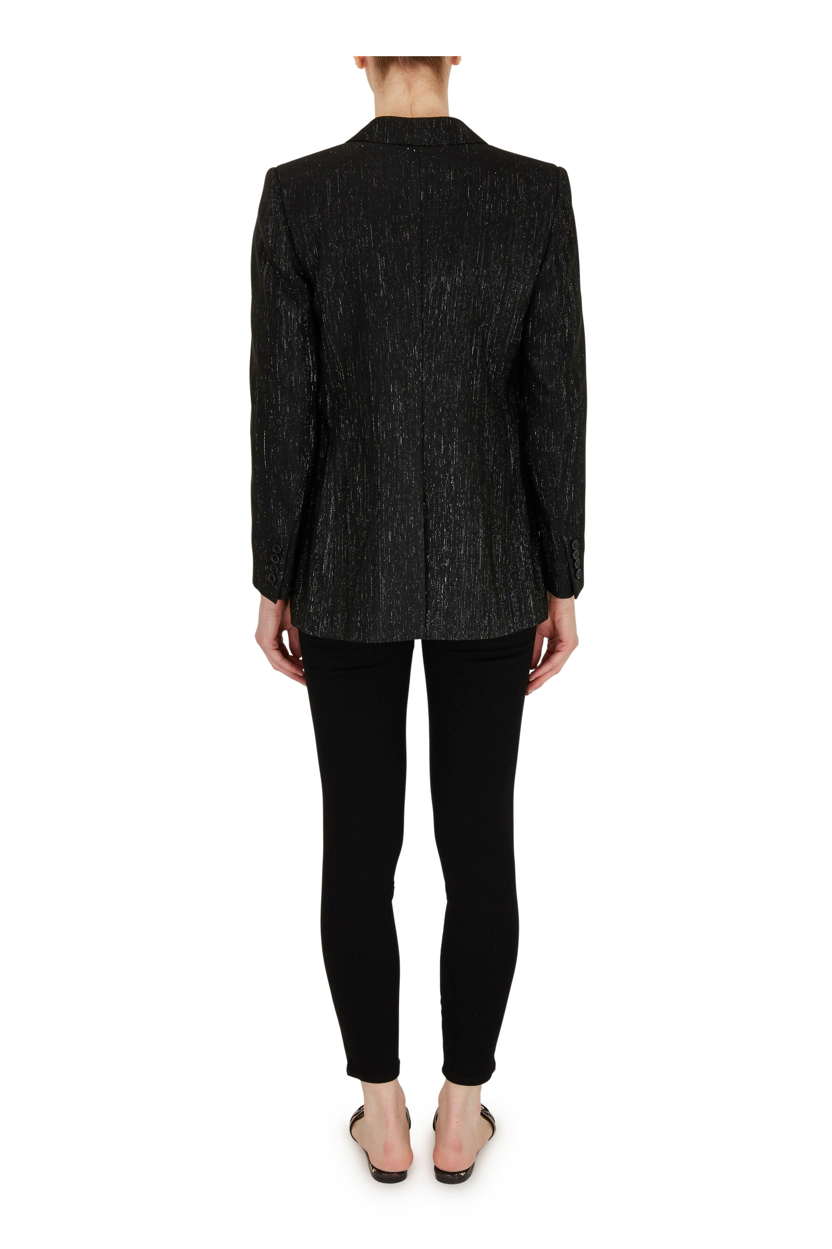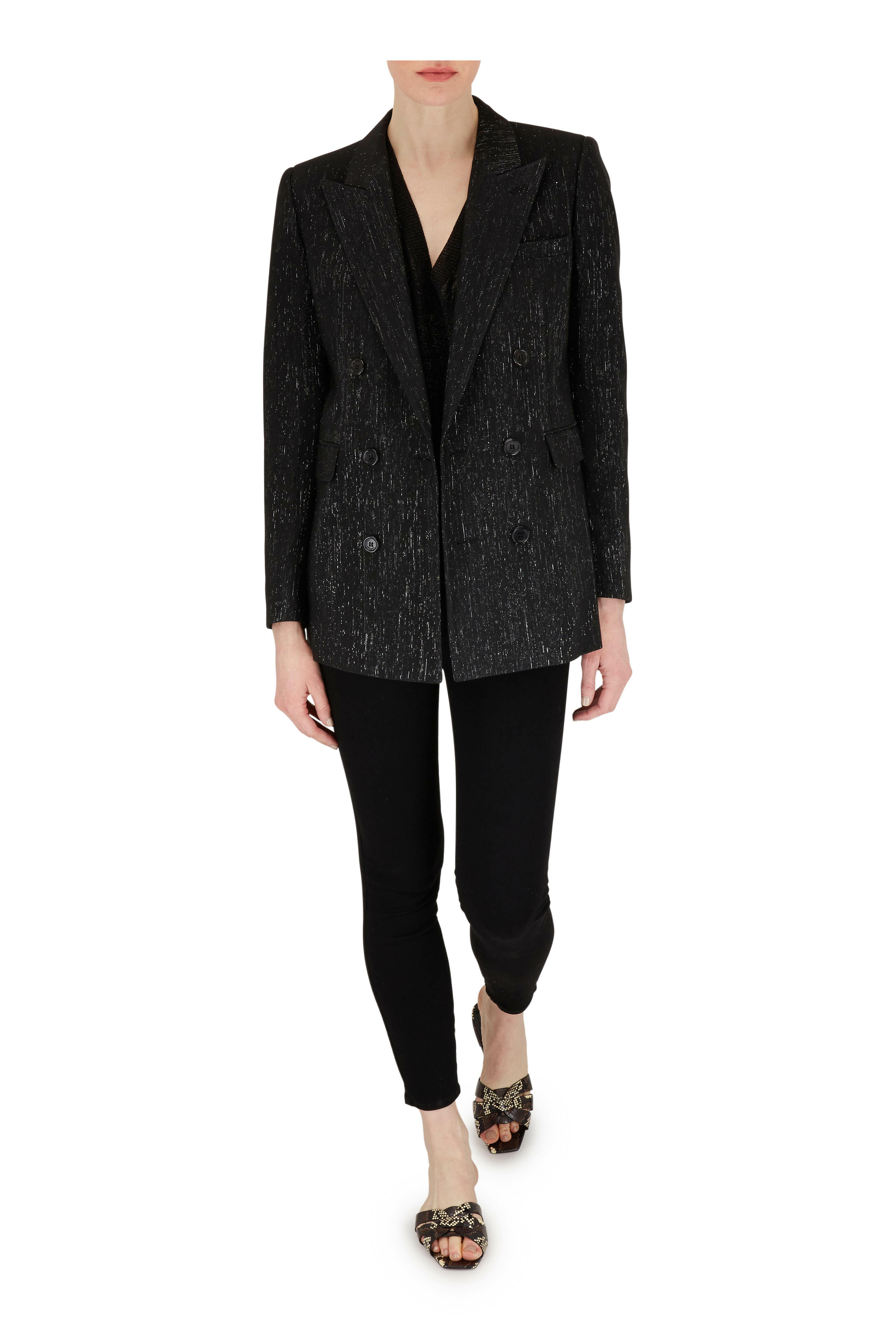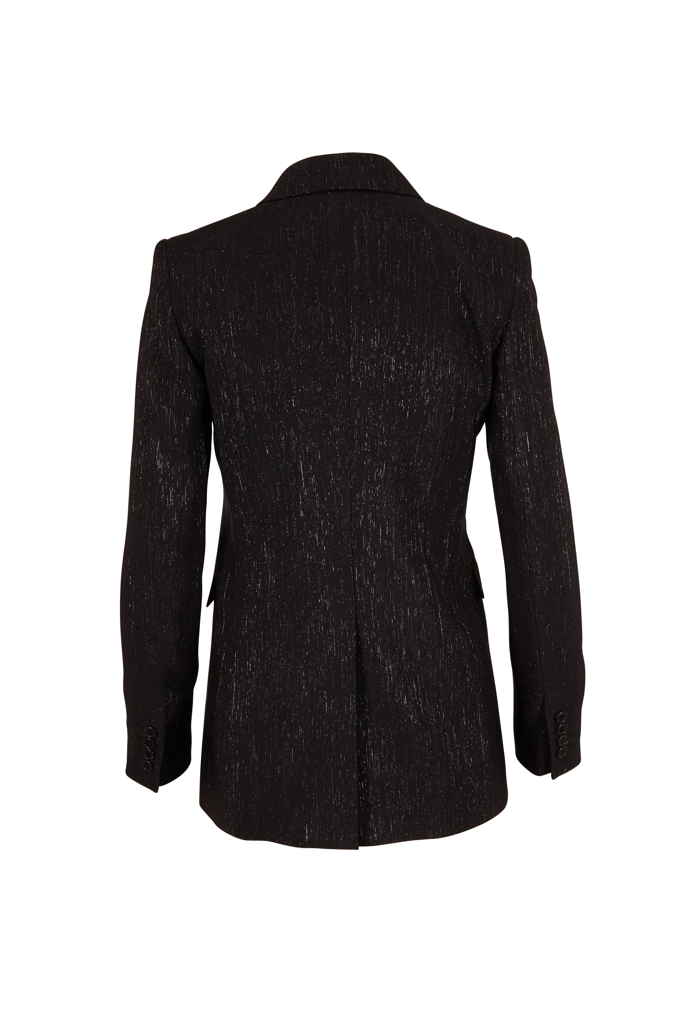 Peak lapels. Double-breasted button closure. Four button cuffs. Lower flap pockets. Center back vent. Made in Italy. 57% viscose, 39% acetate, 4% metallic fiber; lining 100% silk. Dry clean.