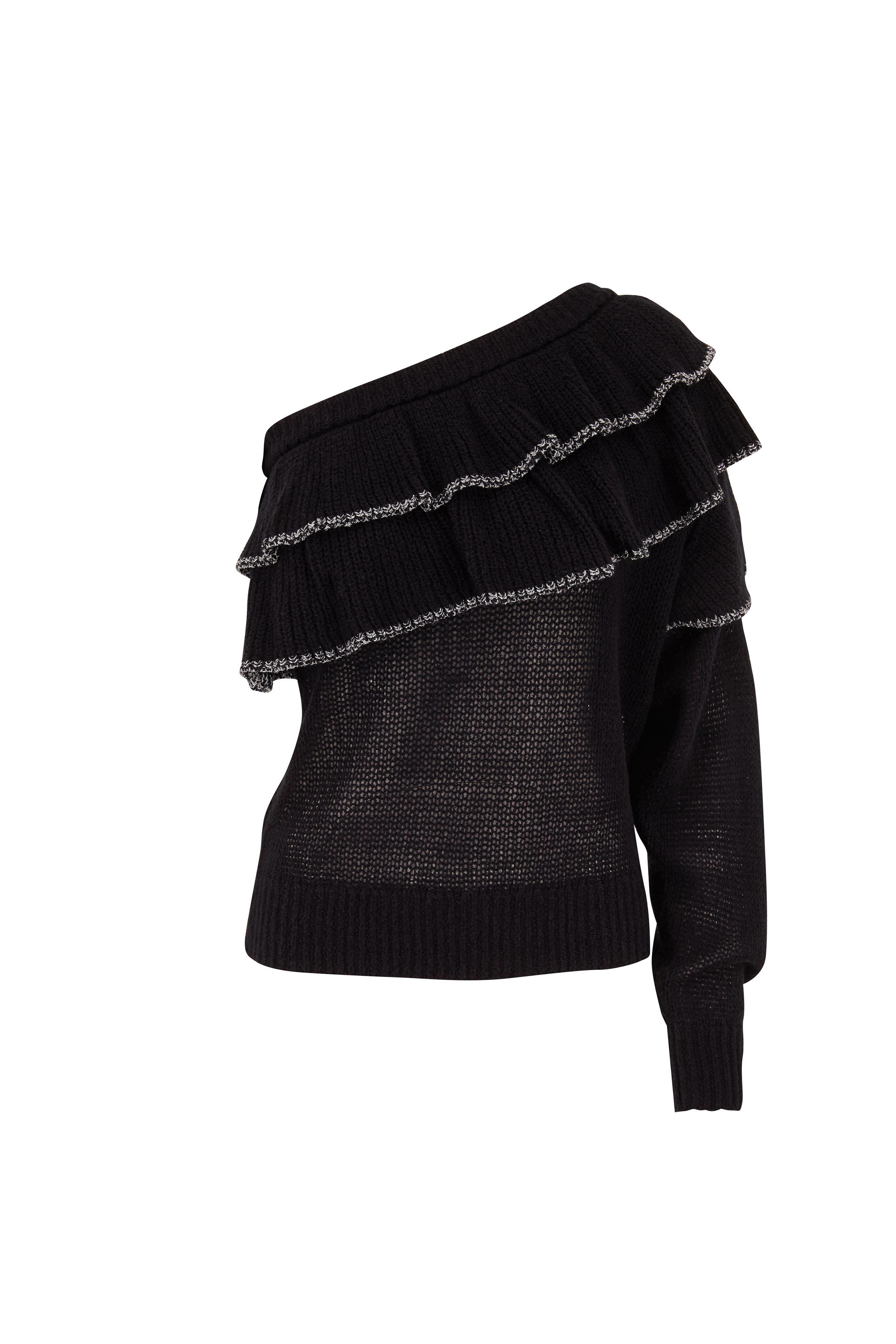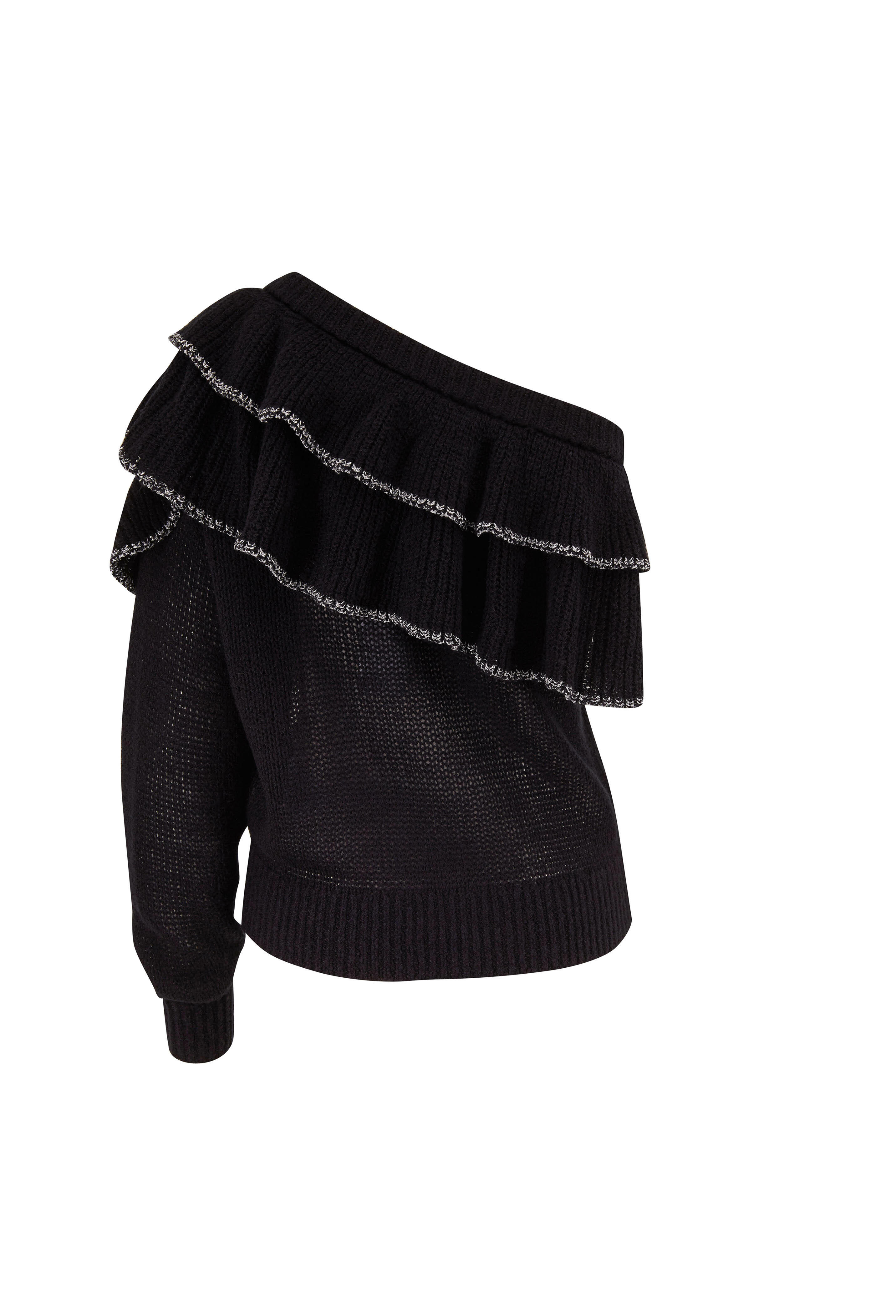 One-shoulder neckline. Double ruffle detail, contrast top-stitching detail. Ribbed trim. Imported. 34% merino wool, 31% linen, 19% cotton, 14% nylon, 2% cashmere. Dry clean.