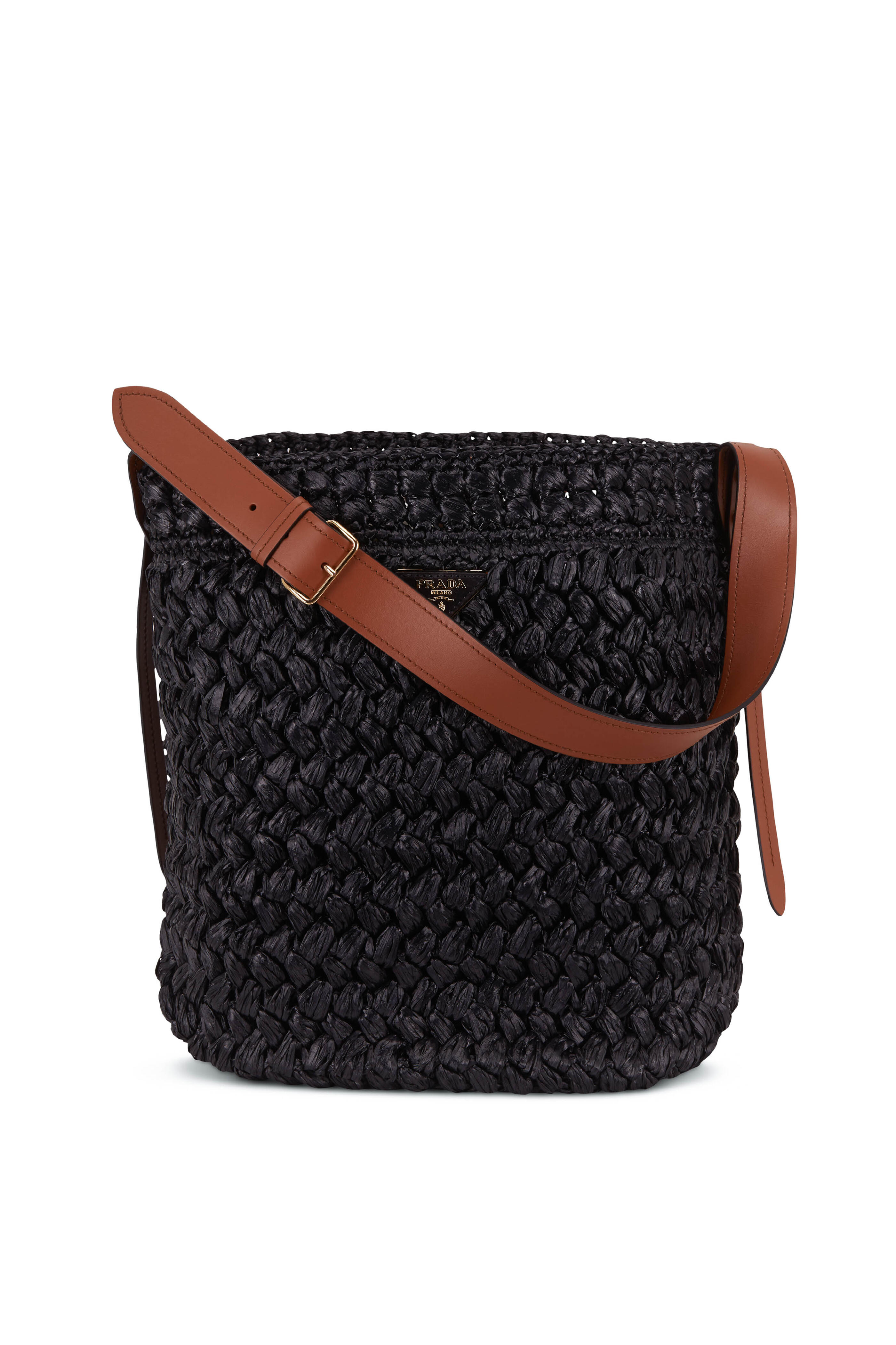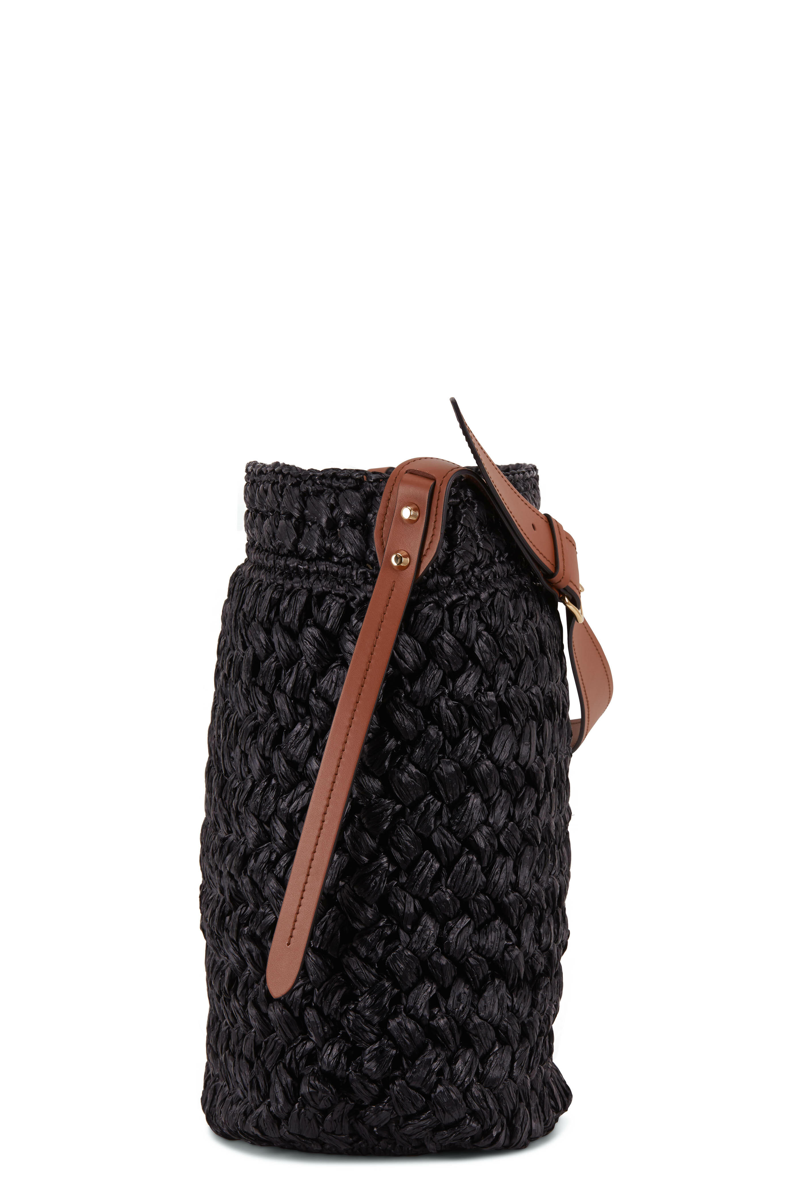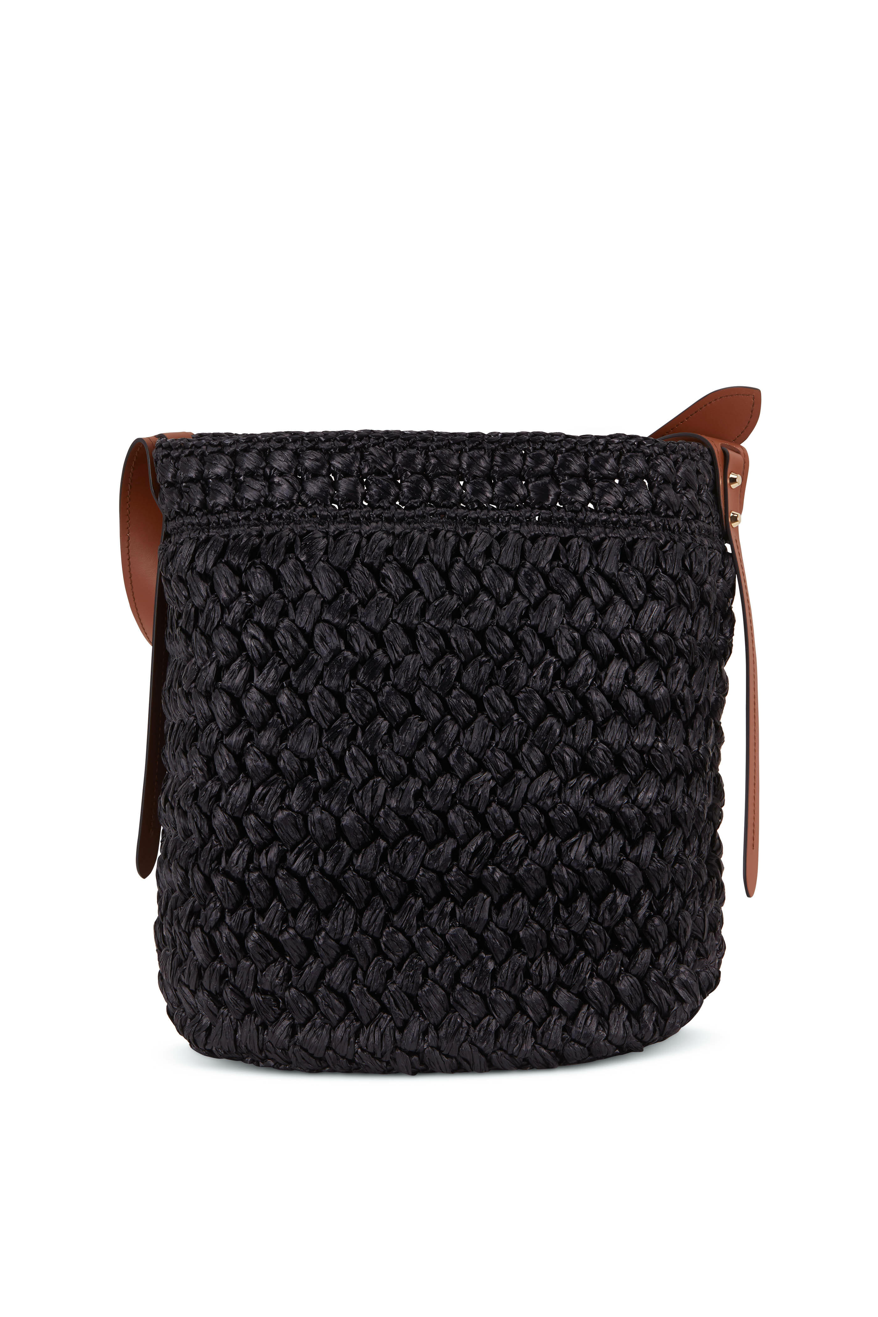 Black Raffia & Cognac Leather Large Bucket Tote