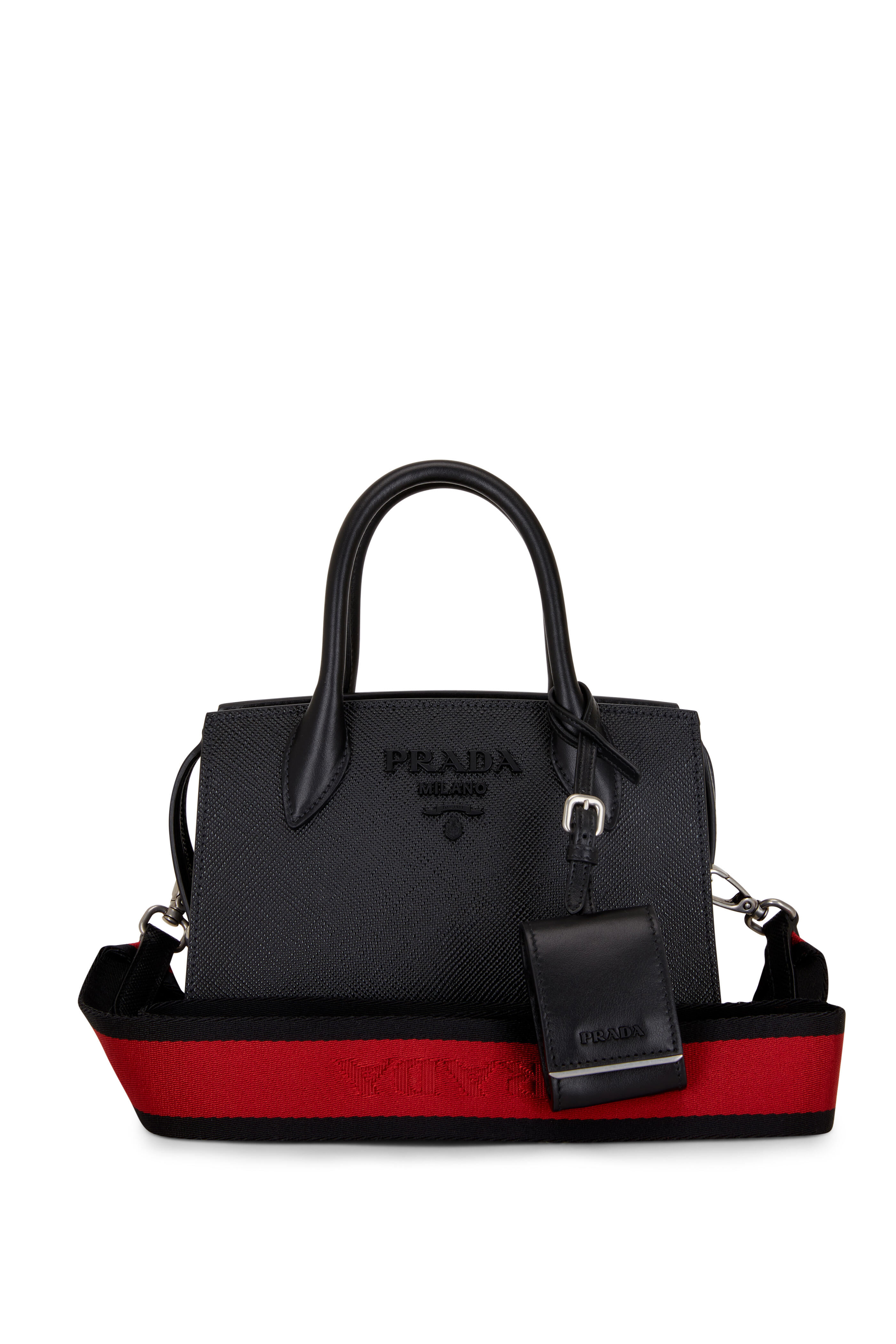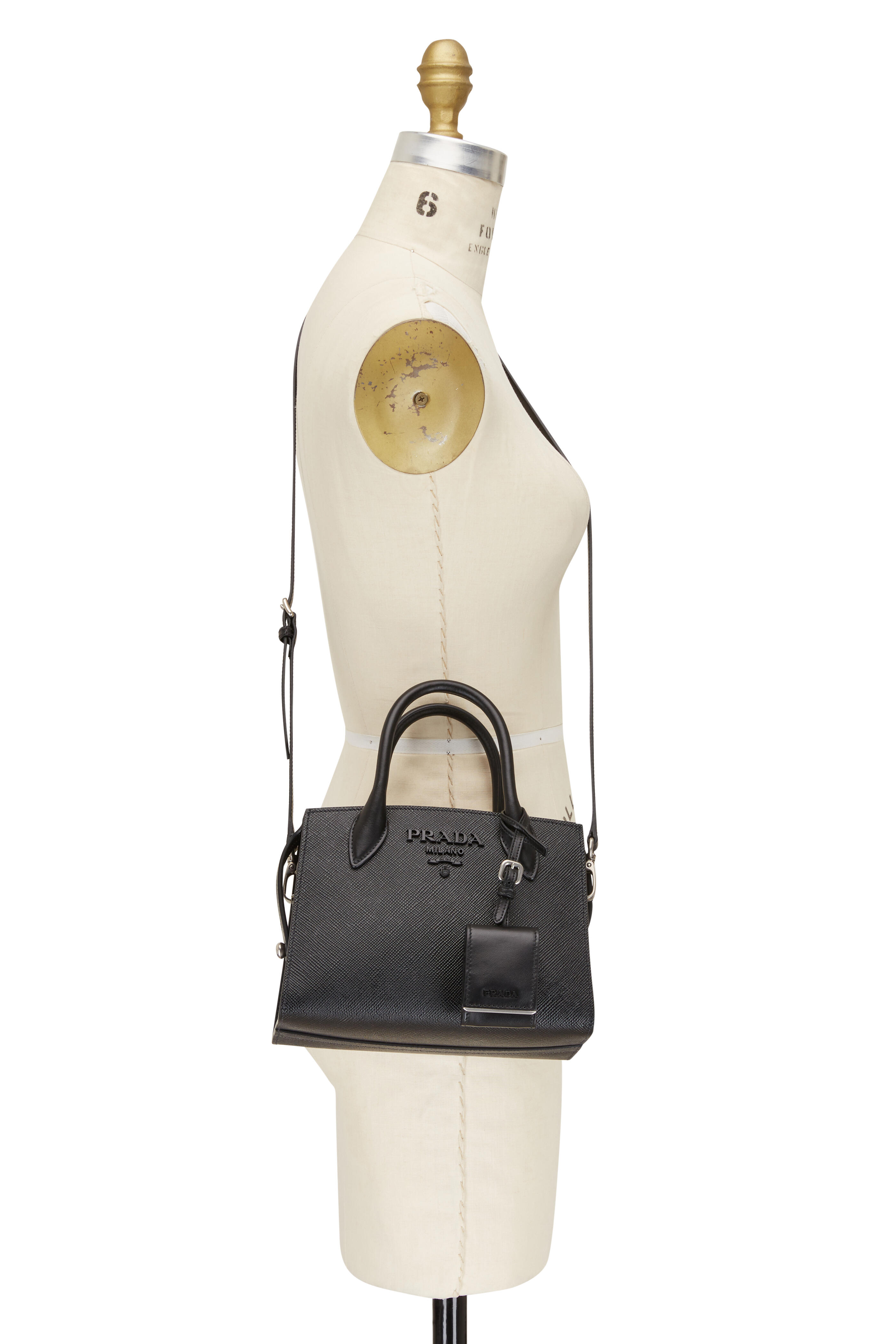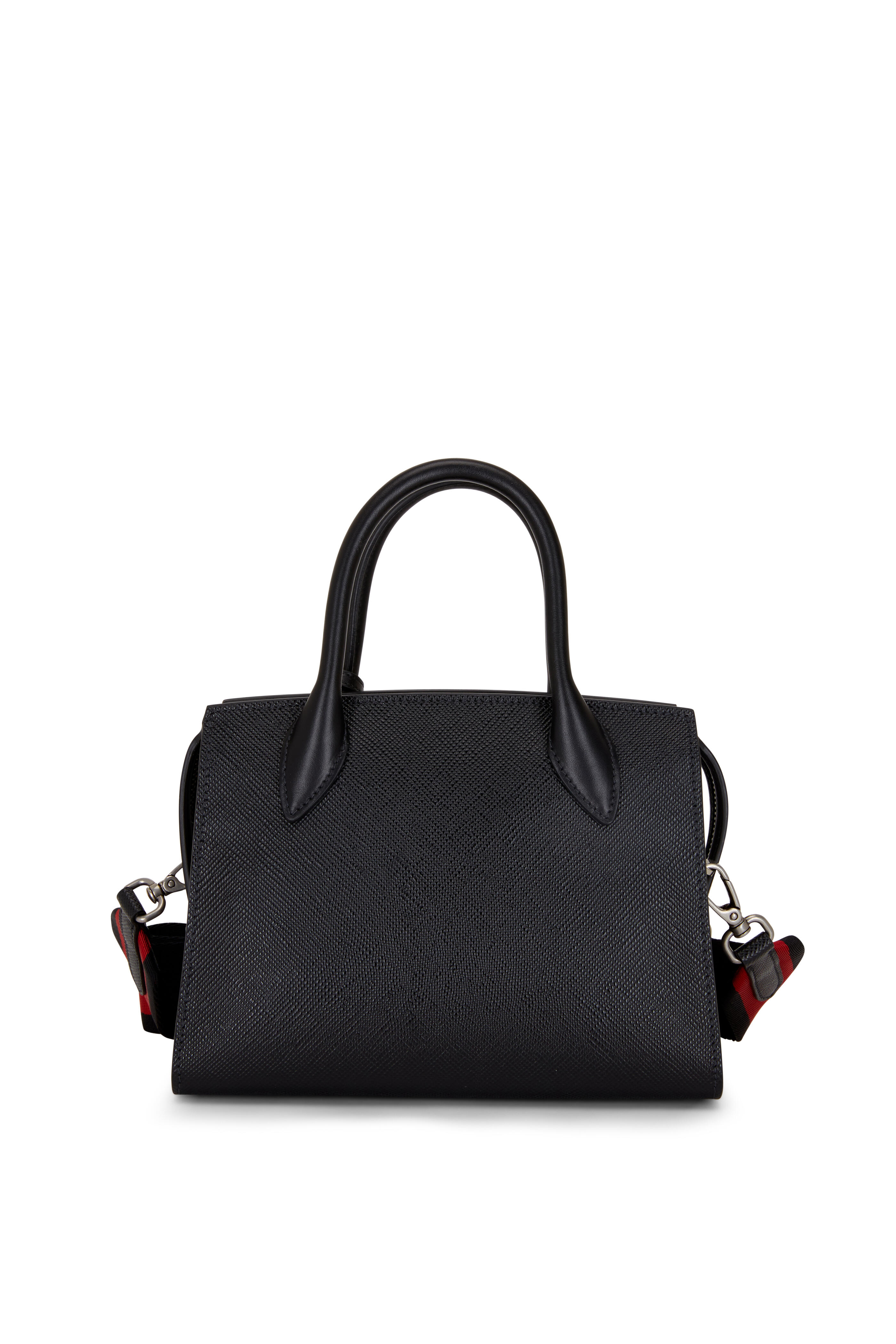 Smooth and saffiano leather. Dual rolled top handles; removable and adjustable leather & nylon shoulder strap. Top two-way zip. Interior slip pocket; exterior removable mini snap pouch. Textile lining. Tonal logo detail. Made in Italy. Height: 7". Width: 8". Depth: 4". Handle drop: 3½". Strap drop: 19".