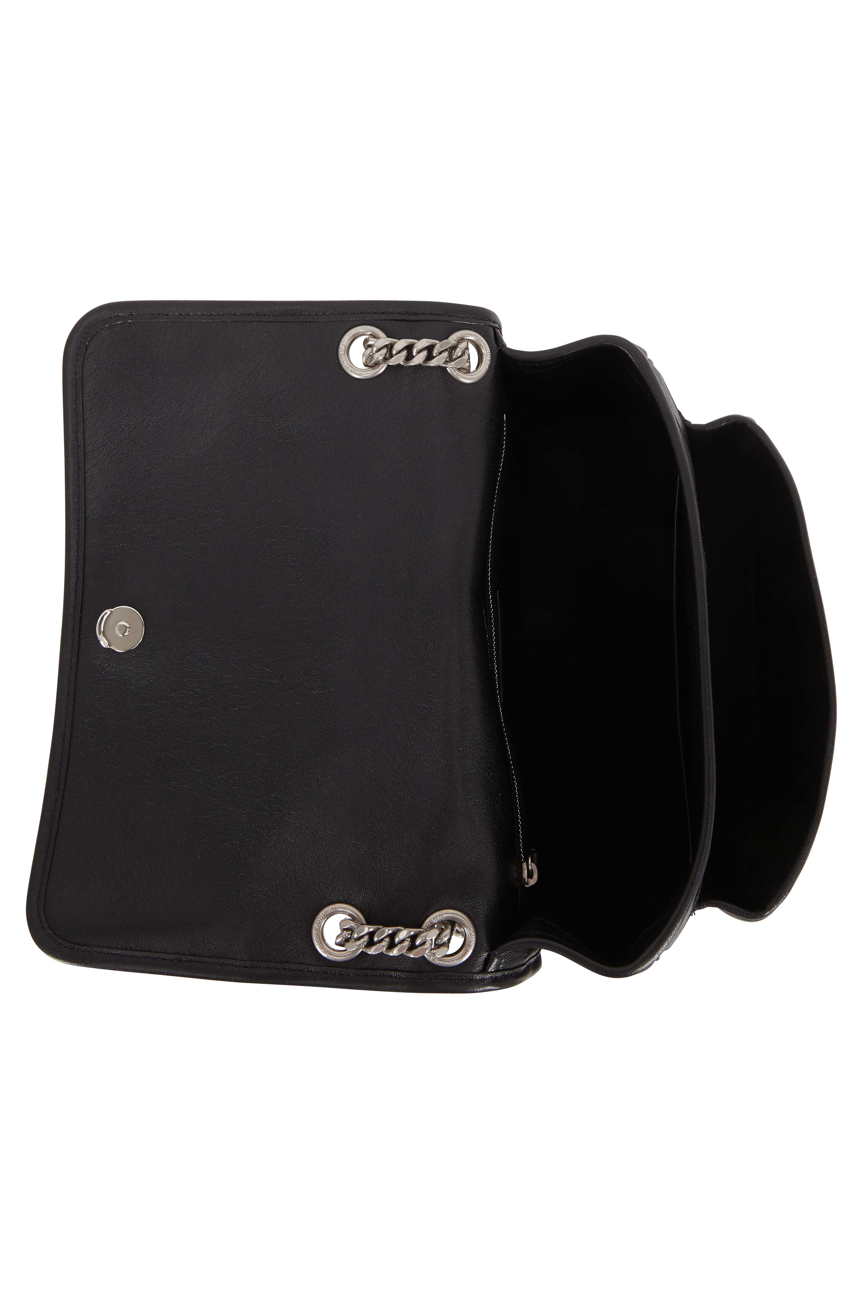 Calfskin leather. Chain with leather inset shoulder strap. Flap front, magnetic snap closure. Black lacquer signature detail. Exterior back slip pocket. Open compartment under flap. One interior slip pocket, one zip pocket. Lined in canvas. Made in Italy. Height: 8". Width: 11". Depth: 4". Convertible strap drop: 10".