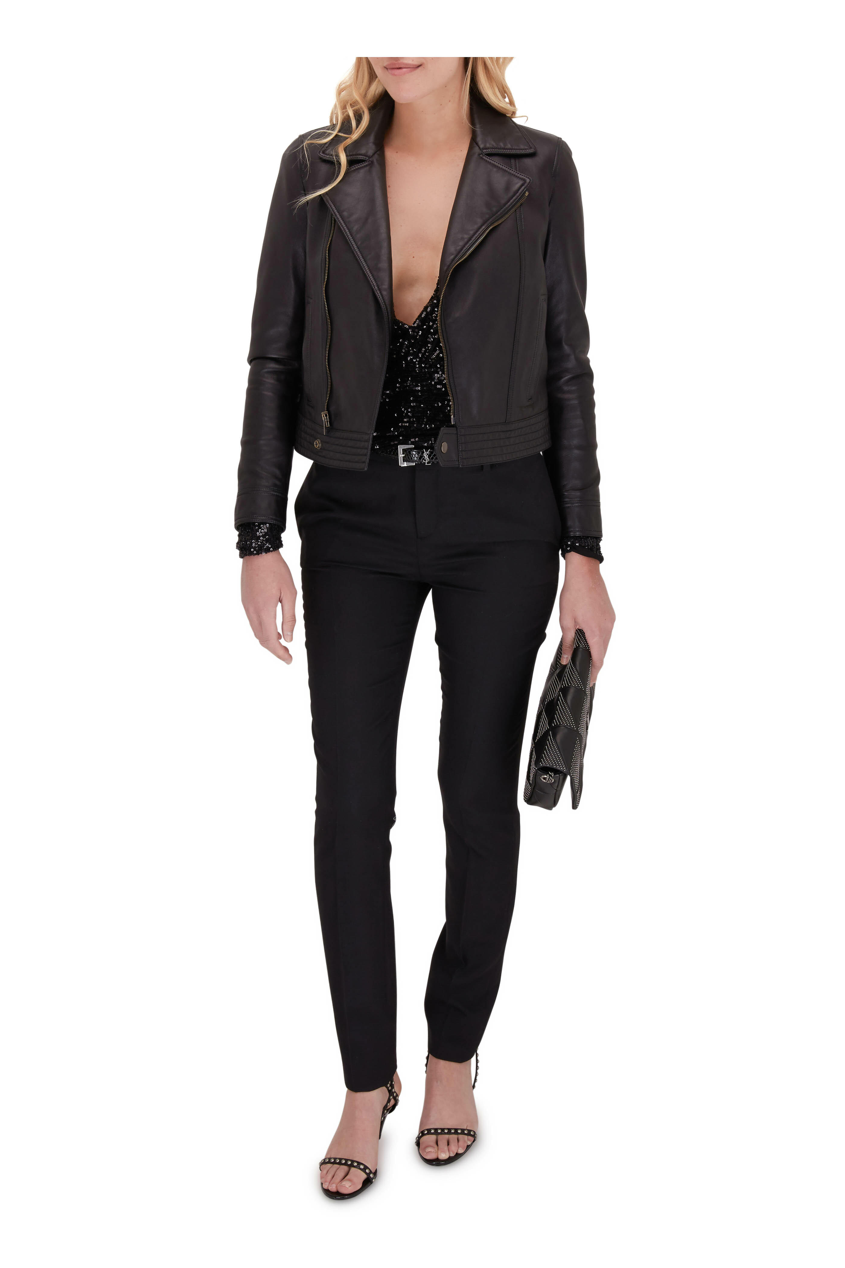 Lambskin leather. Detachable chain with leather inset shoulder strap. Flap front, magnetic snap closure. Brushed silver-tone signature detail. Micro stud embellishment. One interior zip pocket. Lined in grosgrain. Made in Italy. Width: 10". Height: 5". Depth: 2". Strap drop: 9".