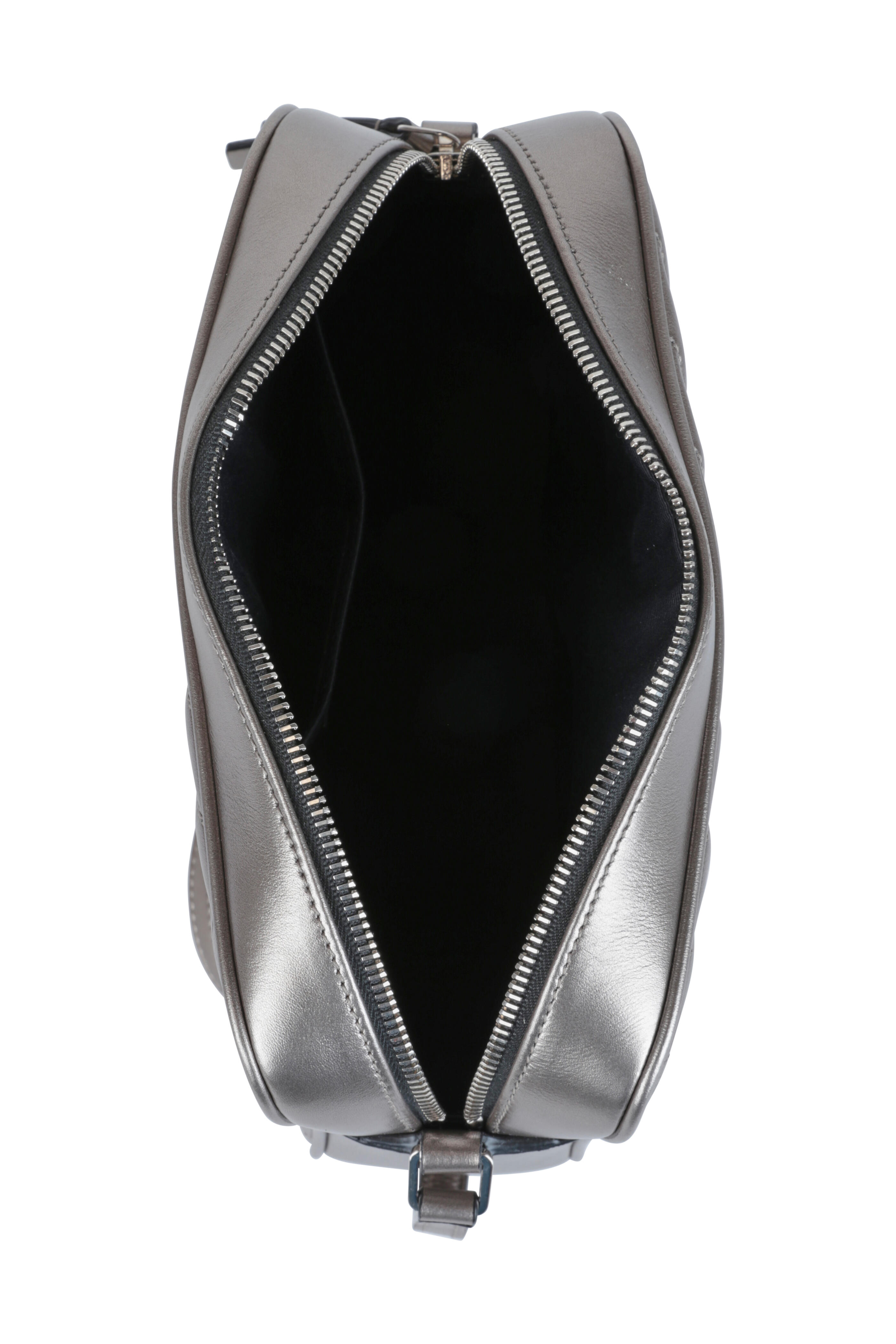 Calfskin leather. Top zip closure. Flat leather adjustable strap. Exterior metal logo. Interior slip pocket. Lined in fabric. Made in Italy. Length: 9". Height: 6". Depth: 2½".