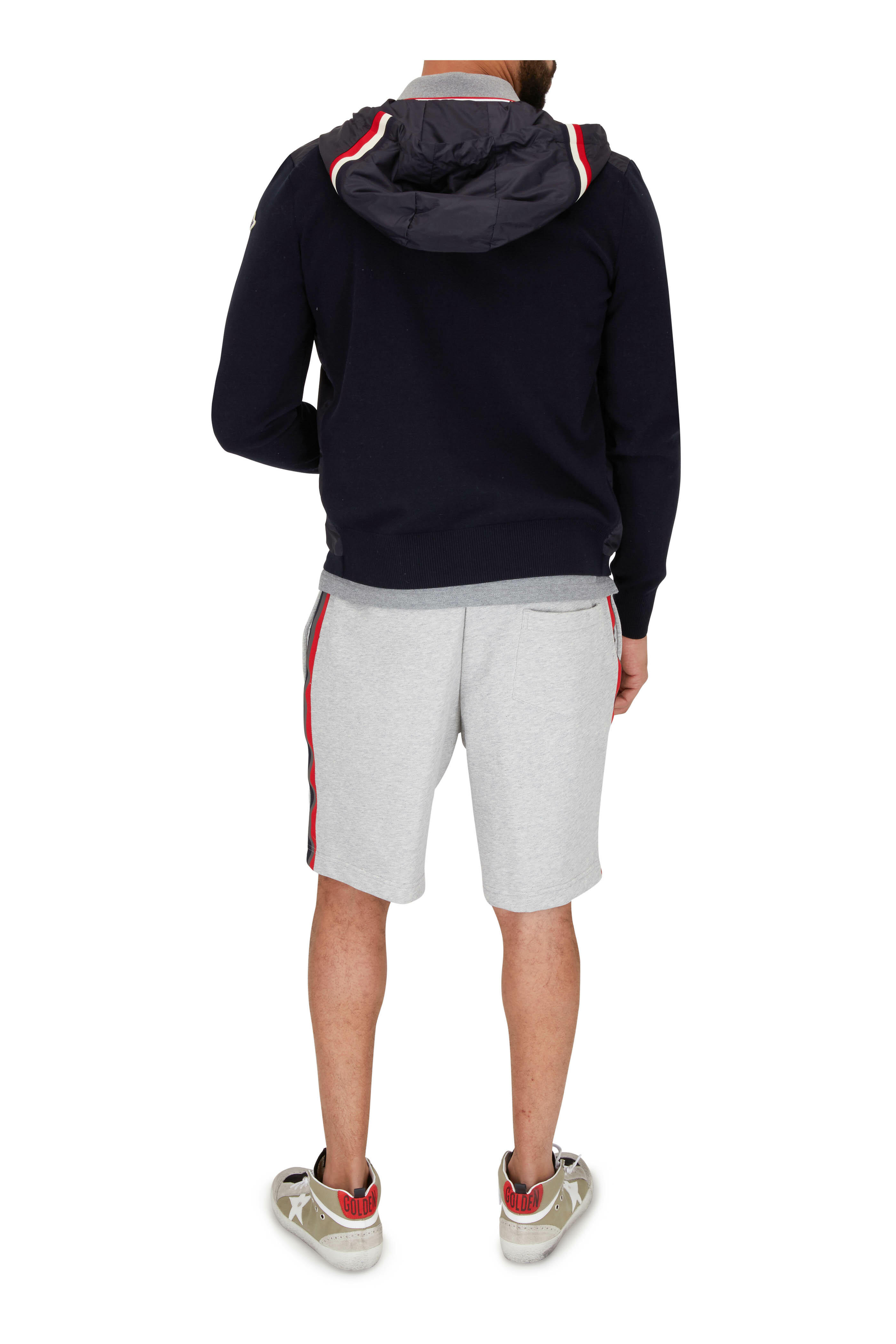Attached, drawstring hood; logo stripe detail. Front two-way zip closure. Contrast knit sleeves; ribbed cuffs. Lower snap pockets. Contrast knit back. Imported. 100% polyamide; fabric 2: 100% cotton. Dry clean.