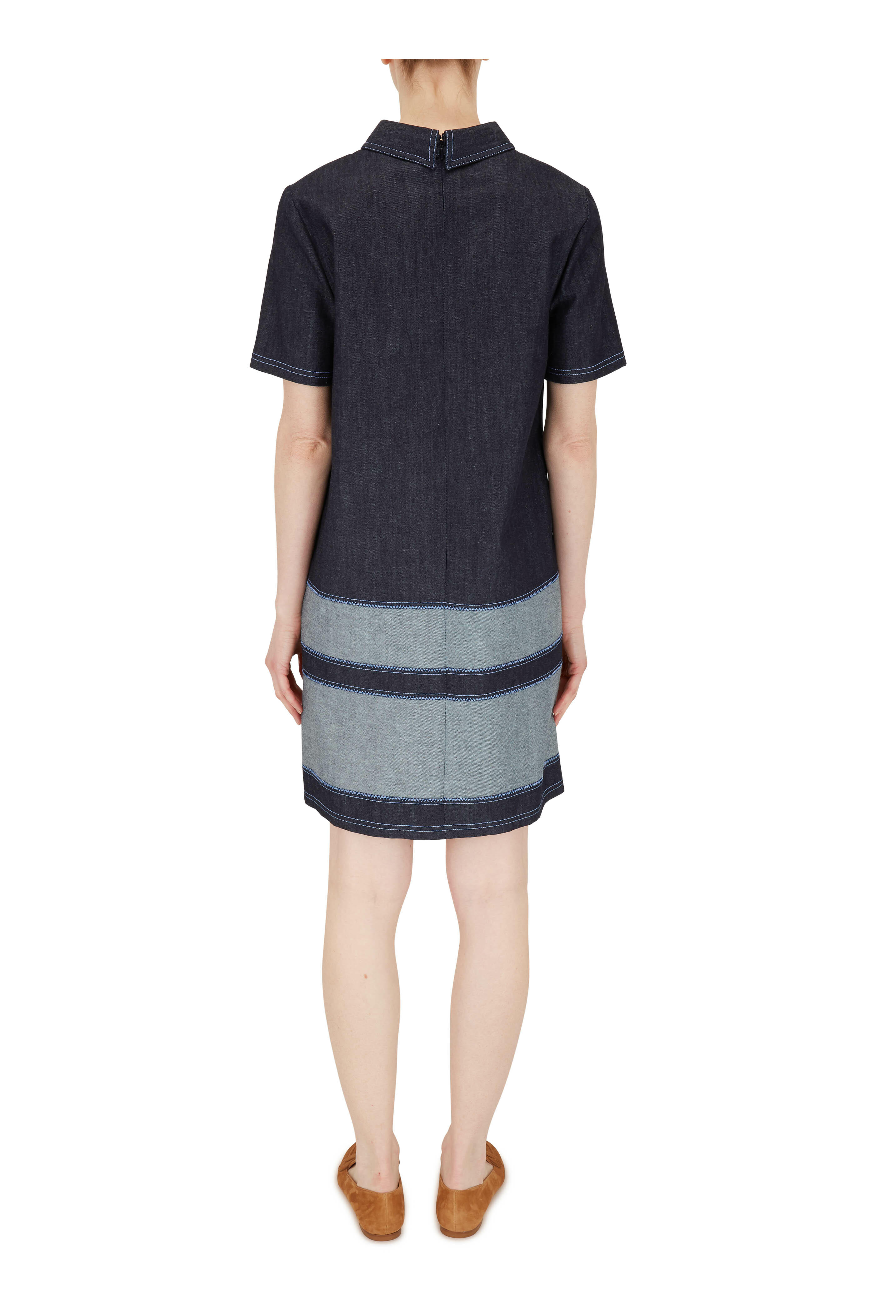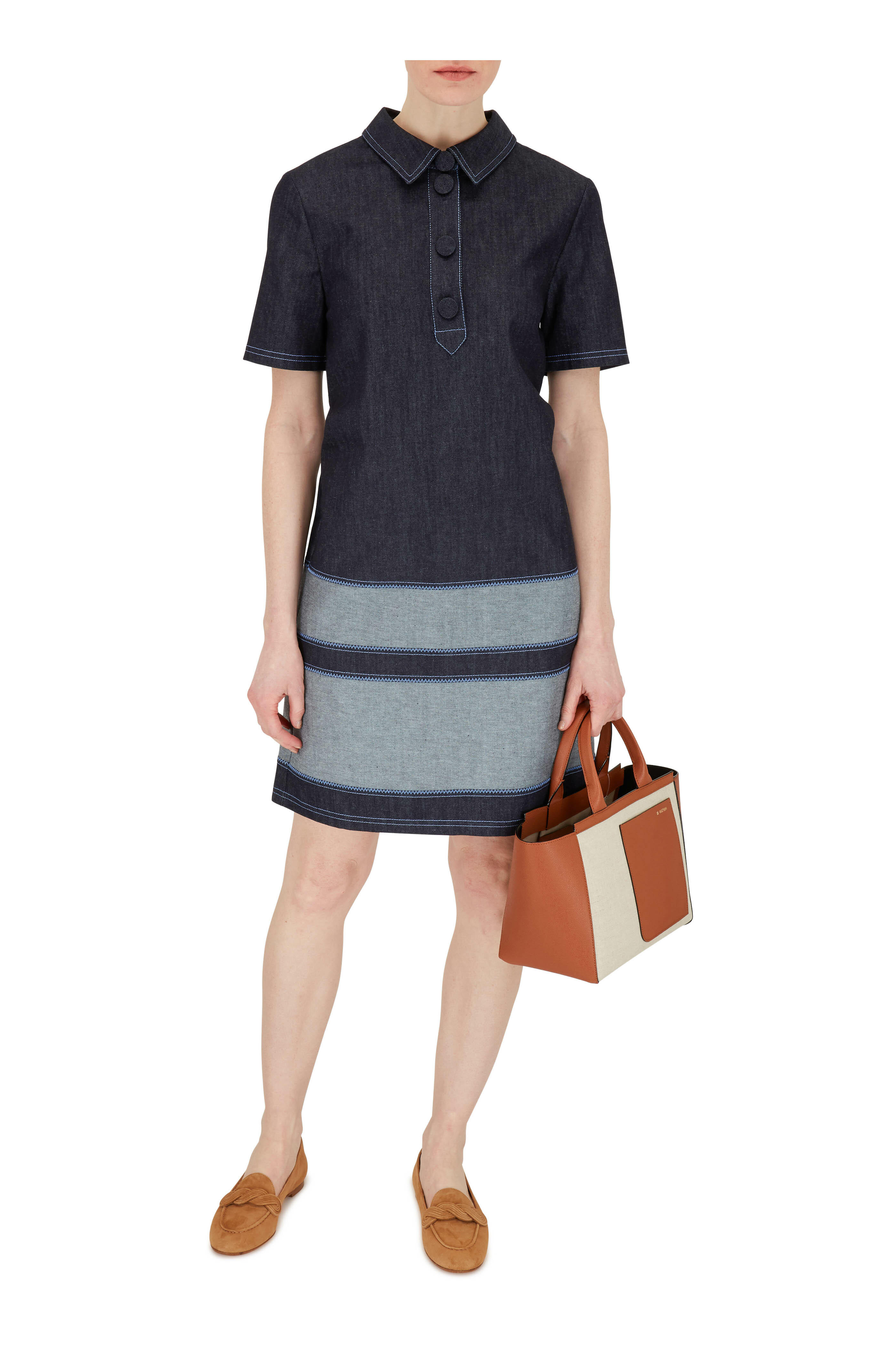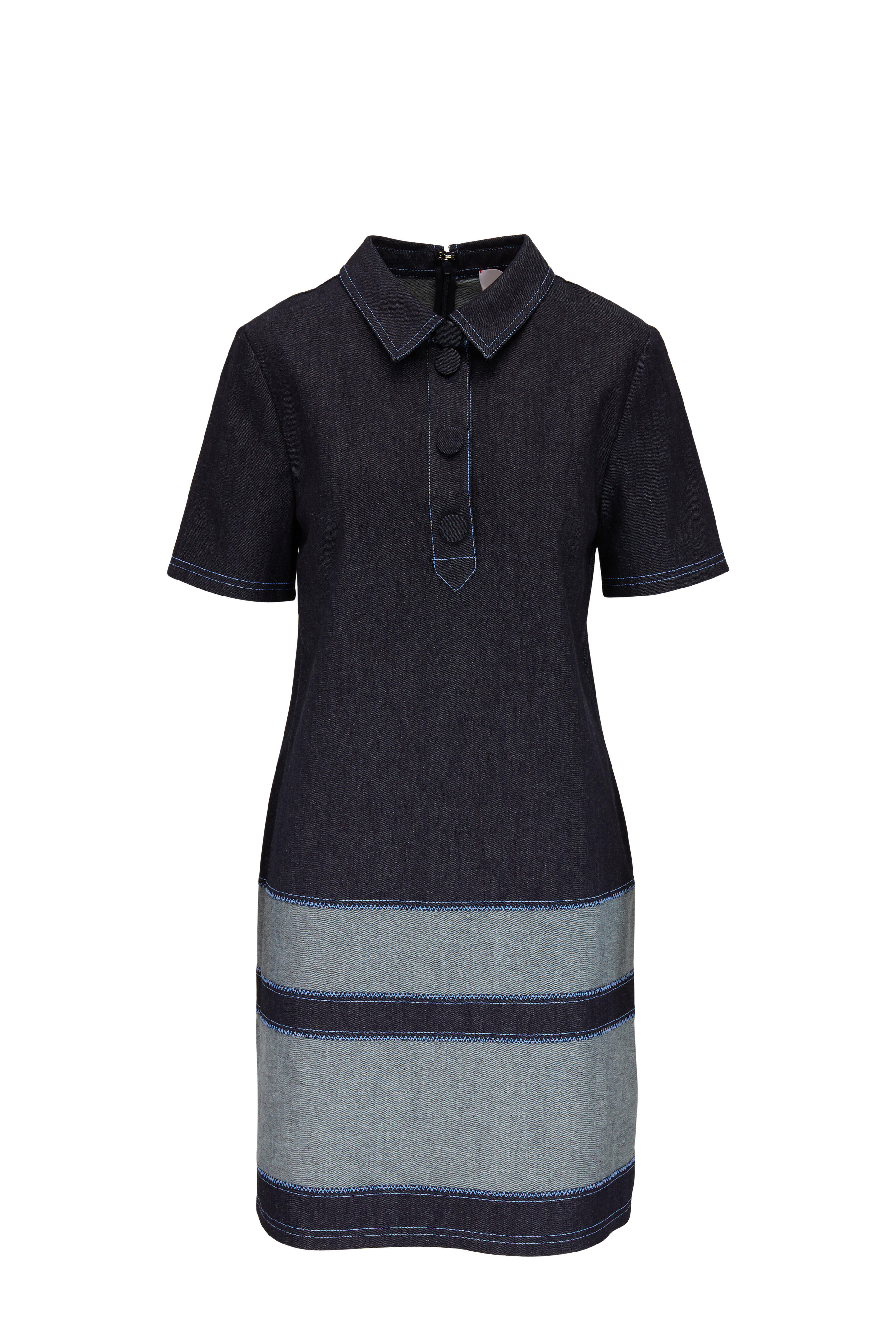 Spread collar; three button placket. Concealed back zip. Straight hem. Made in Portugal. 35" shoulder to hem. 99% cotton, 1% elastane. Dry clean.