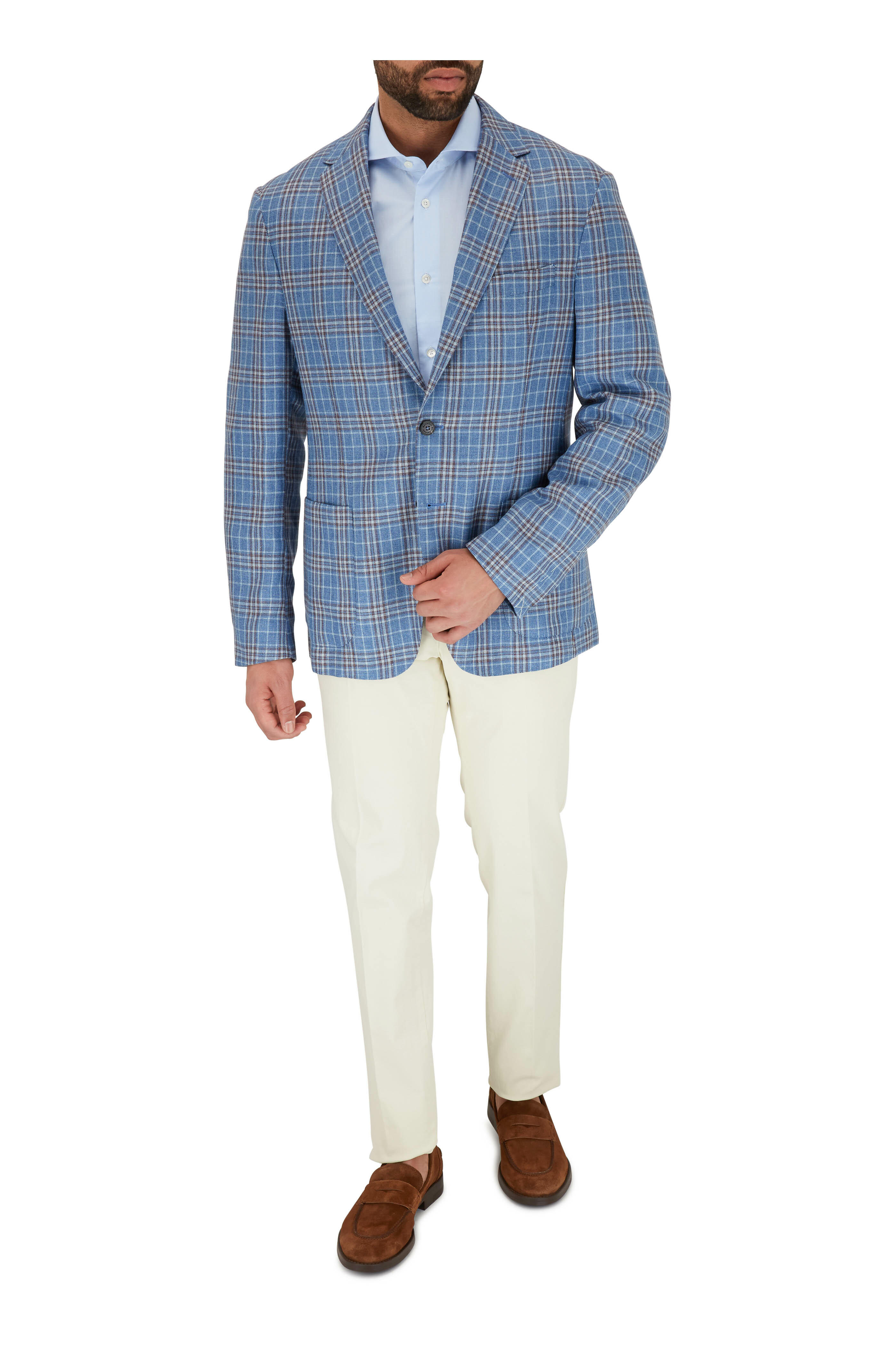 Notched lapels. Two button closure. Lower patch pockets; chest welt pocket. Double vent. Made in Italy. 42% silk, 30% flax, 28% virgin wool; partially lined. Dry clean.