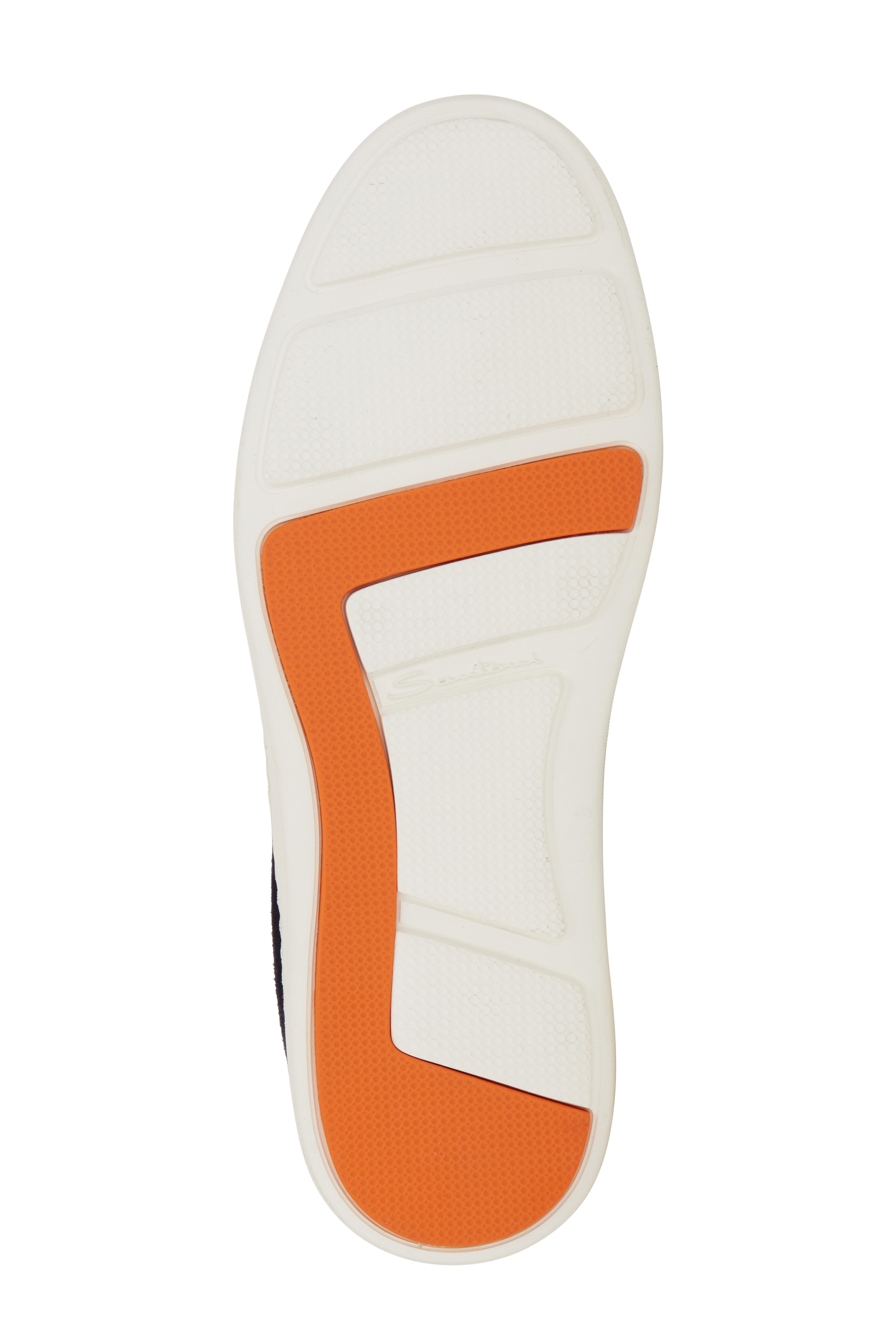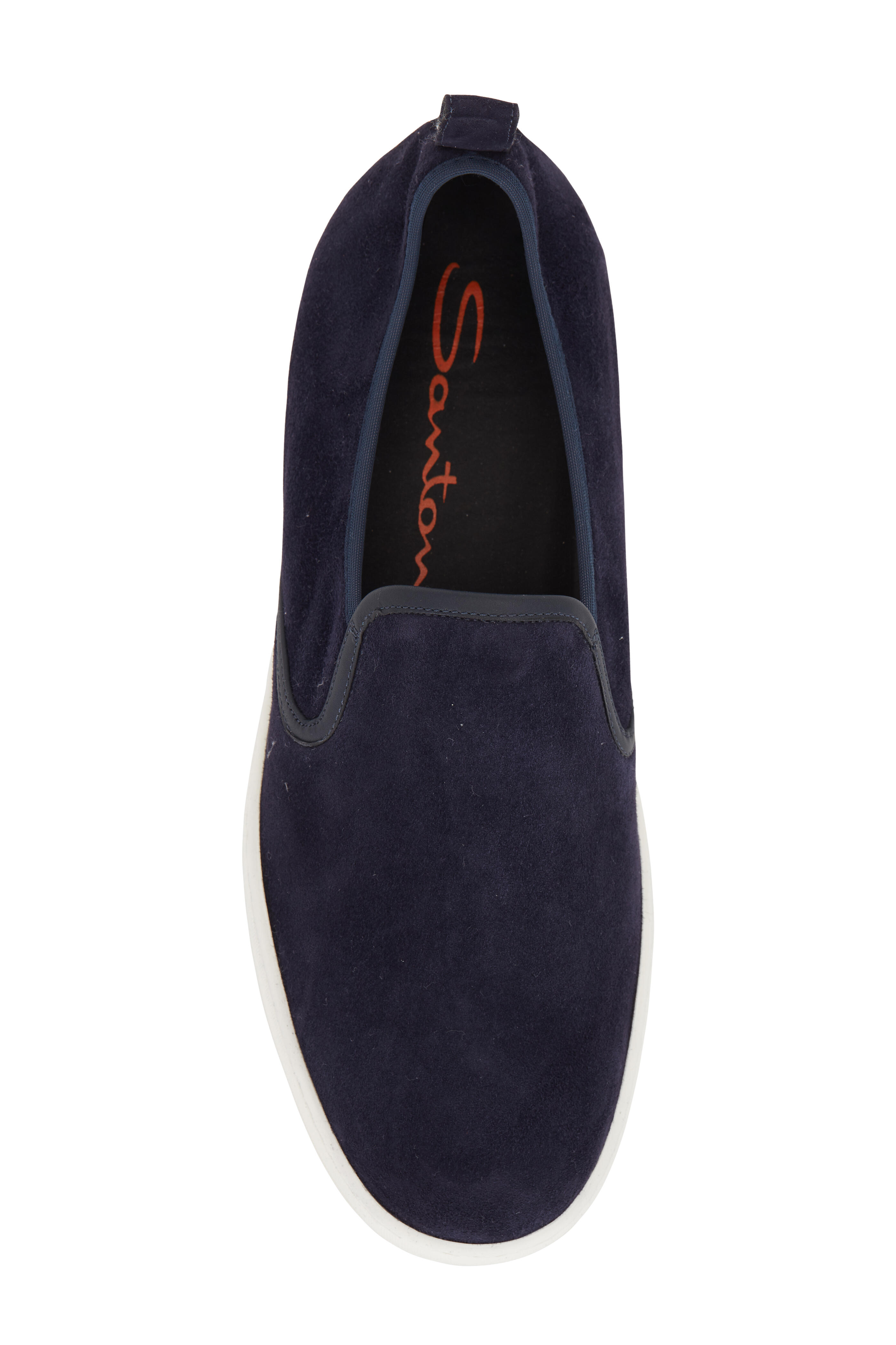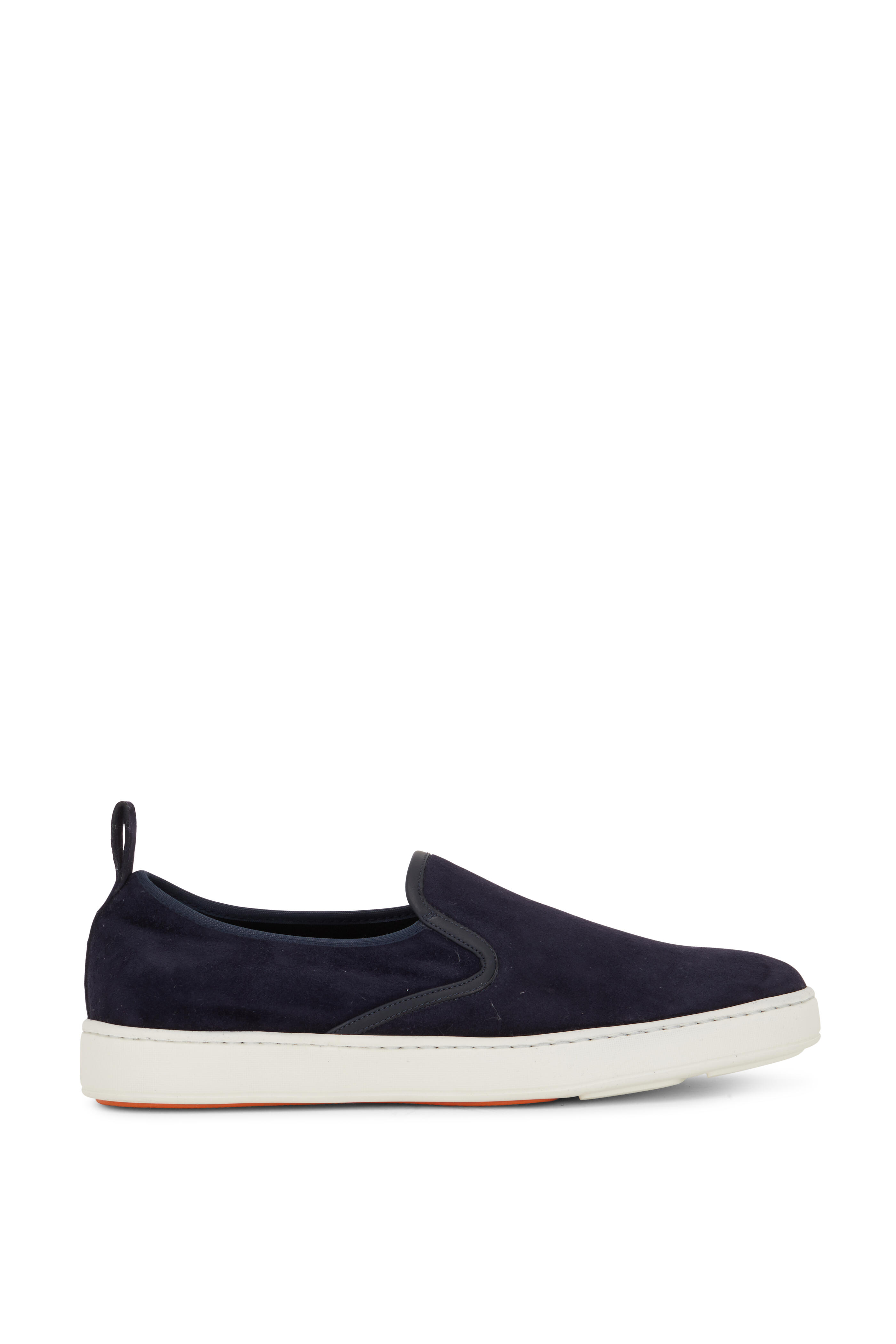 Calfskin suede with leather trim upper. Almond toe. Elasticized sides. Pull-tab at back heel. Mesh lining, cushioned insole. Rubber sole. Made in Italy.