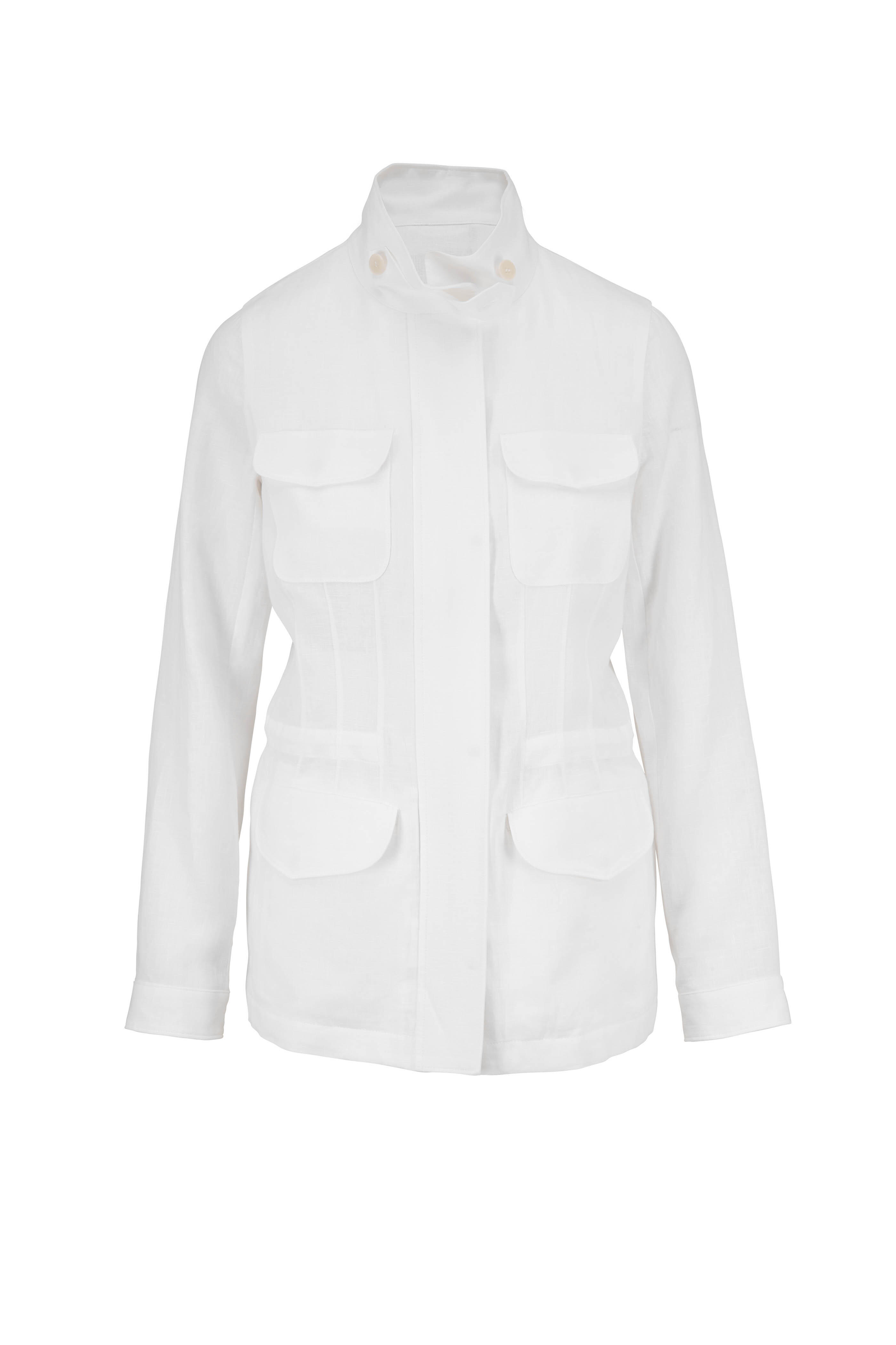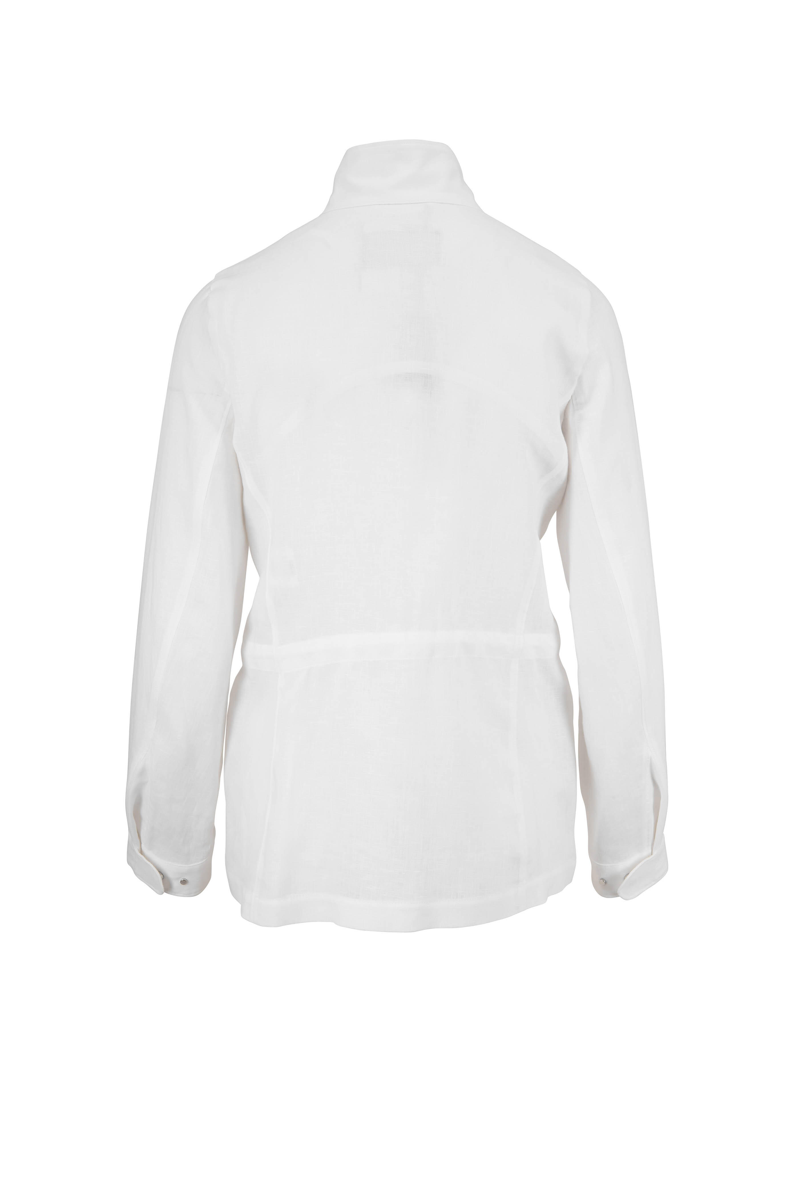 Stand collar; button tab detail. Concealed two-way zip; concealed snap placket. Two button adjustable snap cuffs. Lower flap pockets; chest flap pockets. Made in Italy. 100% linen. Dry clean.