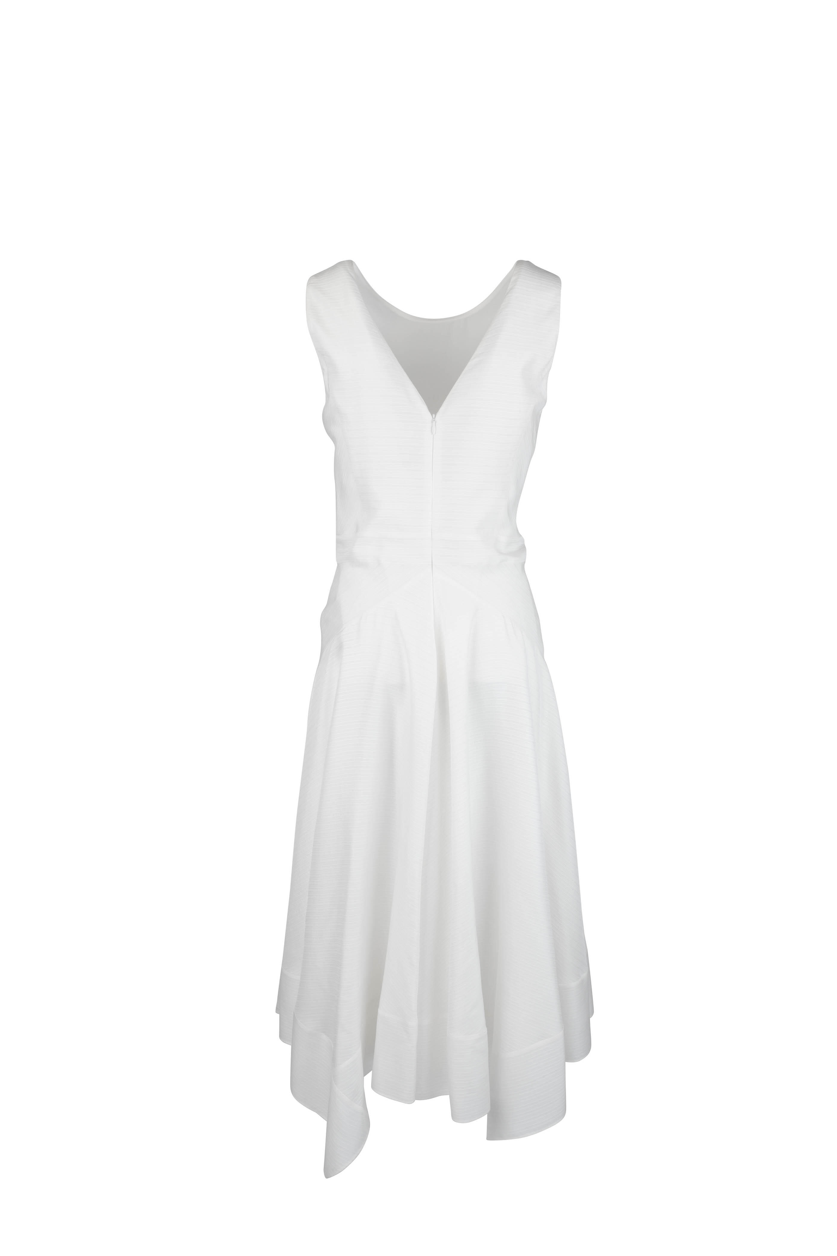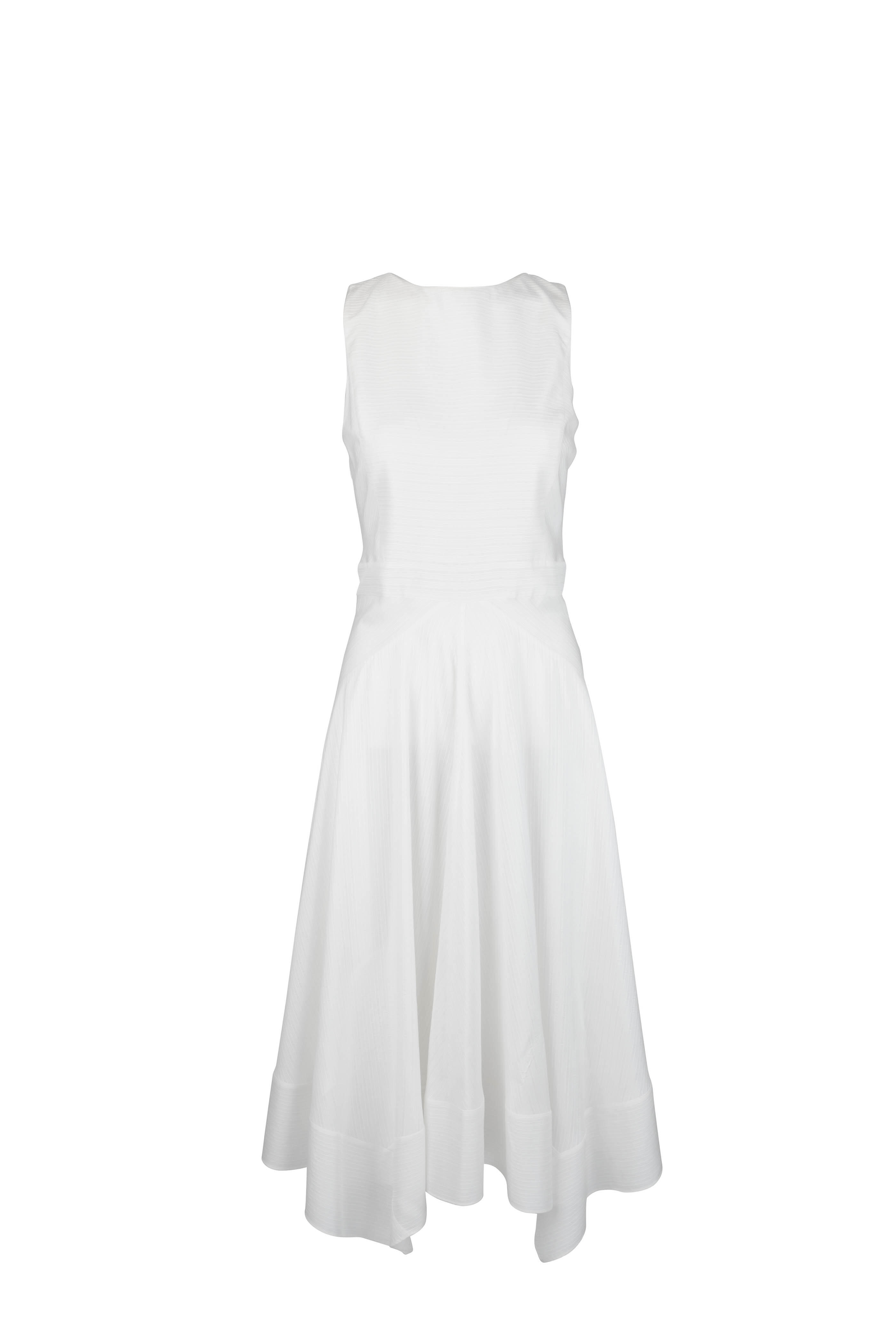 Scoop neckline. Concealed back zip closure. Handkerchief hem. Made in Italy. Shoulder to hem: 50". 100% silk; lining: 100% silk. Dry clean.
