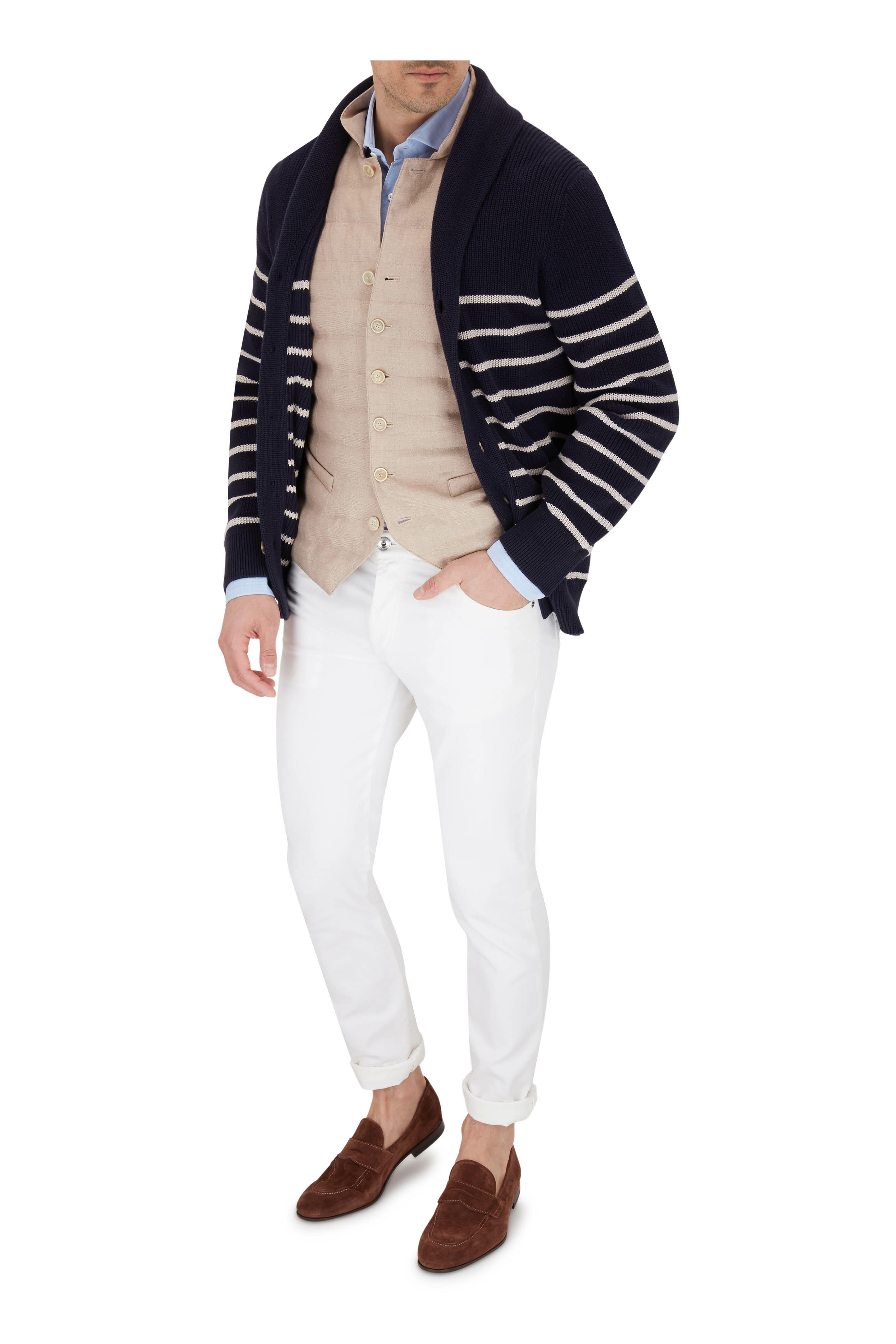 Notched lapels. Front button placket. Lower welt pockets. Back adjustable button tabs. Made in Italy. 100% linen; fill: 100% polyamide. Dry clean.