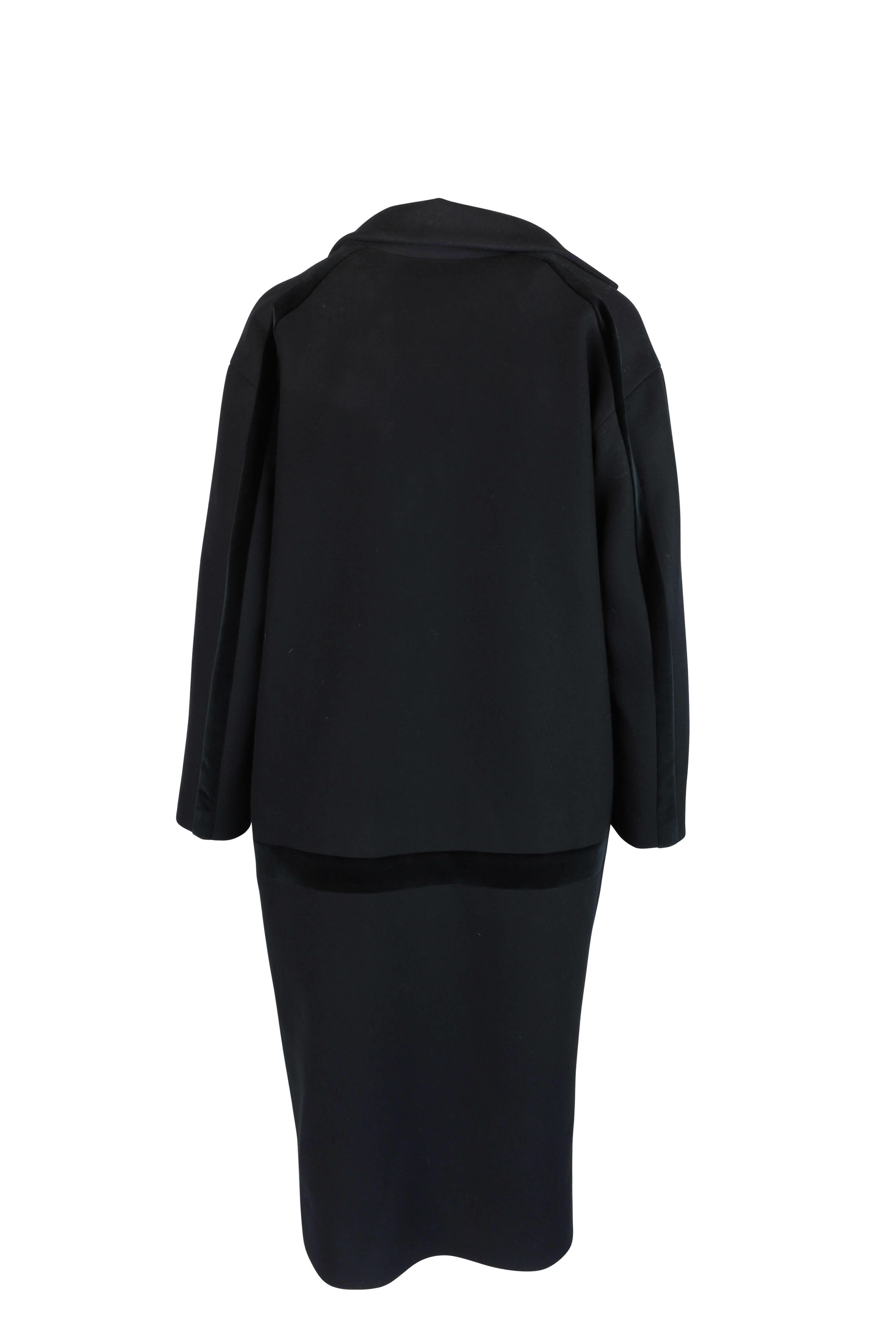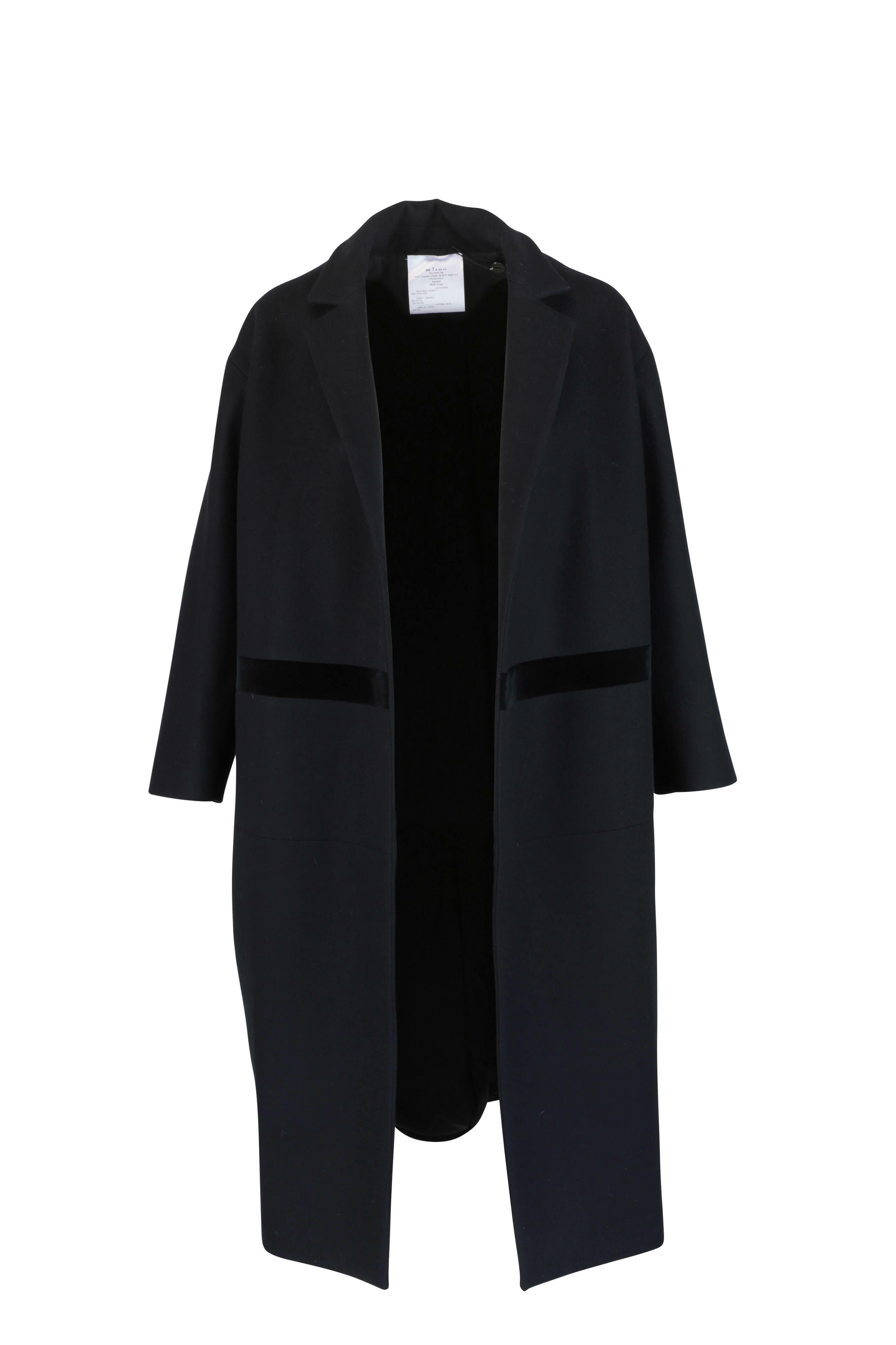 Notched lapels. Open front. Side slip pockets. Straight hem. Made in Italy. 100% fleece wool; lining: 100% silk. Dry clean.