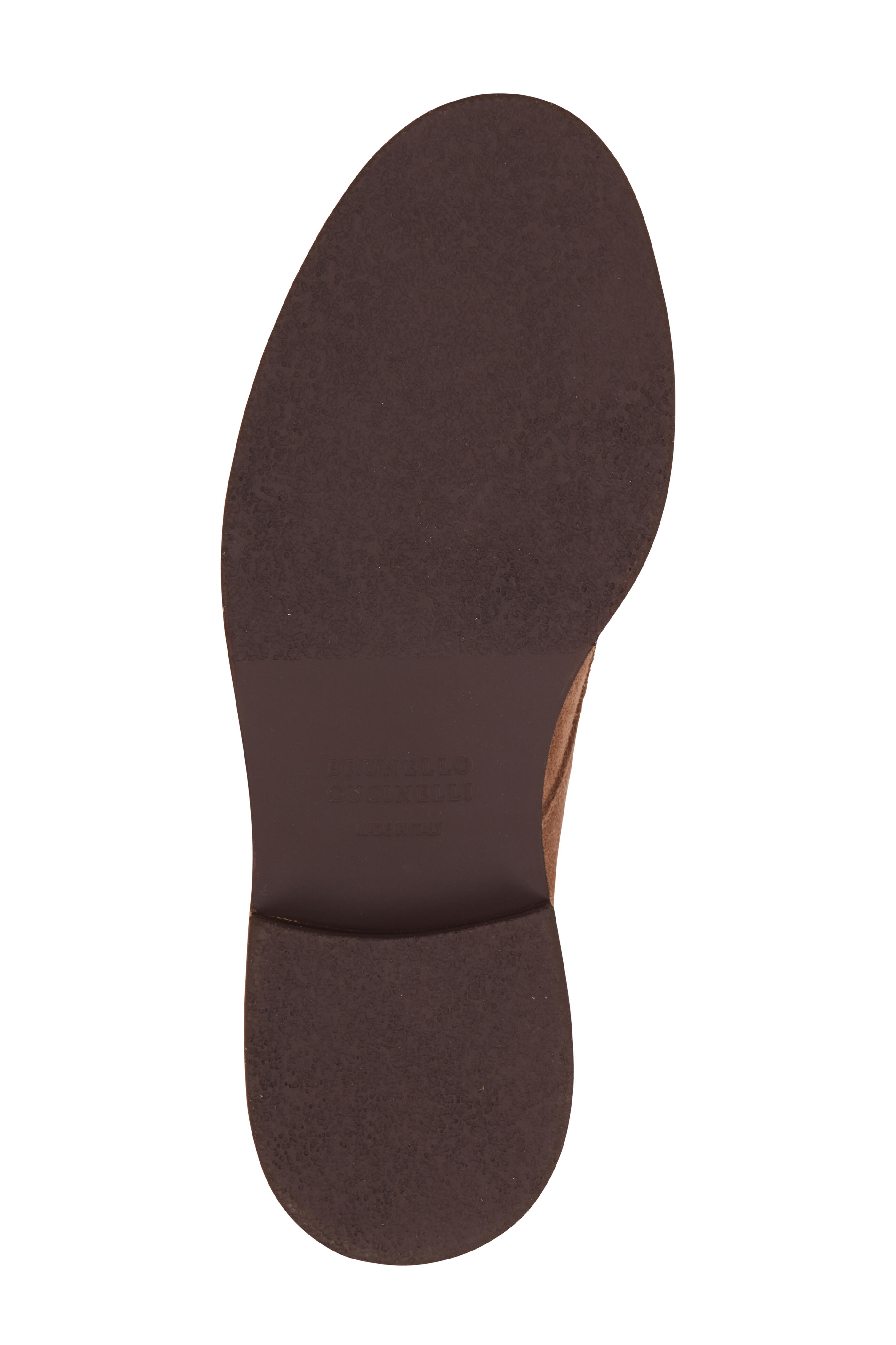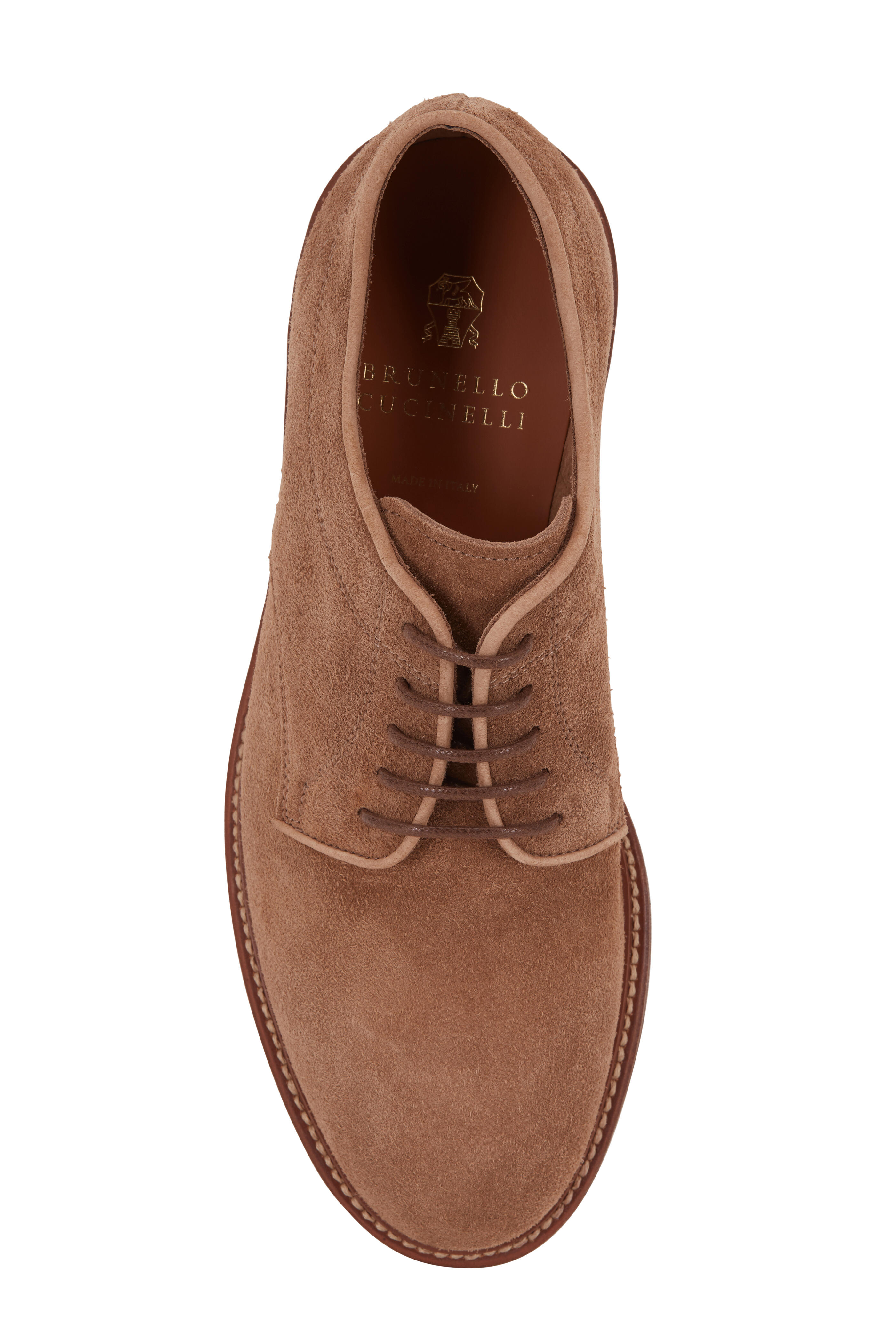 Calfskin suede upper. Almond toe. Five eyelet lace-up closure. Leather lining, cushioned insole. Stacked wooden heel. Crepe rubber sole. Made in Italy.