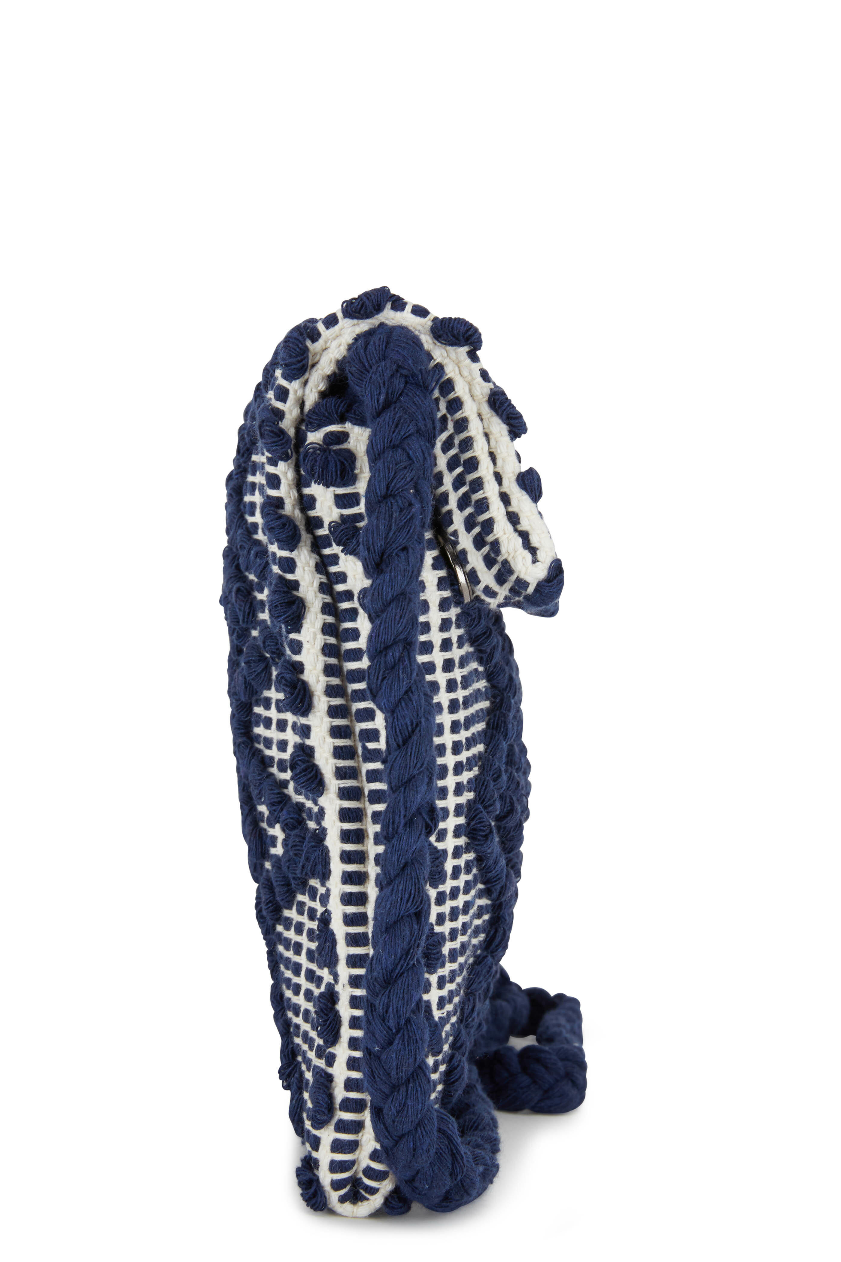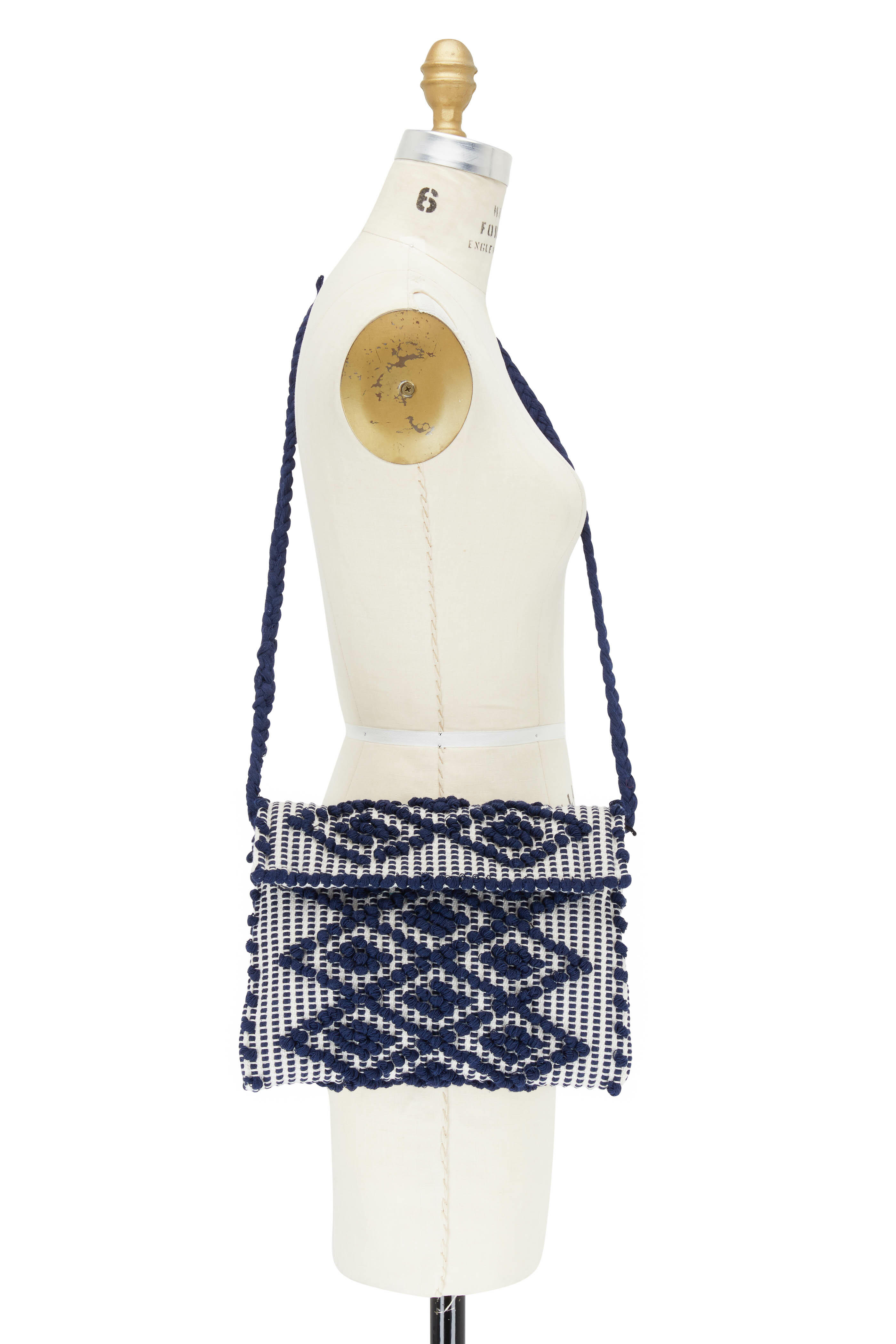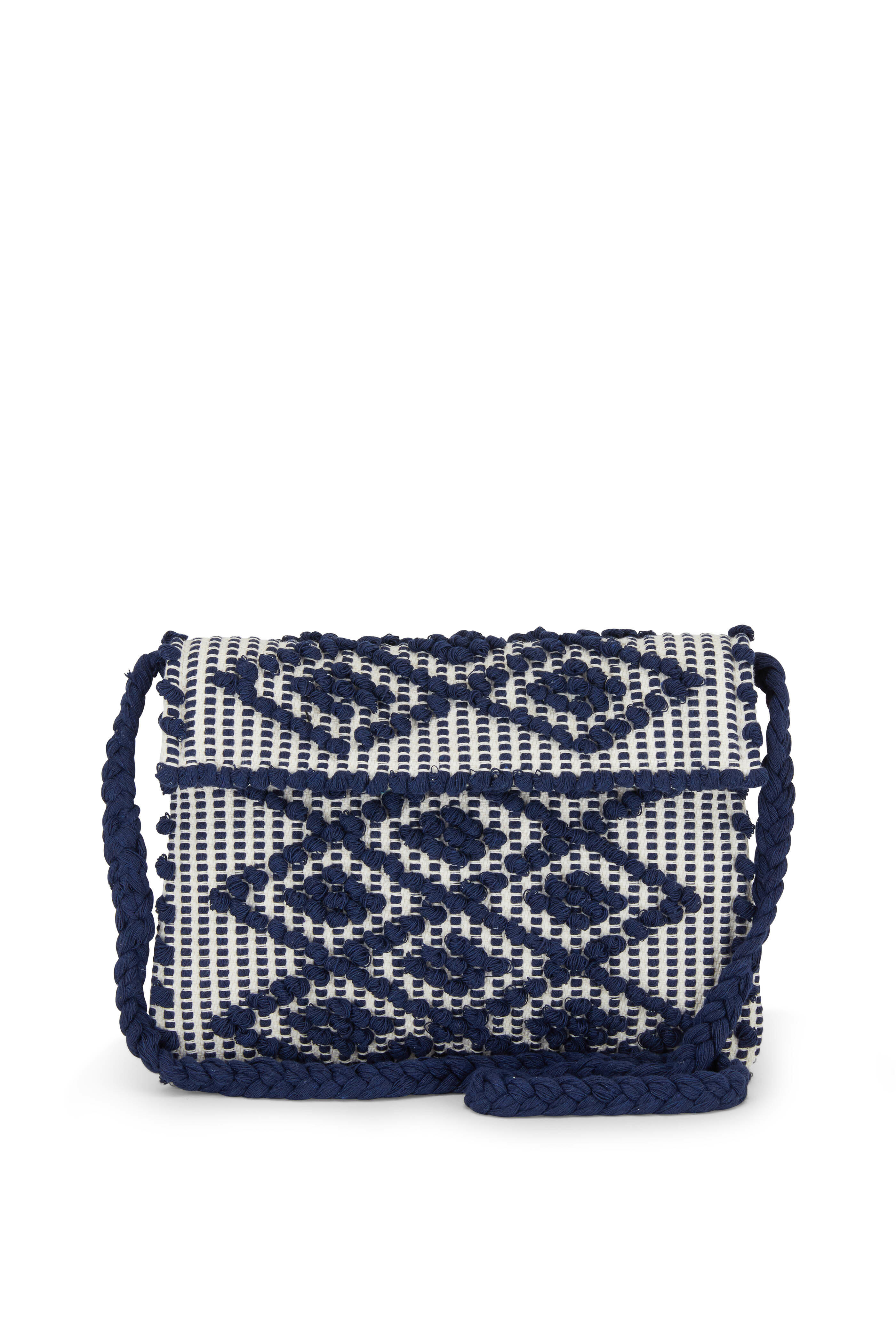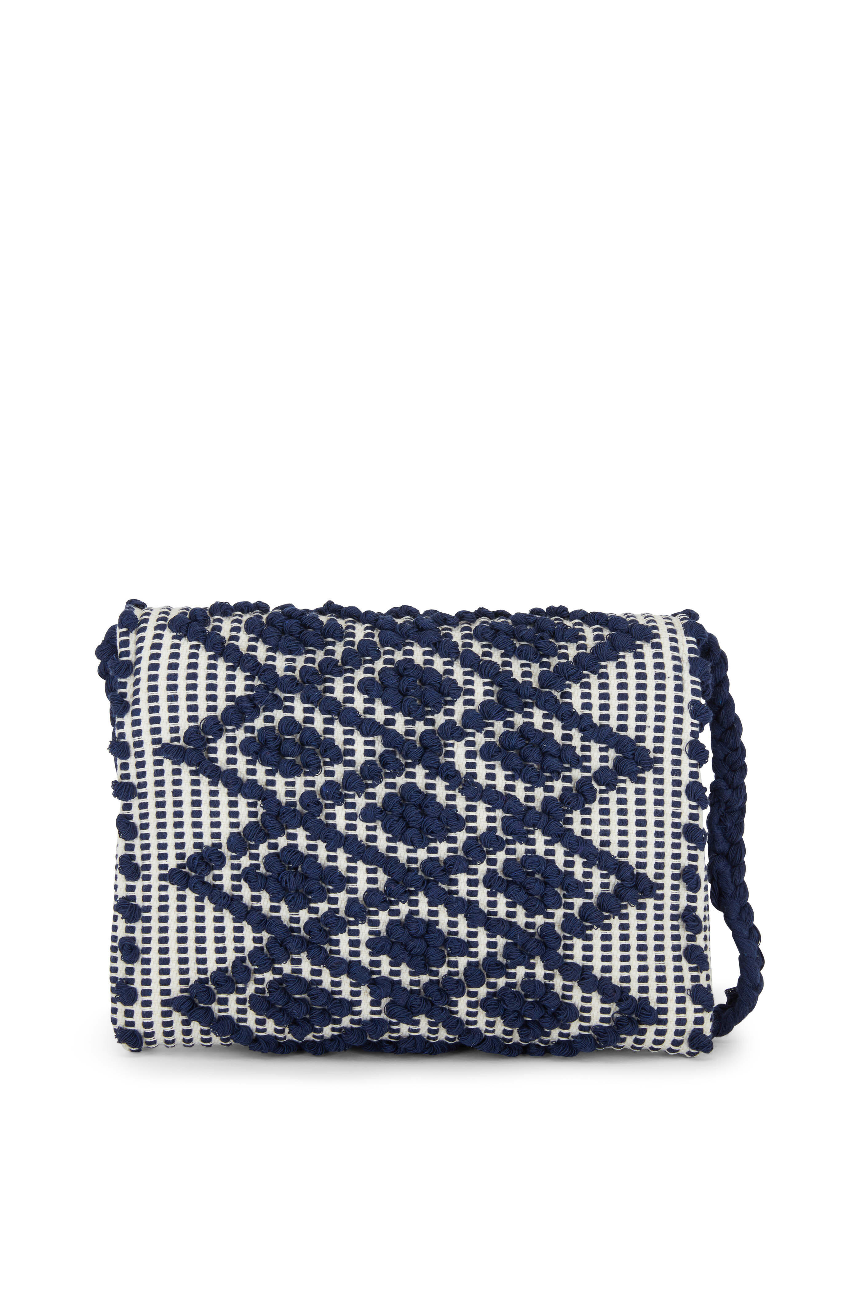 Braided strap. Flap front, two snap closure. Two interior open pockets. Lined in linen. Hand woven in Italy. Width: 11". Height: 9". Depth: 2". Strap drop: 18". 50% cotton, 50% linen.