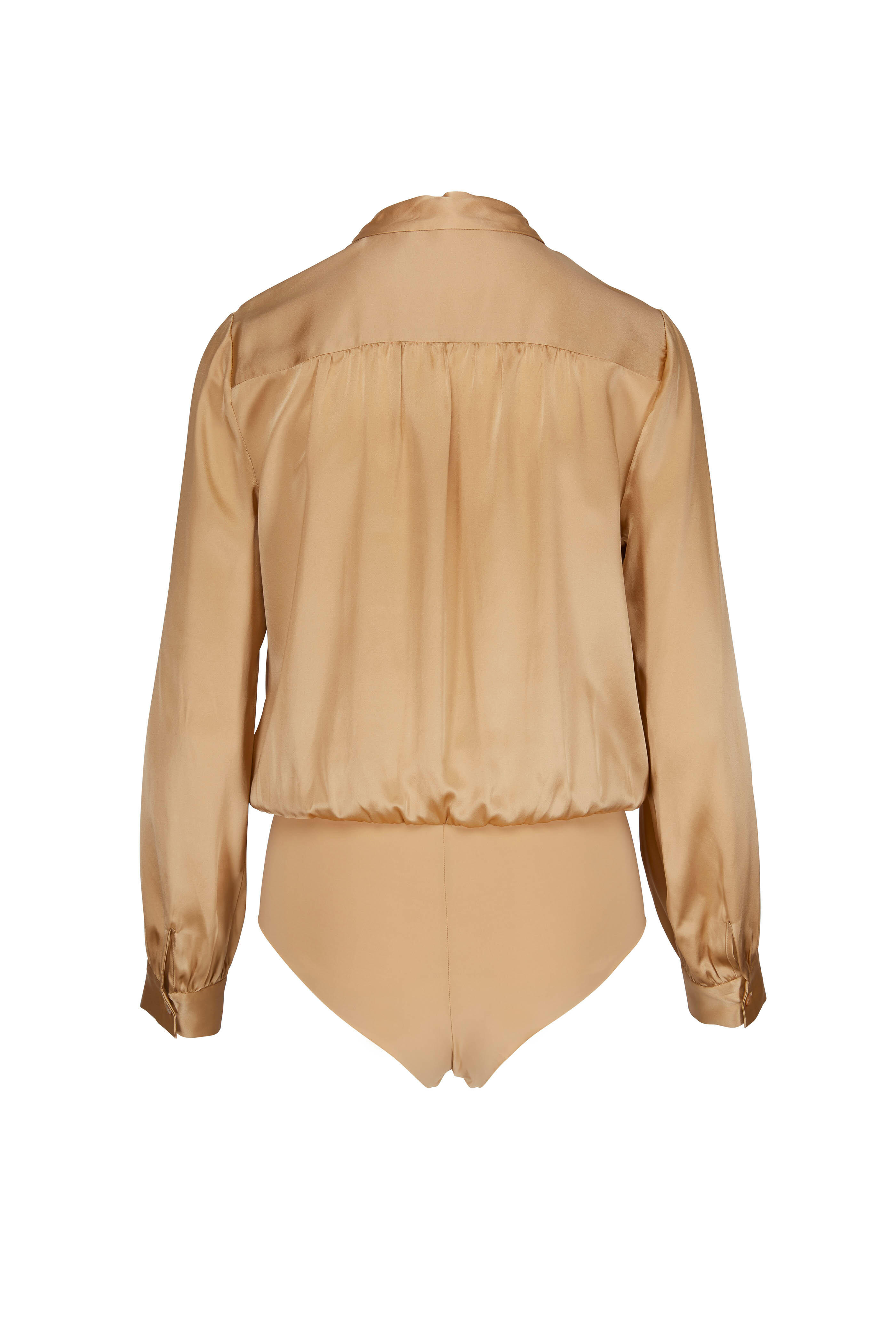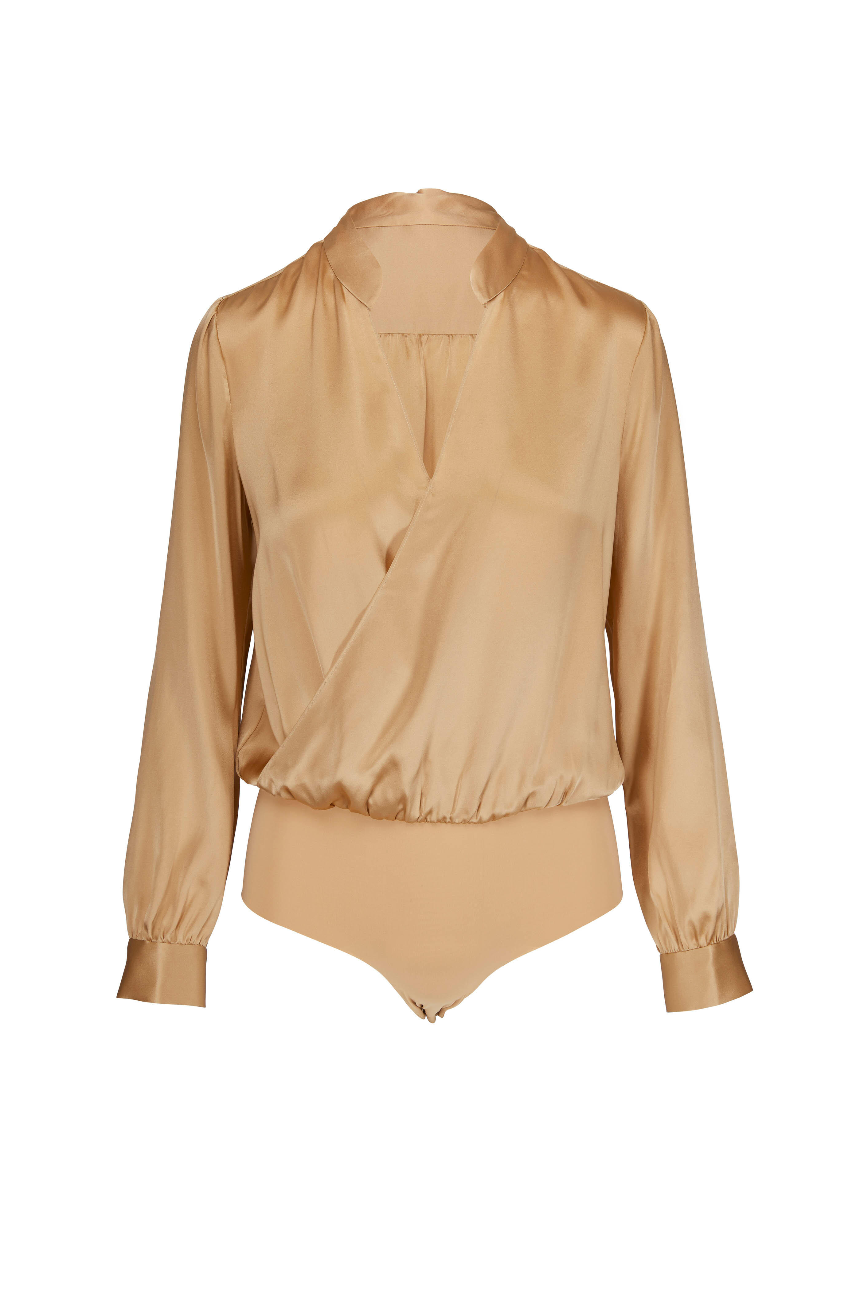 Stand collar. V-neckline with snap button closure. Single button squared cuffs. Snap button crotch. Imported. 100% silk; fabric 2: 85% nylon, 15% spandex. Dry clean.