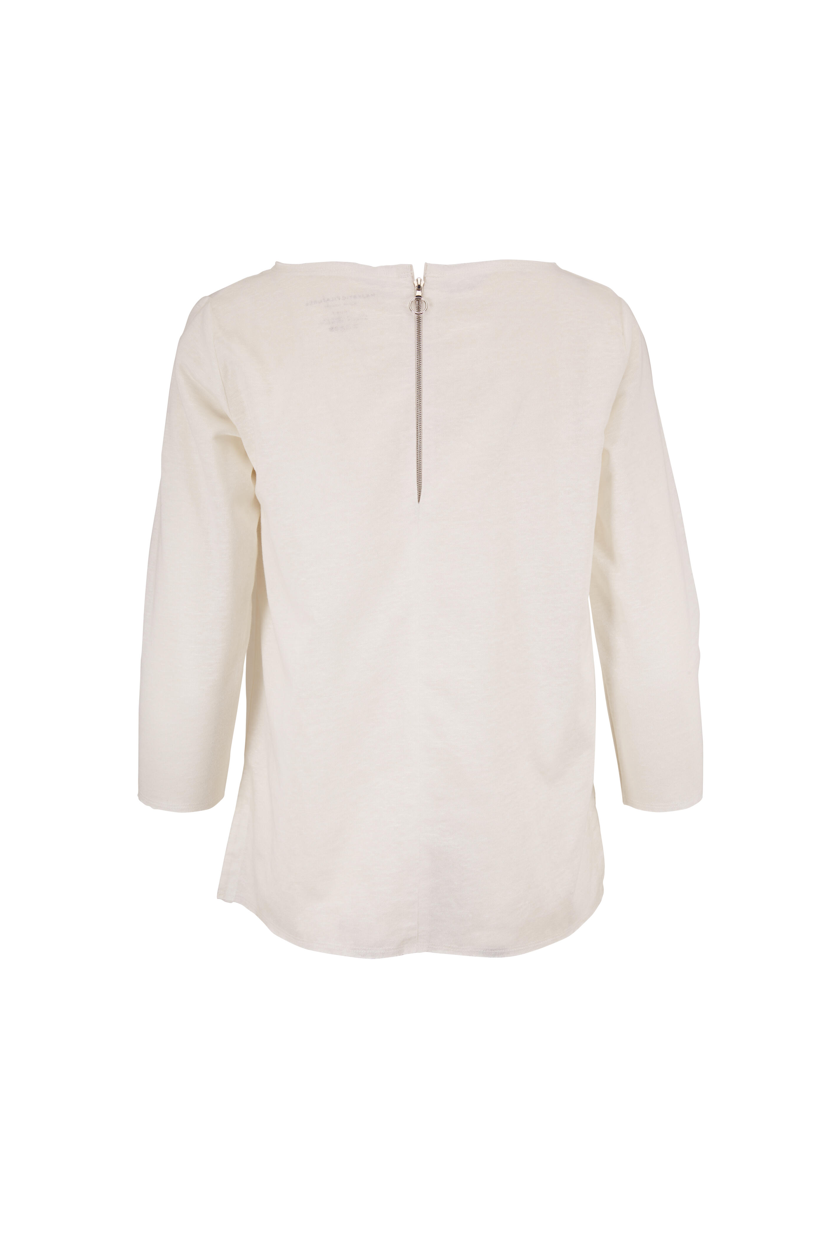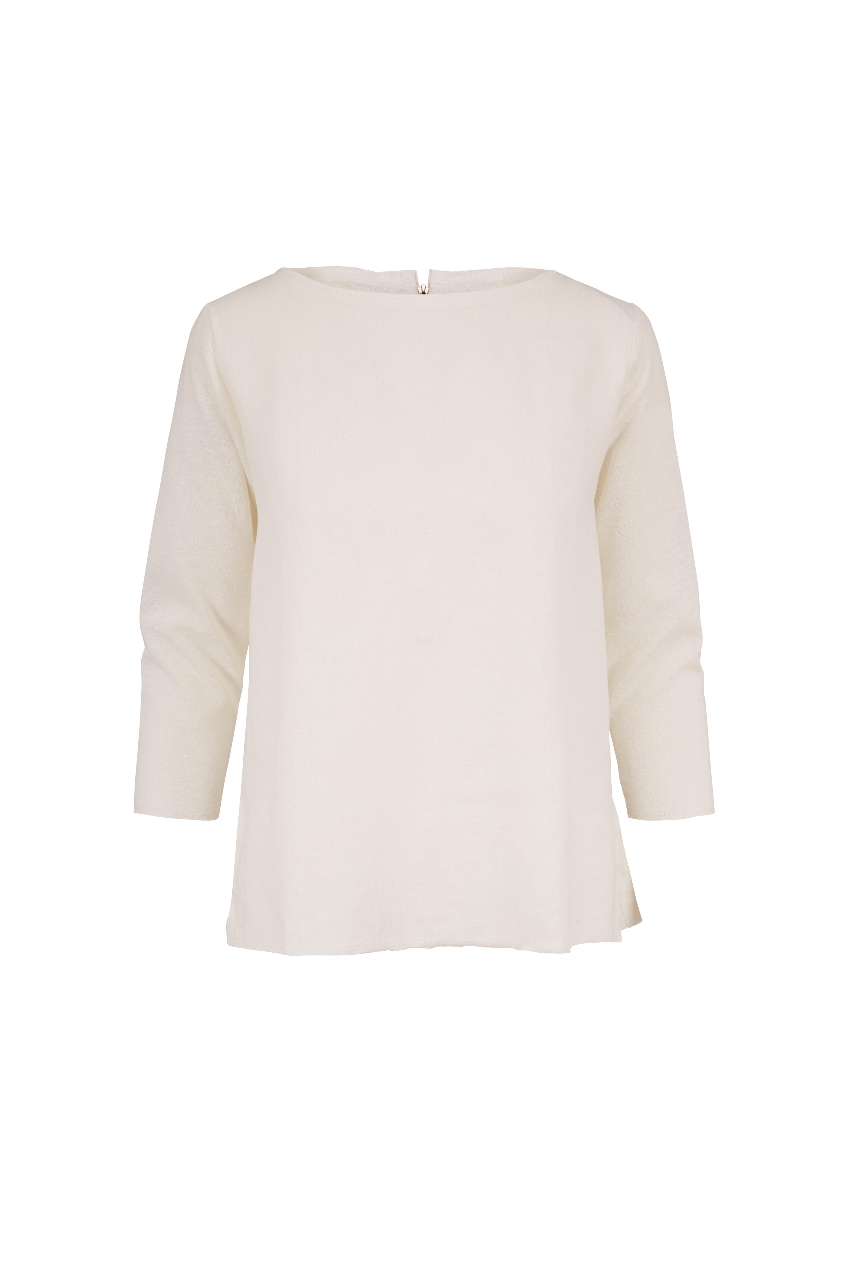Bateau neckline. Silver-toned back quarter-zip closure. Three-quarter sleeves. Vented hem. Raw edge trim. Made in Portugal. 100% linen. Machine wash.