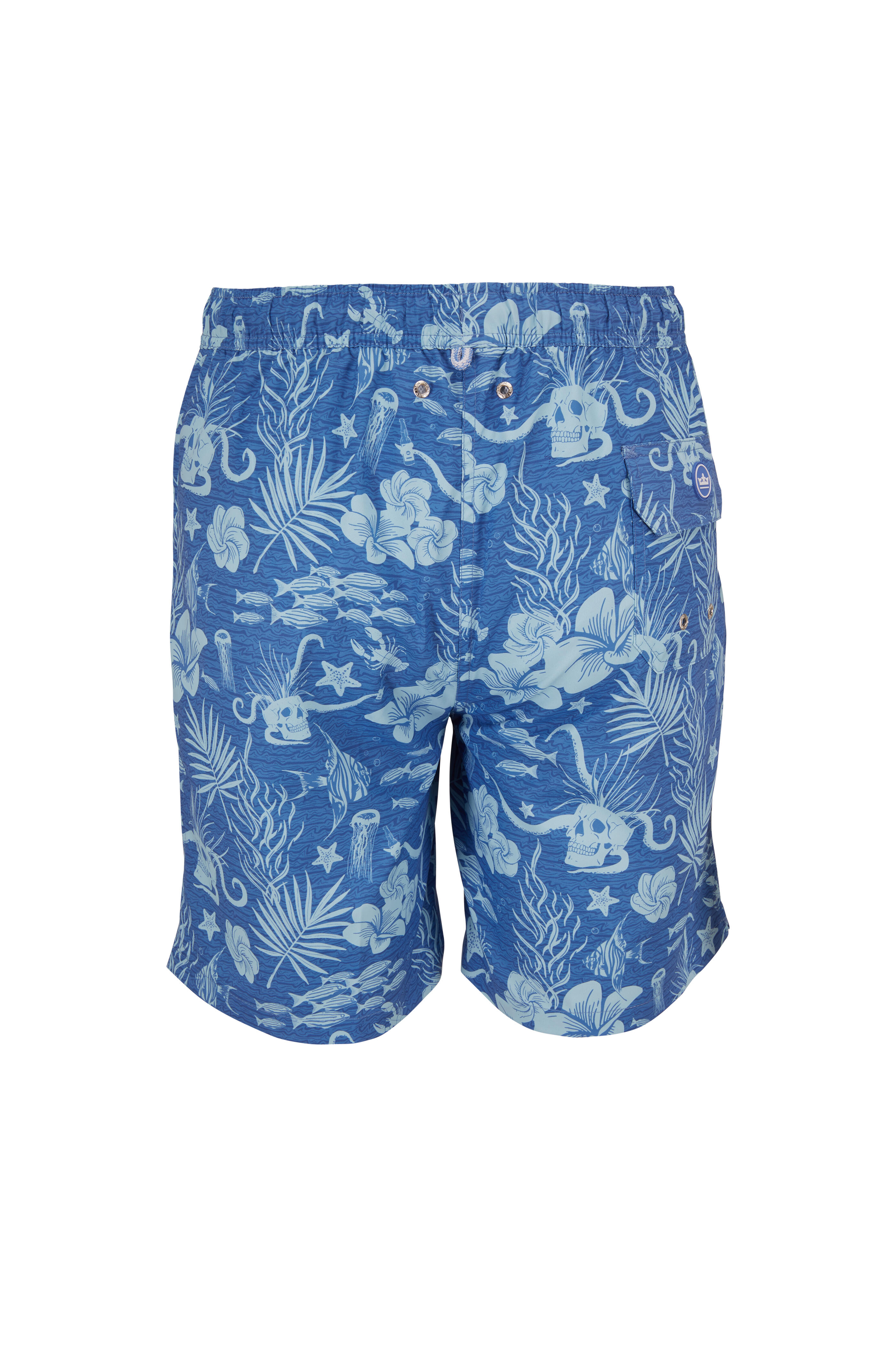Elasticized drawstring waist. Front slip pockets, one back flap snap pocket. Vented hem. Enclosed limited edition koozie. Imported. 7" inseam. 100% polyester; mesh lining. Machine wash.