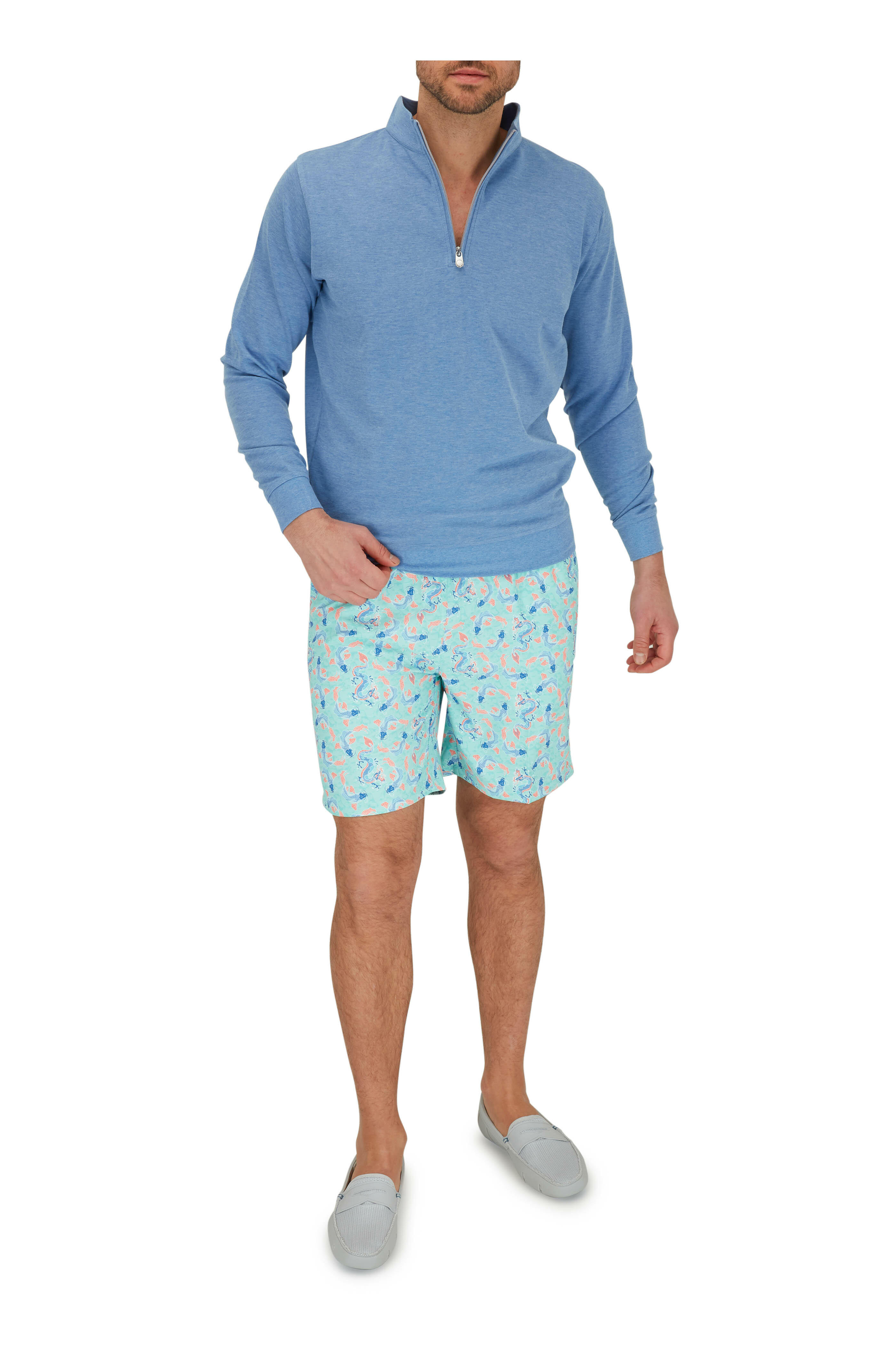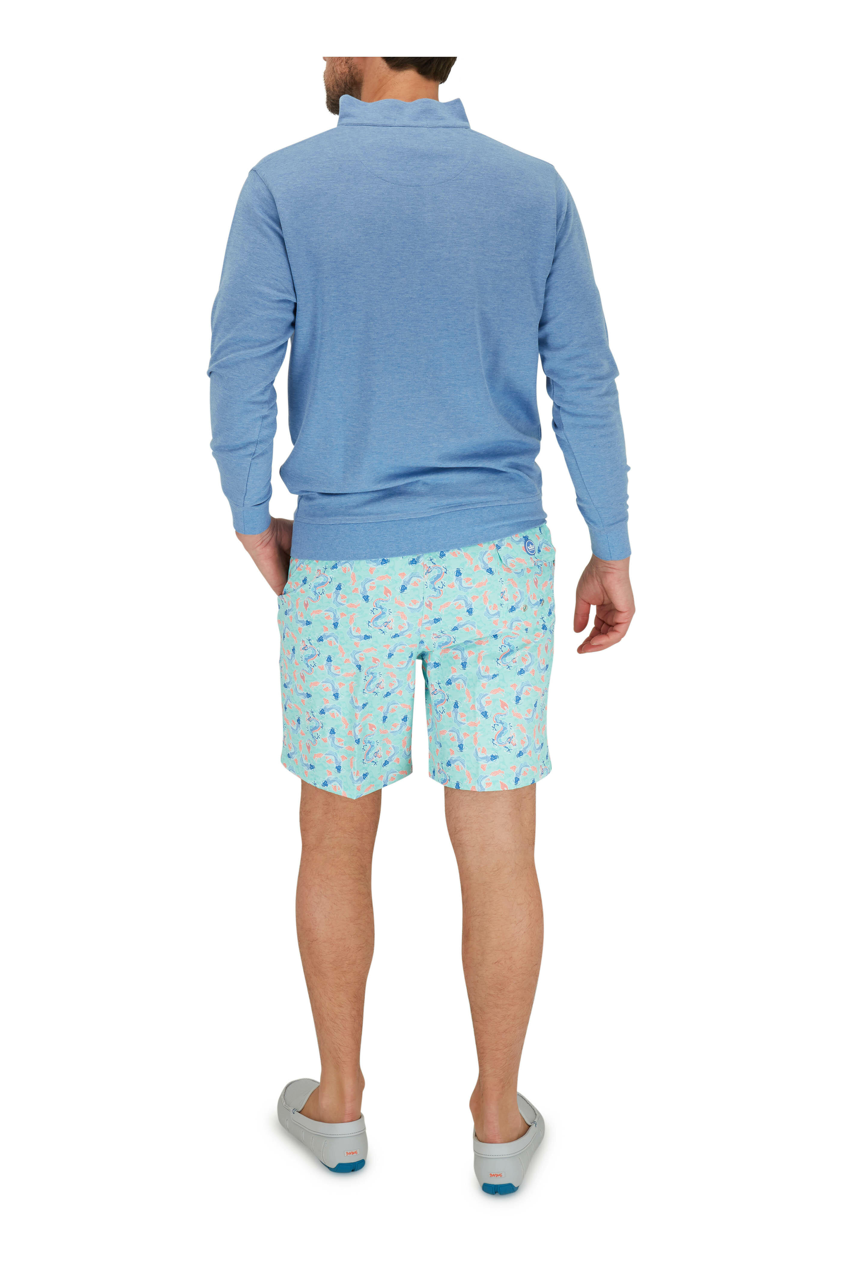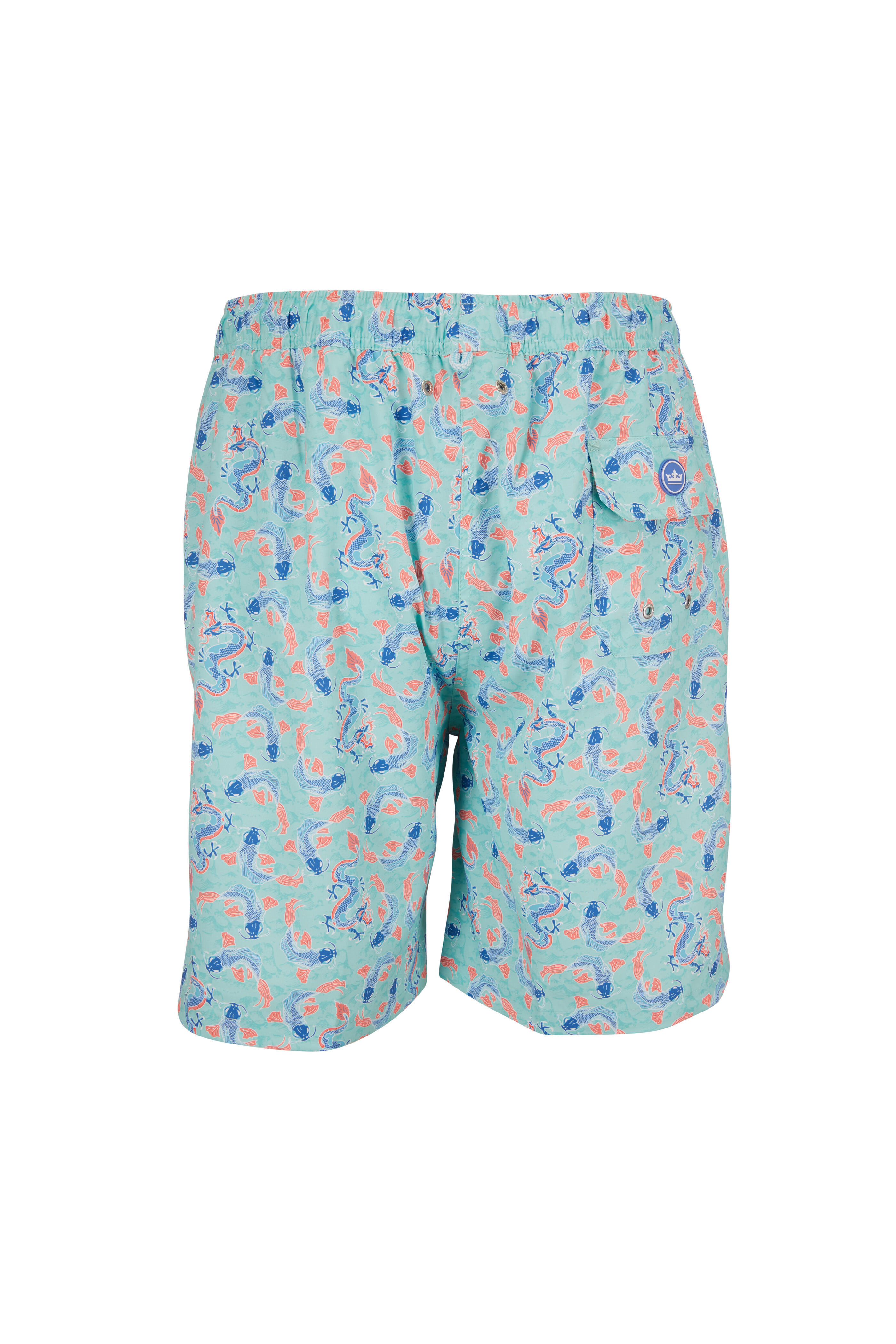 Elasticized drawstring waist. Front slip pockets, one back flap snap pocket. Vented hem. Enclosed limited edition koozie. Imported. 7" inseam. 100% polyester; mesh lining. Machine wash.