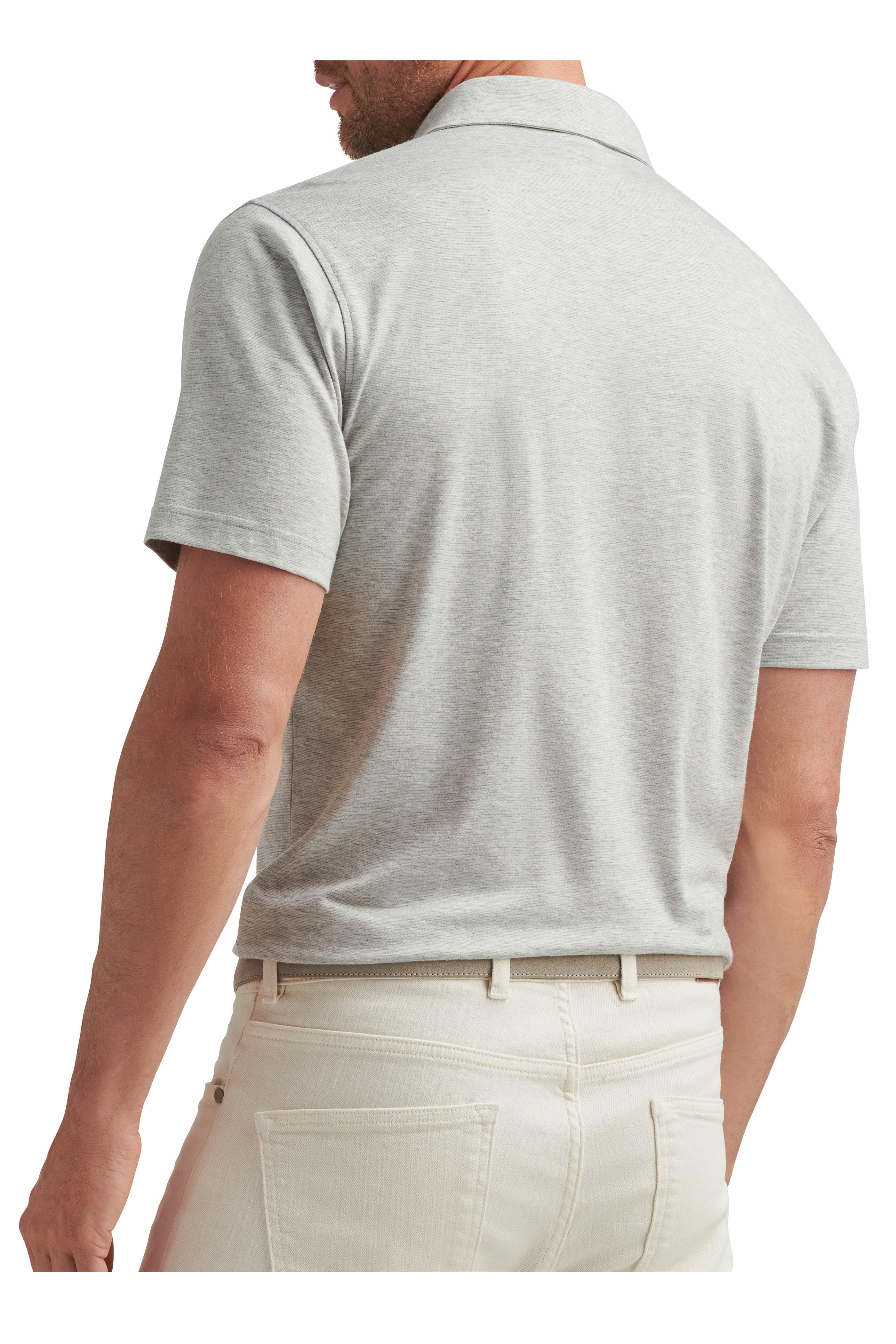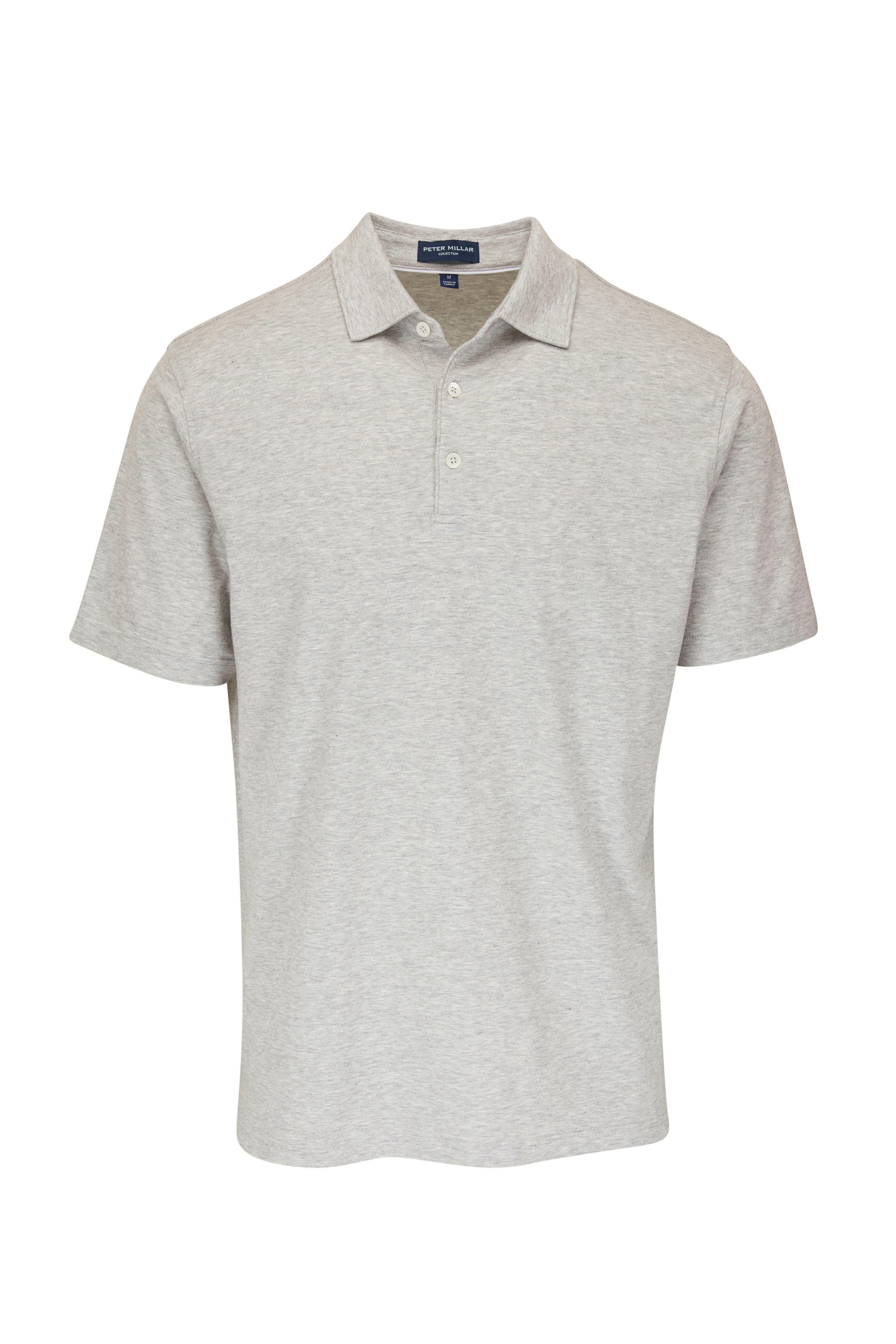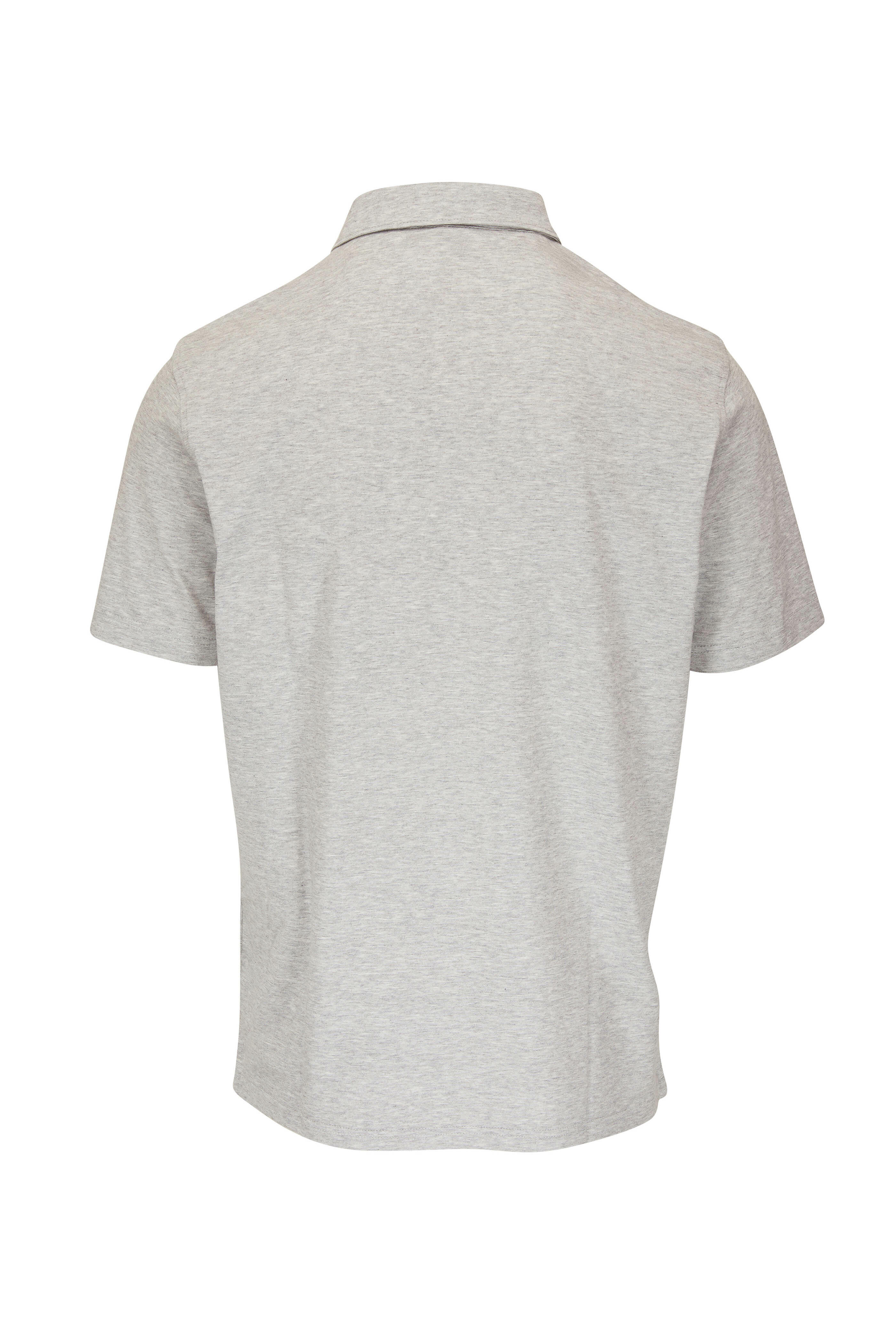 Spread collar. Three front placket. Vented hem. Imported. 50% cotton, 50% modal.