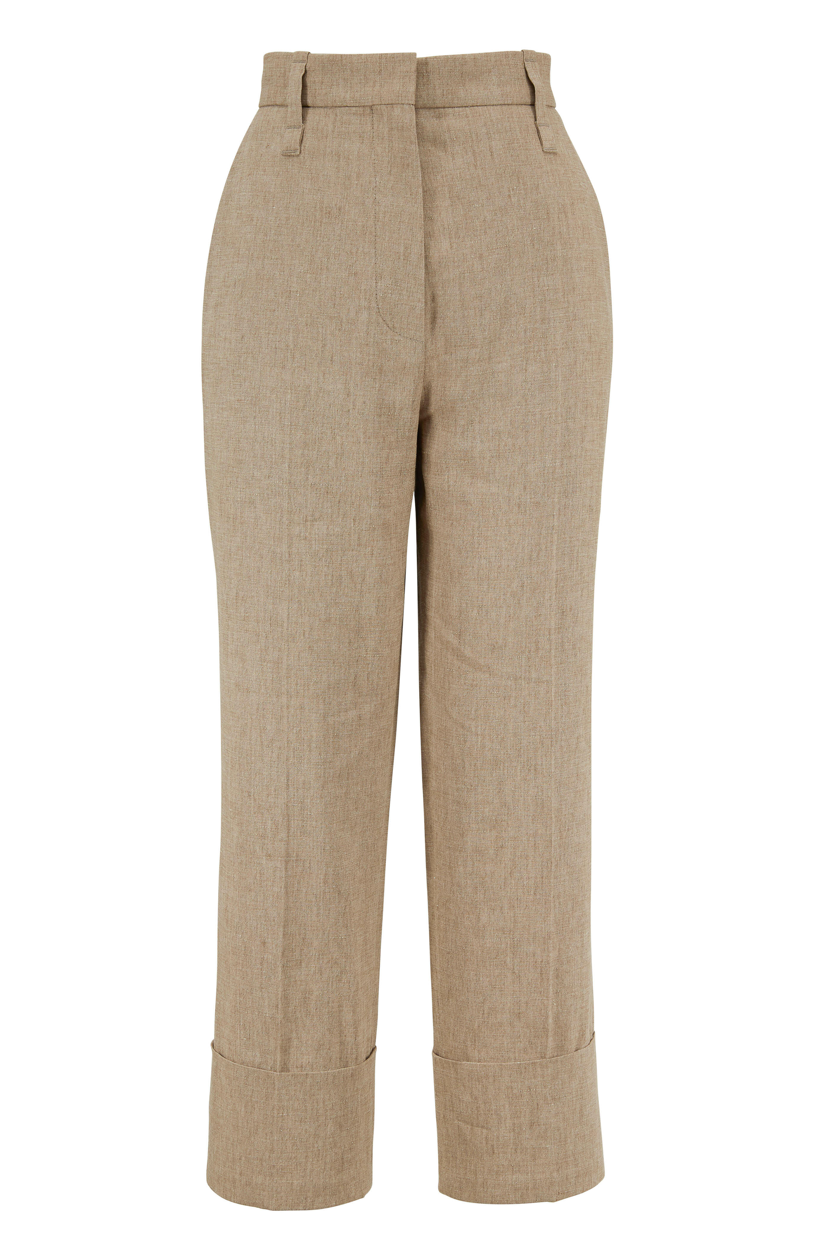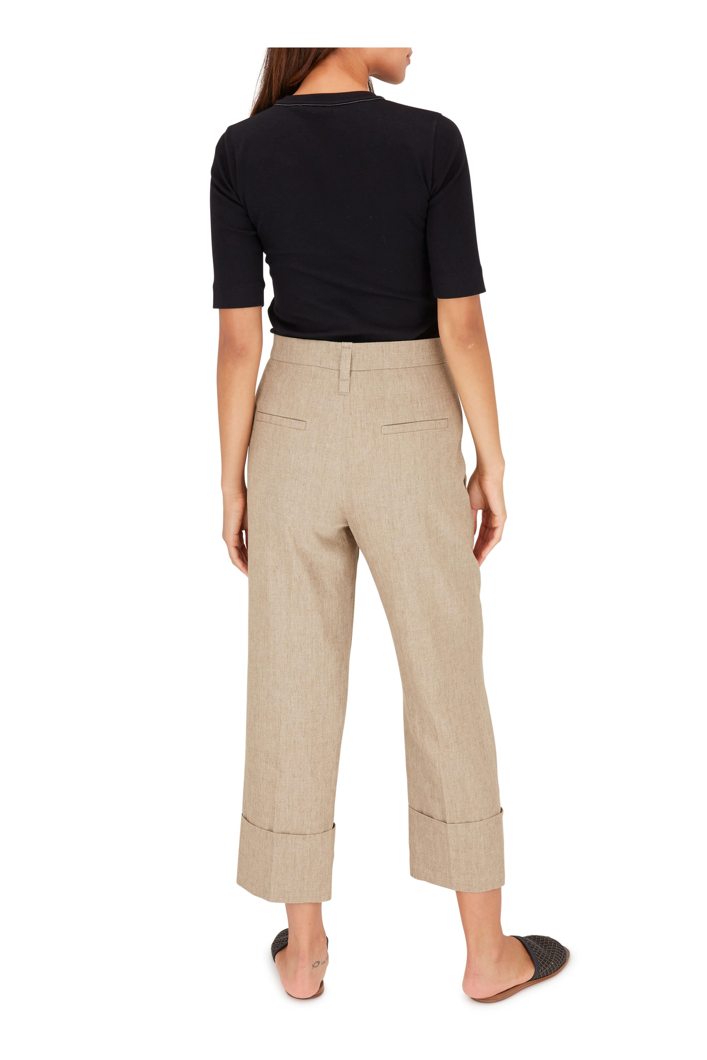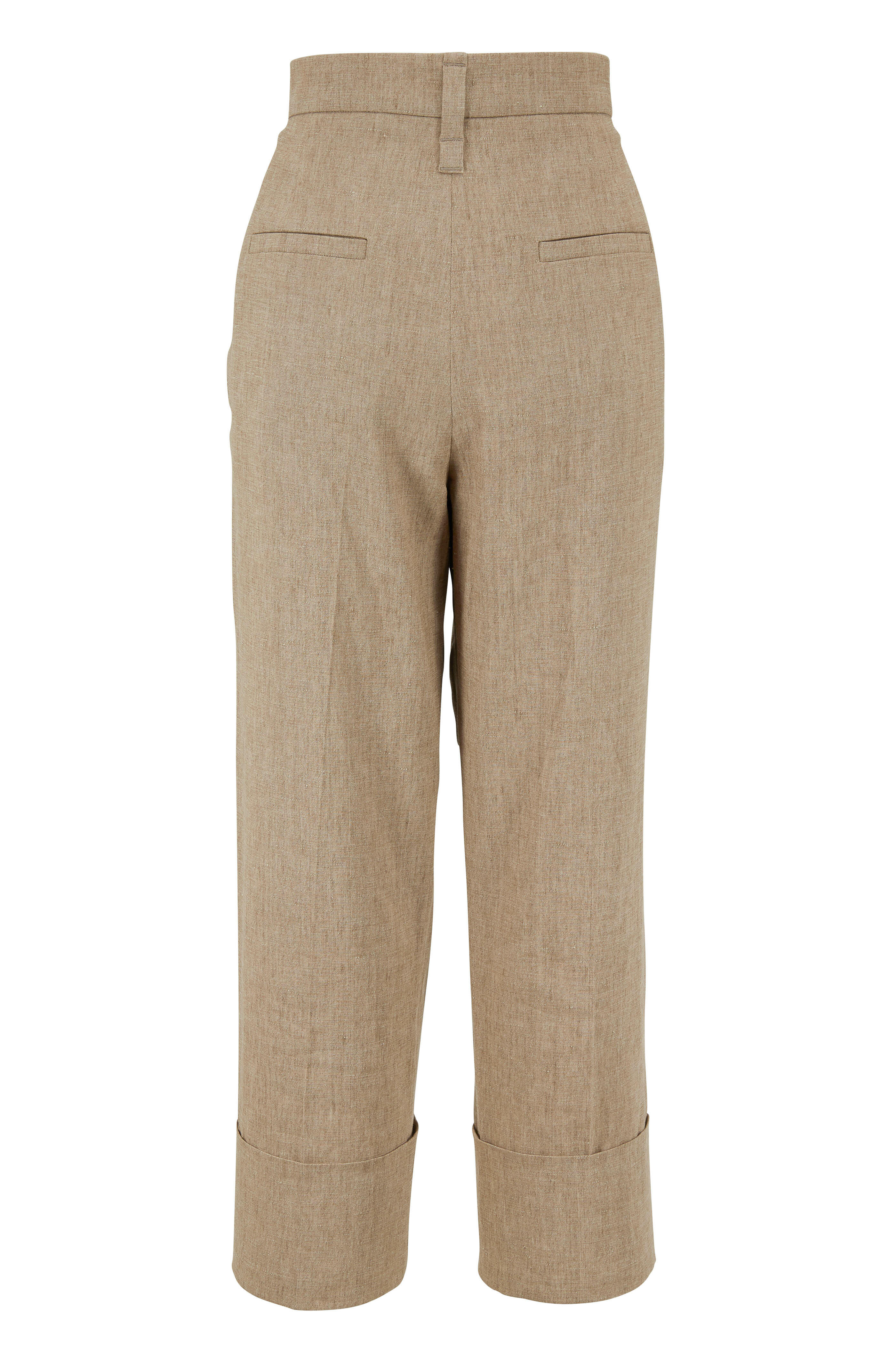 Front slip pockets; back welt pockets. Cuffed hem. Made in Italy. 24½" inseam. 90% linen, 6% elastane, 4% elastomultiester. Dry clean.