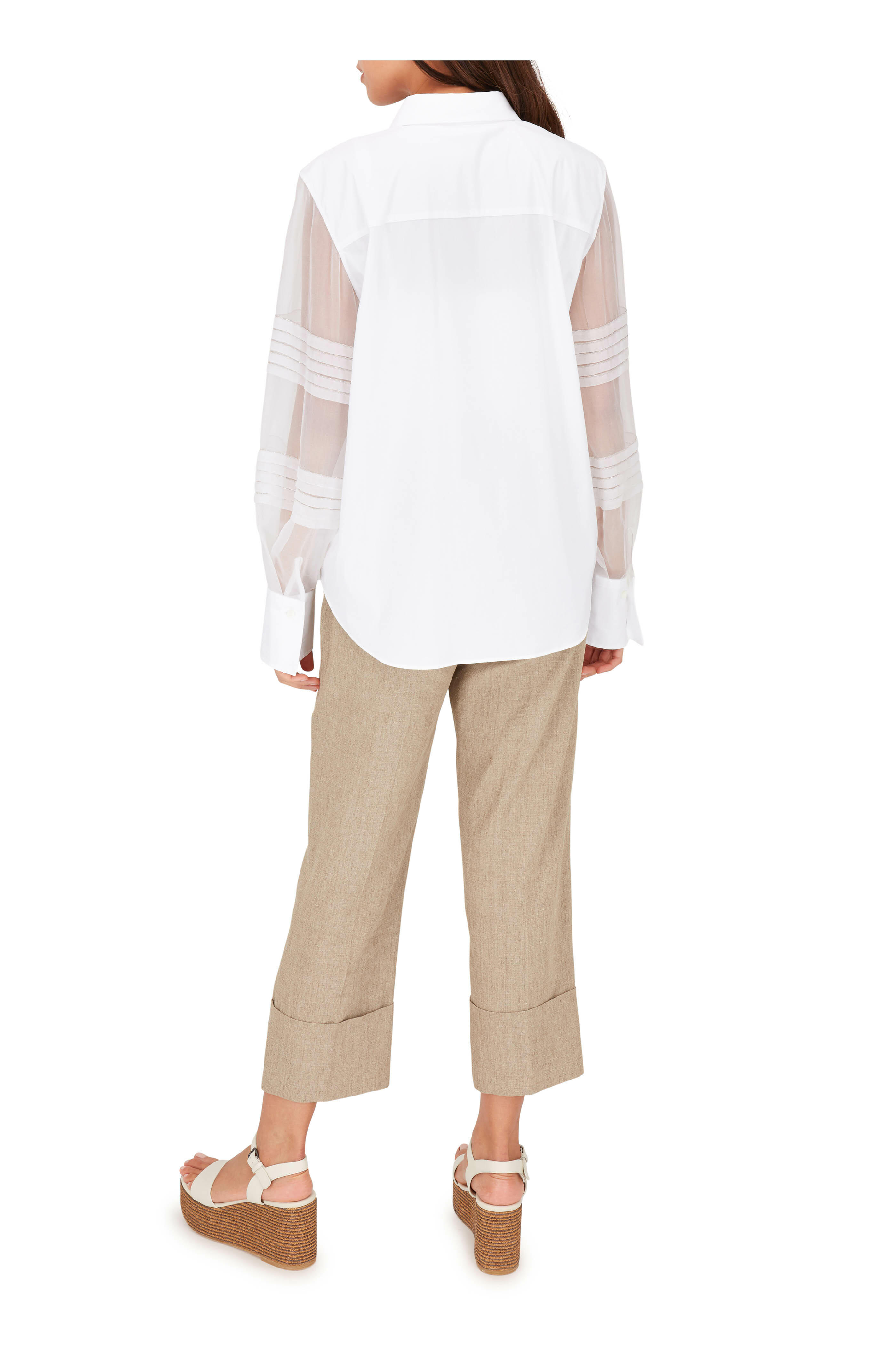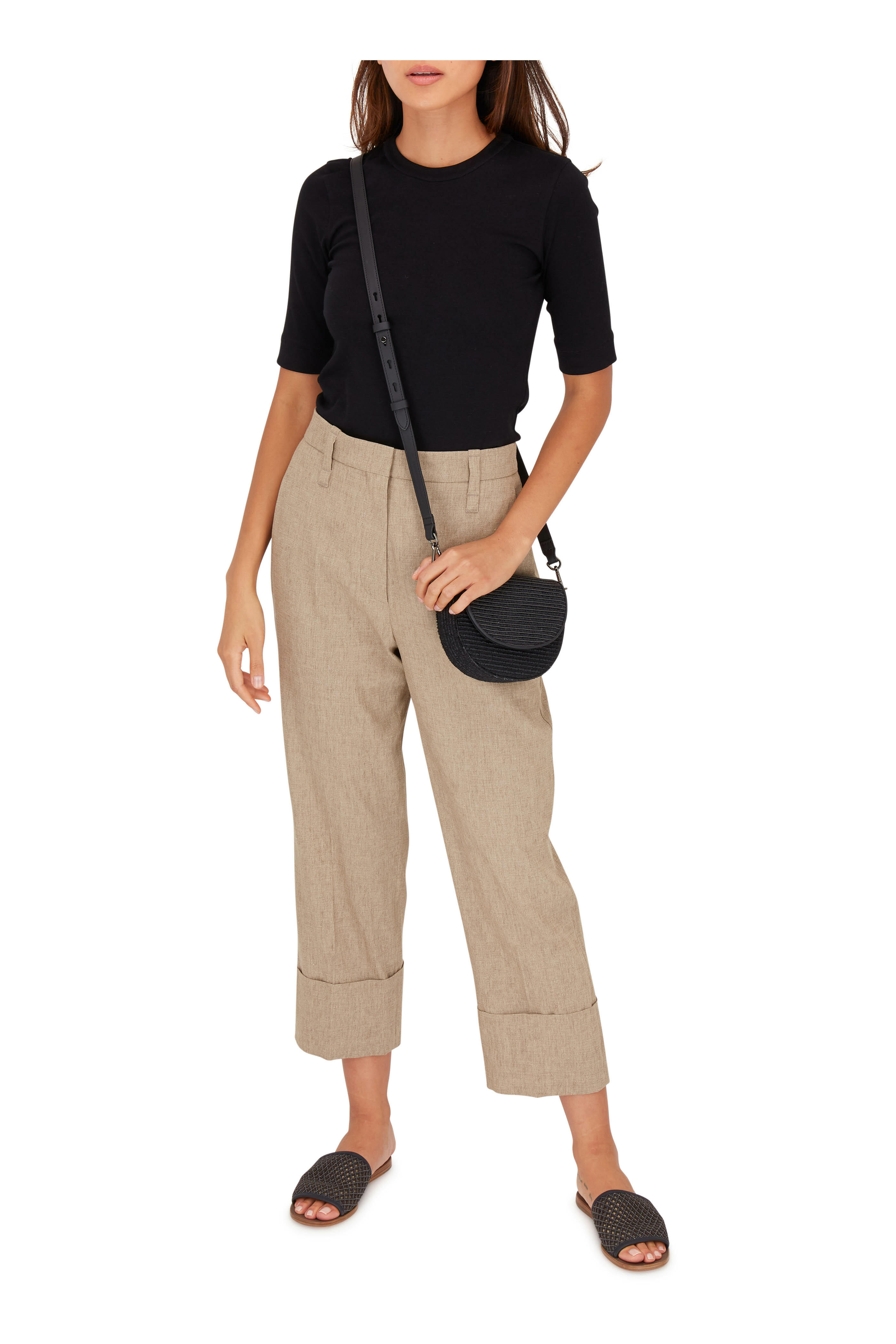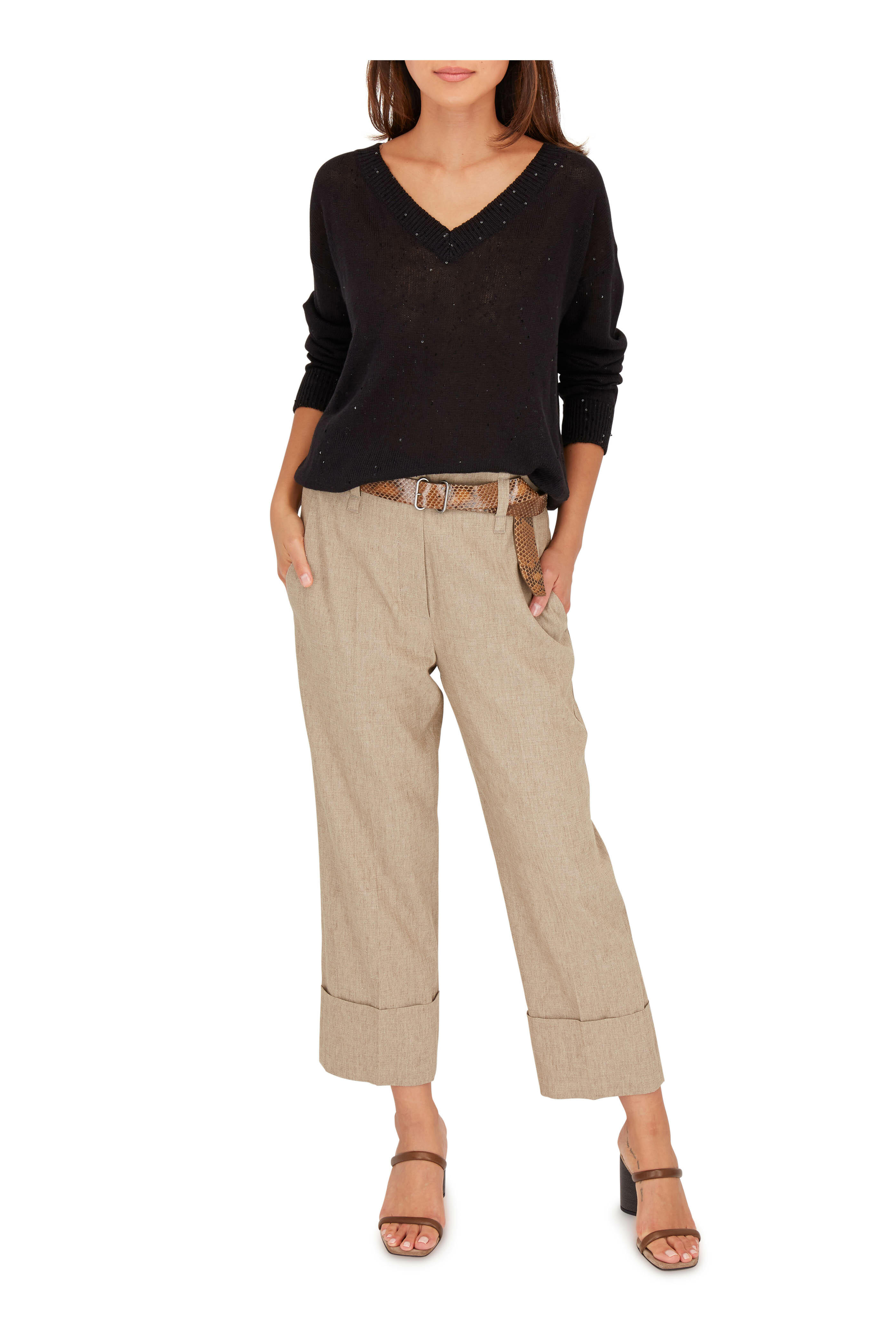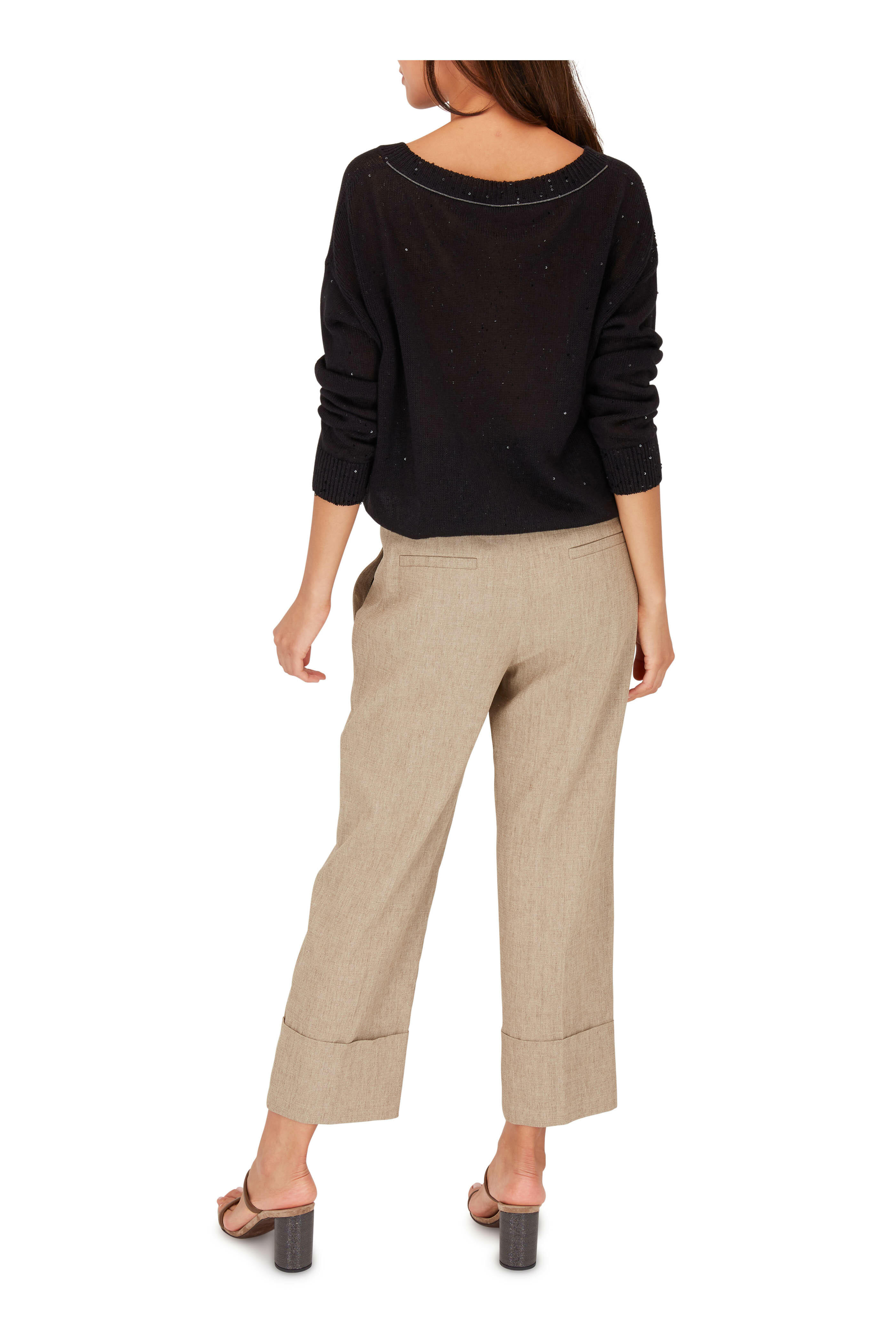 Front slip pockets; back welt pockets. Cuffed hem. Made in Italy. 24½" inseam. 90% linen, 6% elastane, 4% elastomultiester. Dry clean.