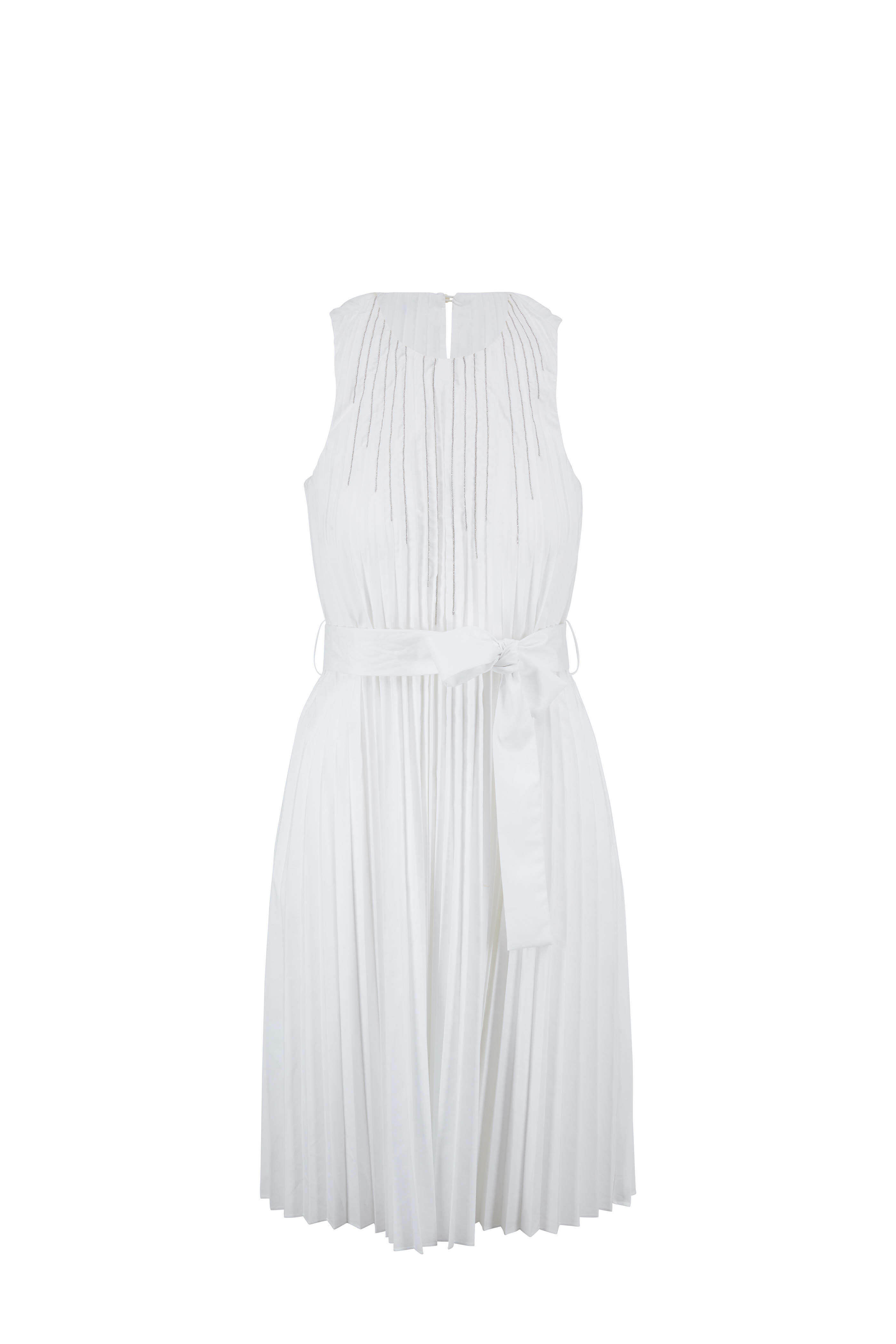 Jewel neckline. Keyhole back; single button closure. Monili striped detail. Nipped in at natural waist, detachable self belt. Plisse skirt. Made in Italy. 65% polyester, 35% cotton; lined. Dry clean.