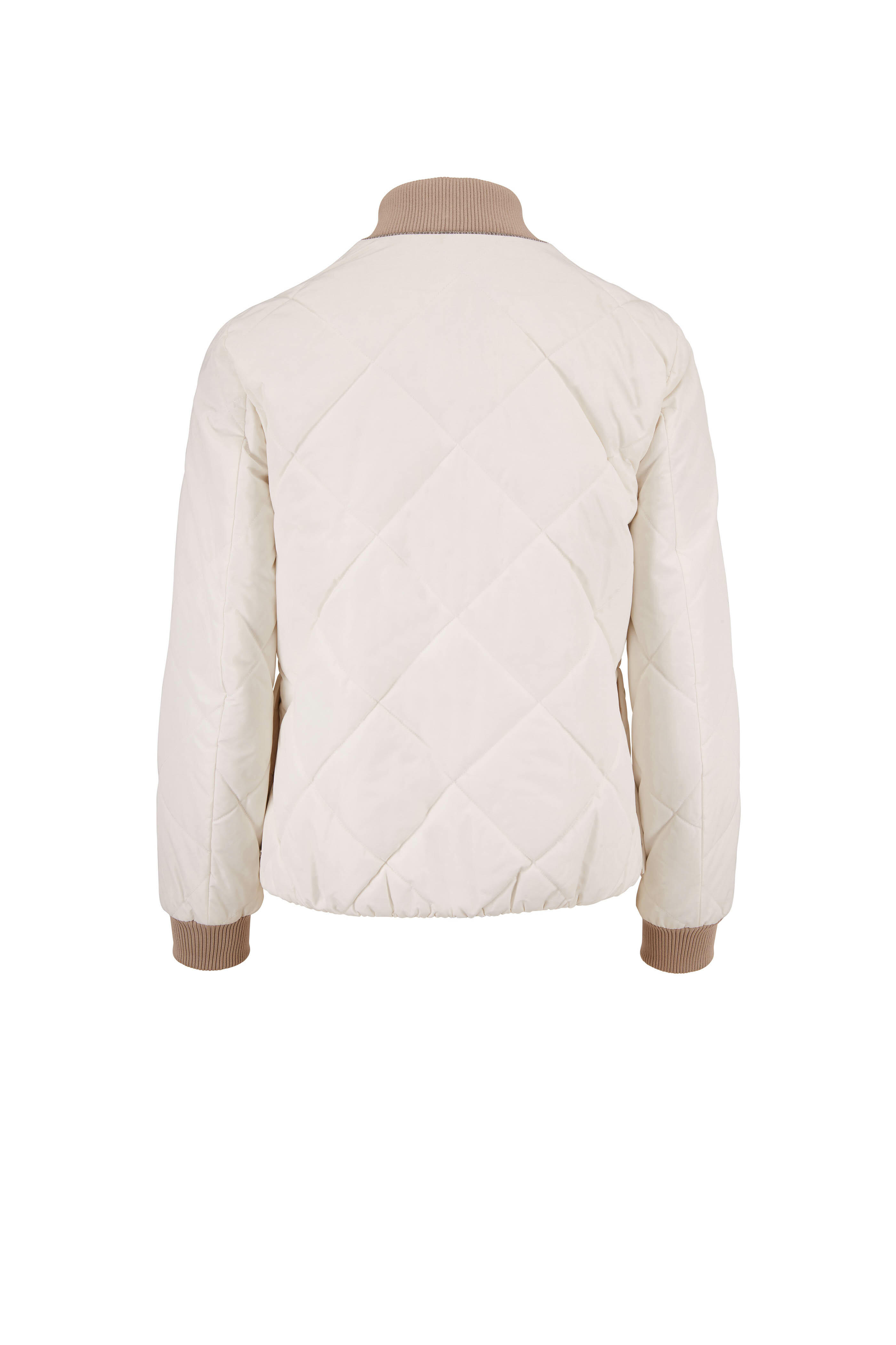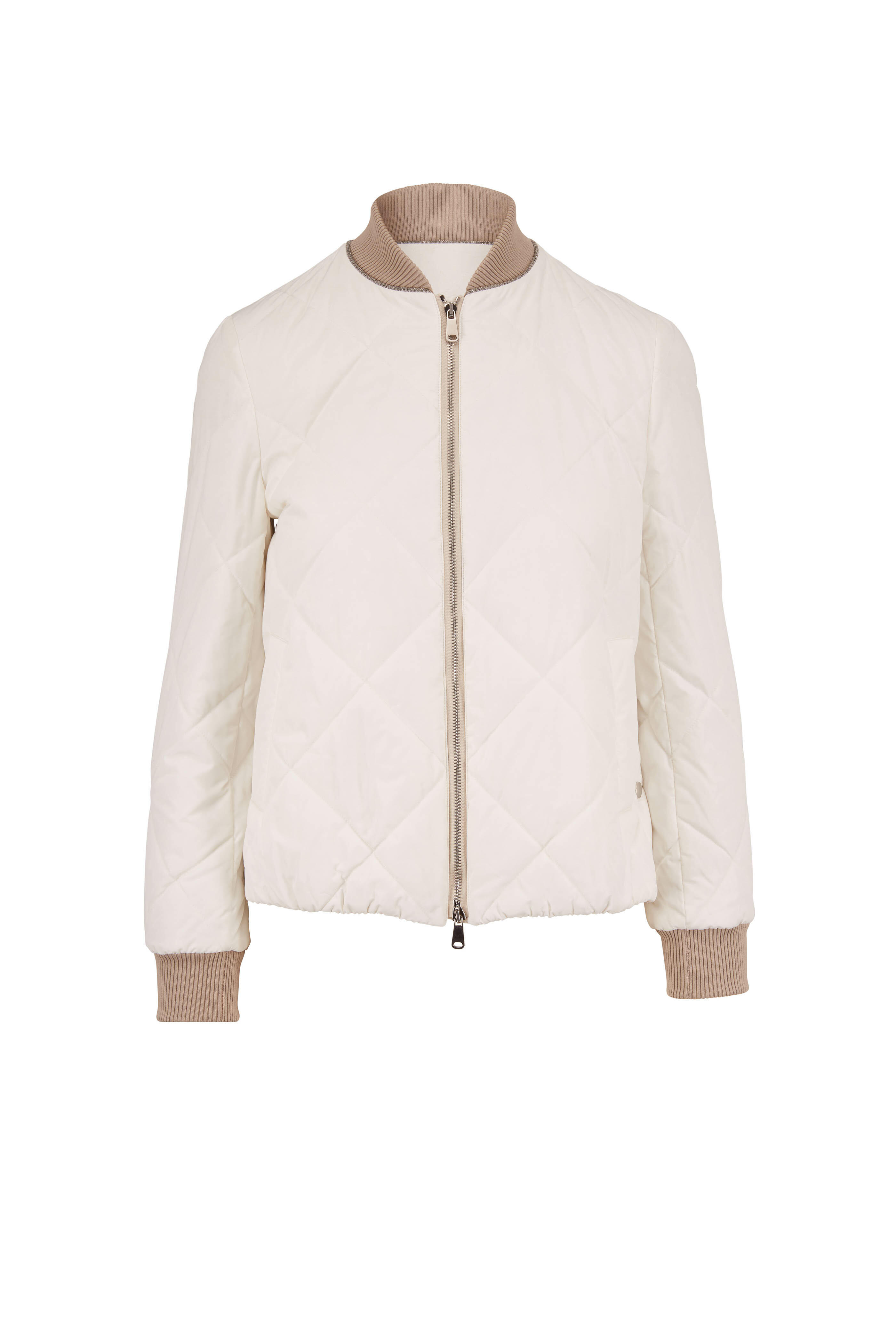 Ribbed baseball collar; monili detailing. Front two-way zip closure. Contrast ribbed cuffs. Lower snap slip pockets. Adjustable snap hem. Made in Italy. 100% polyester; fill: 76% down, 15% polyethylene, 9% feathers. Dry clean.